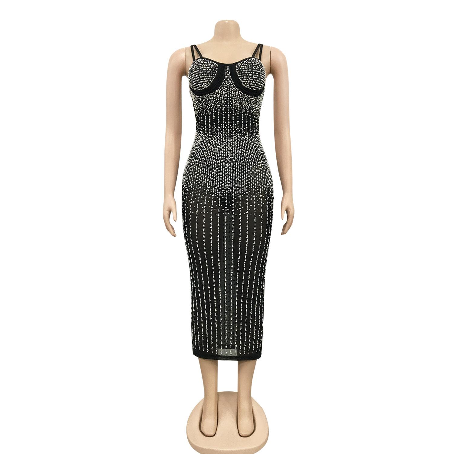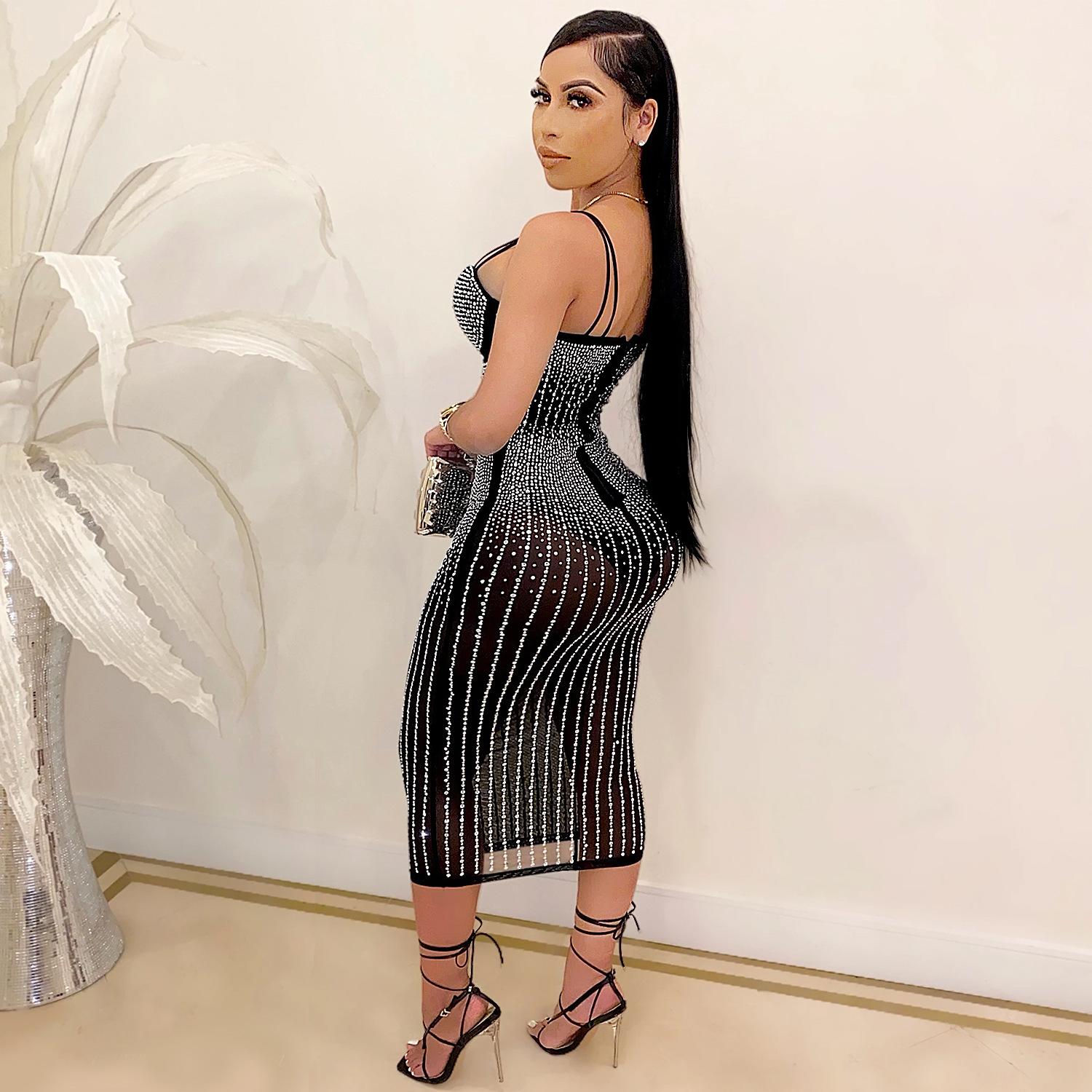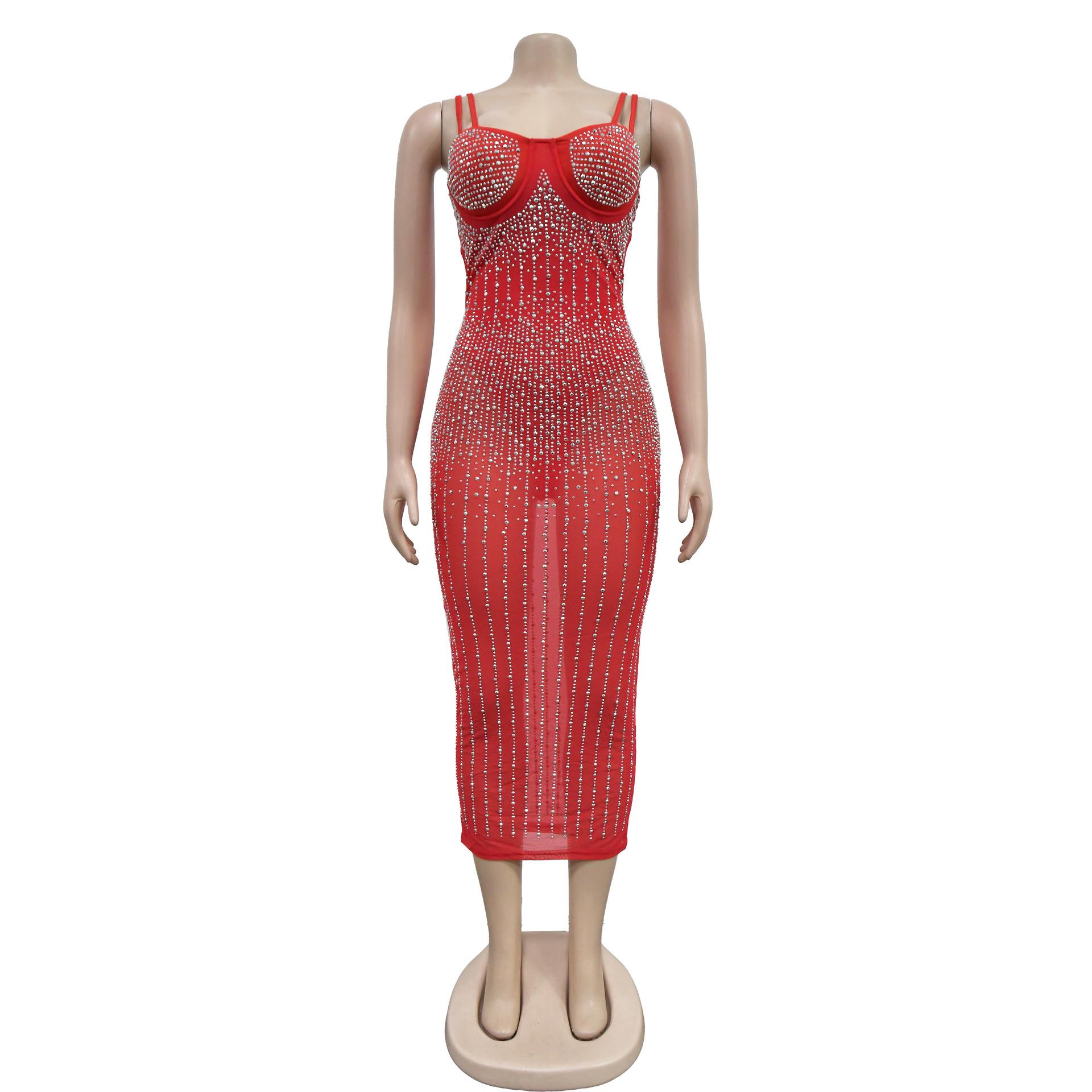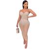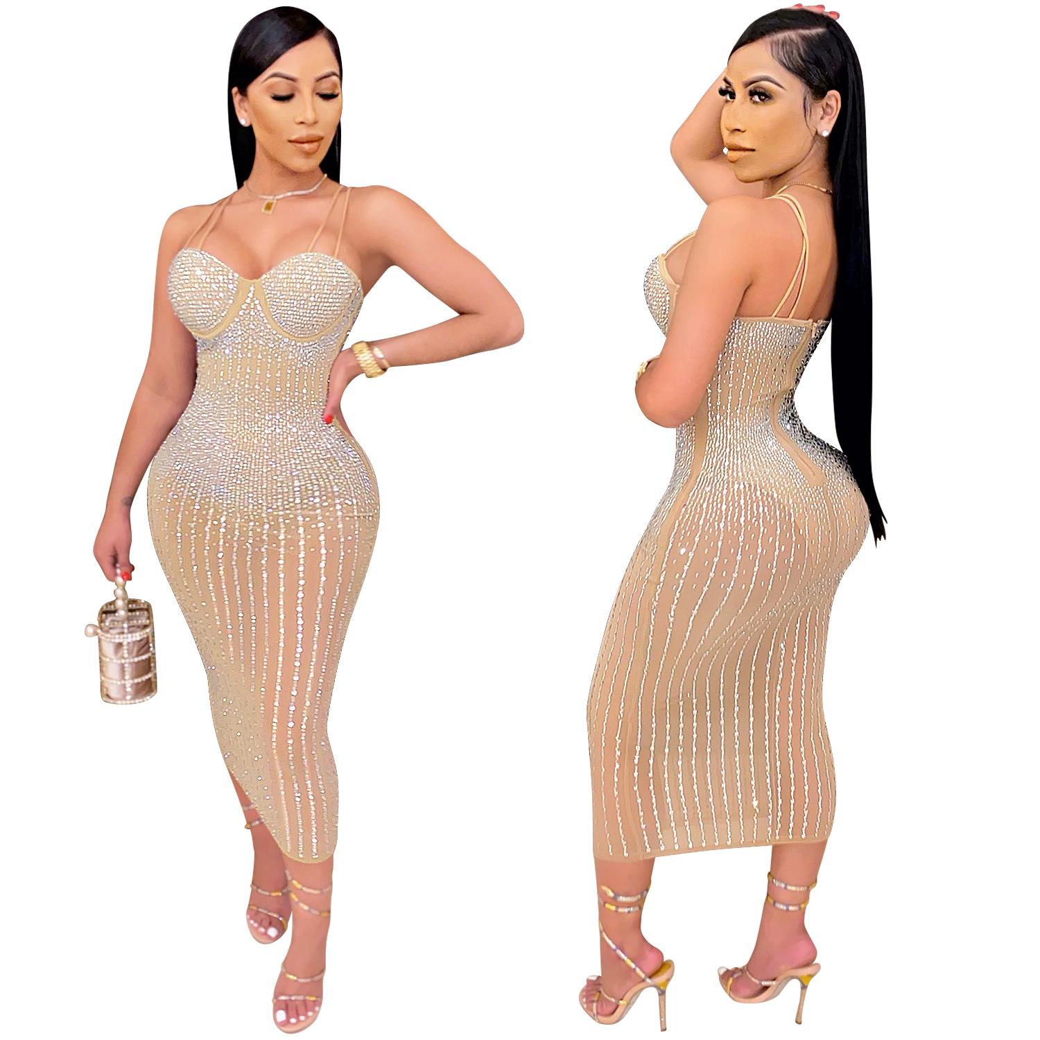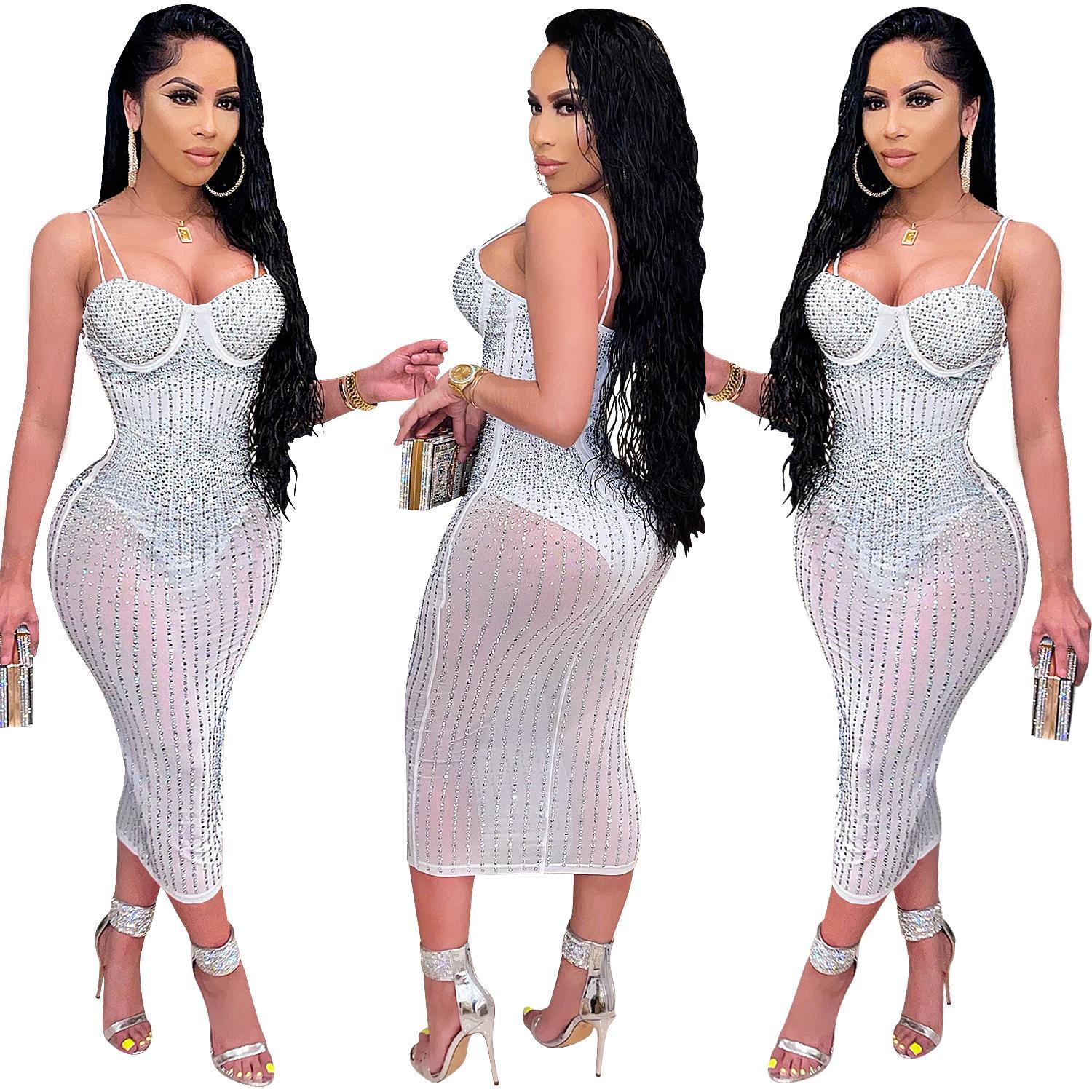 X3805 nuevo transfronterizo moda europea y americana ropa de mujer Fiesta club nocturno malla transparencia pedrería Diamante tirantes vestido