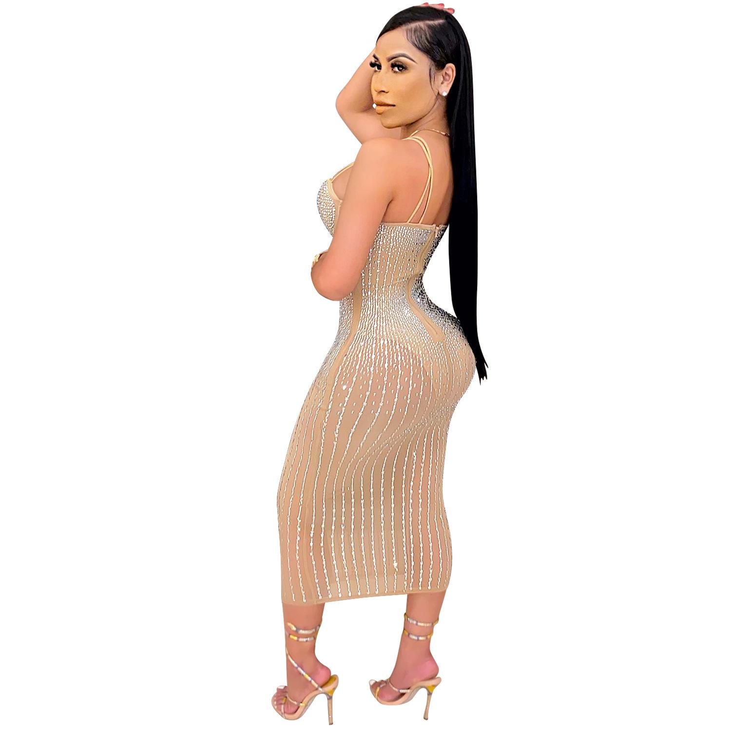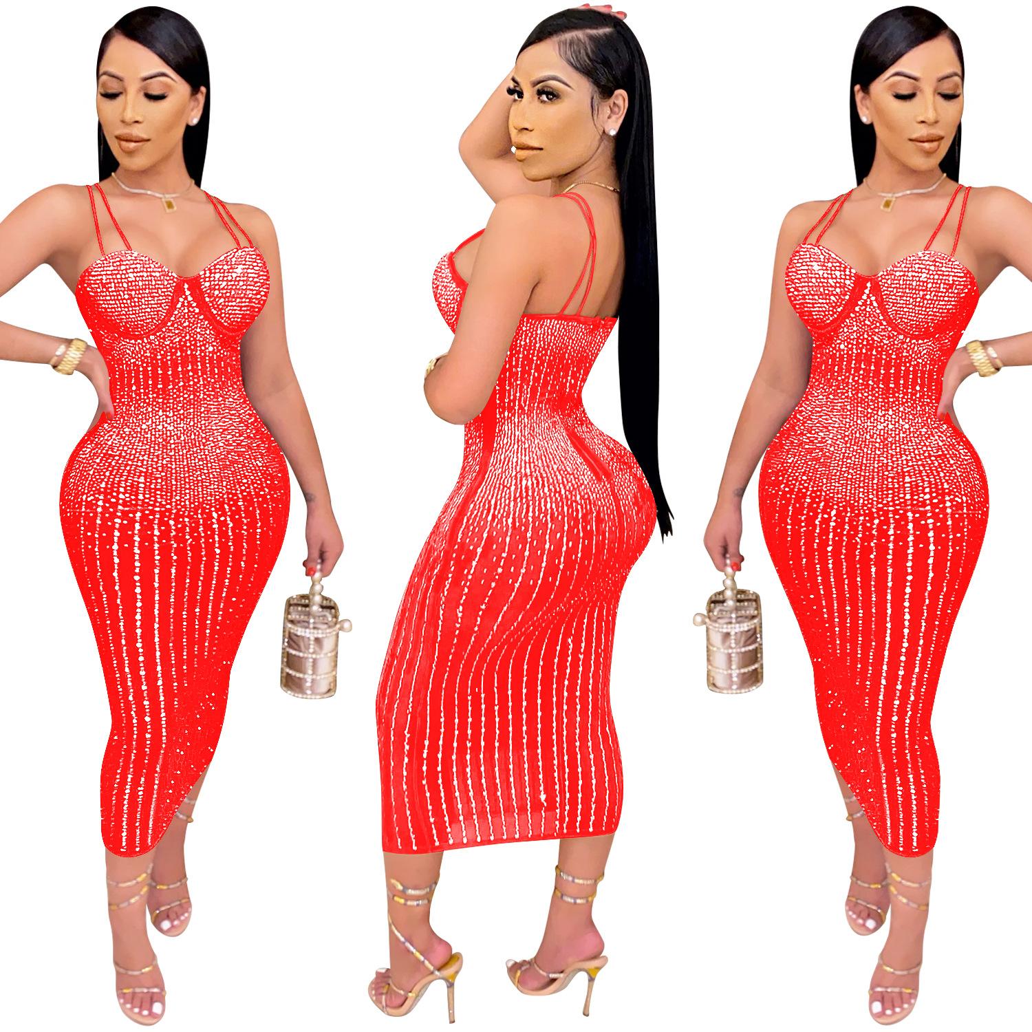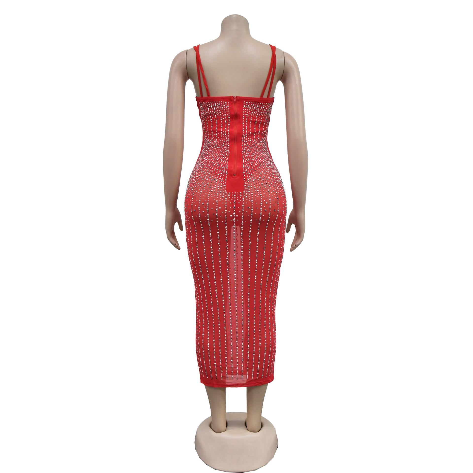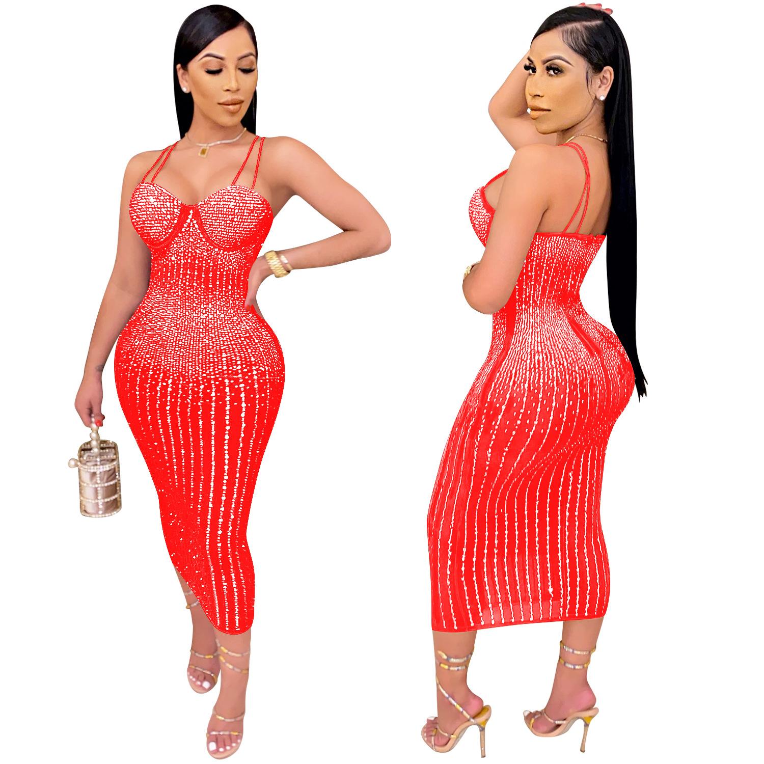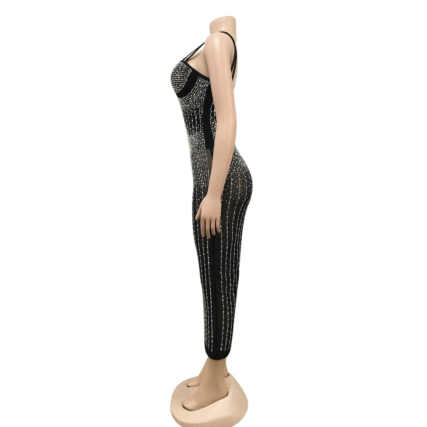 X3805 nuevo transfronterizo moda europea y americana ropa de mujer Fiesta club nocturno malla transparencia pedrería Diamante tirantes vestido