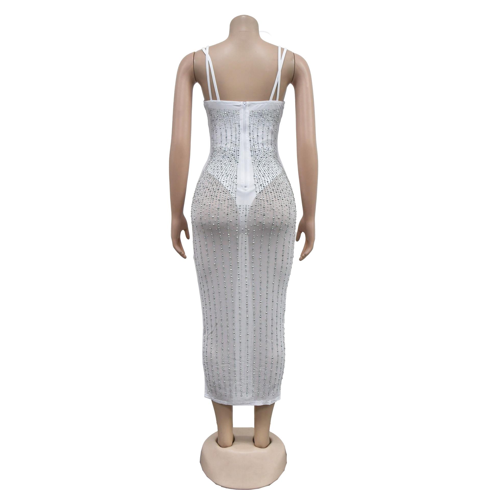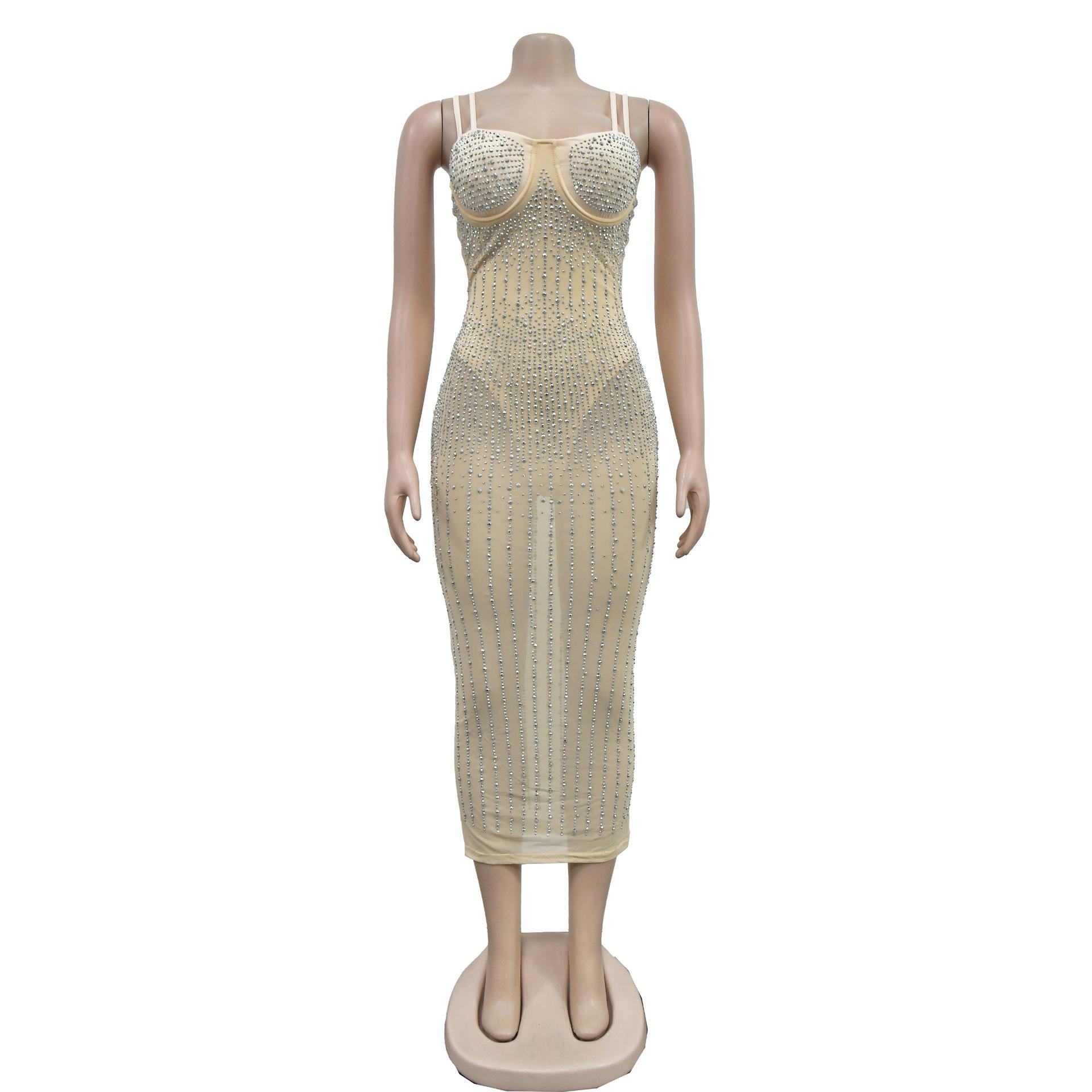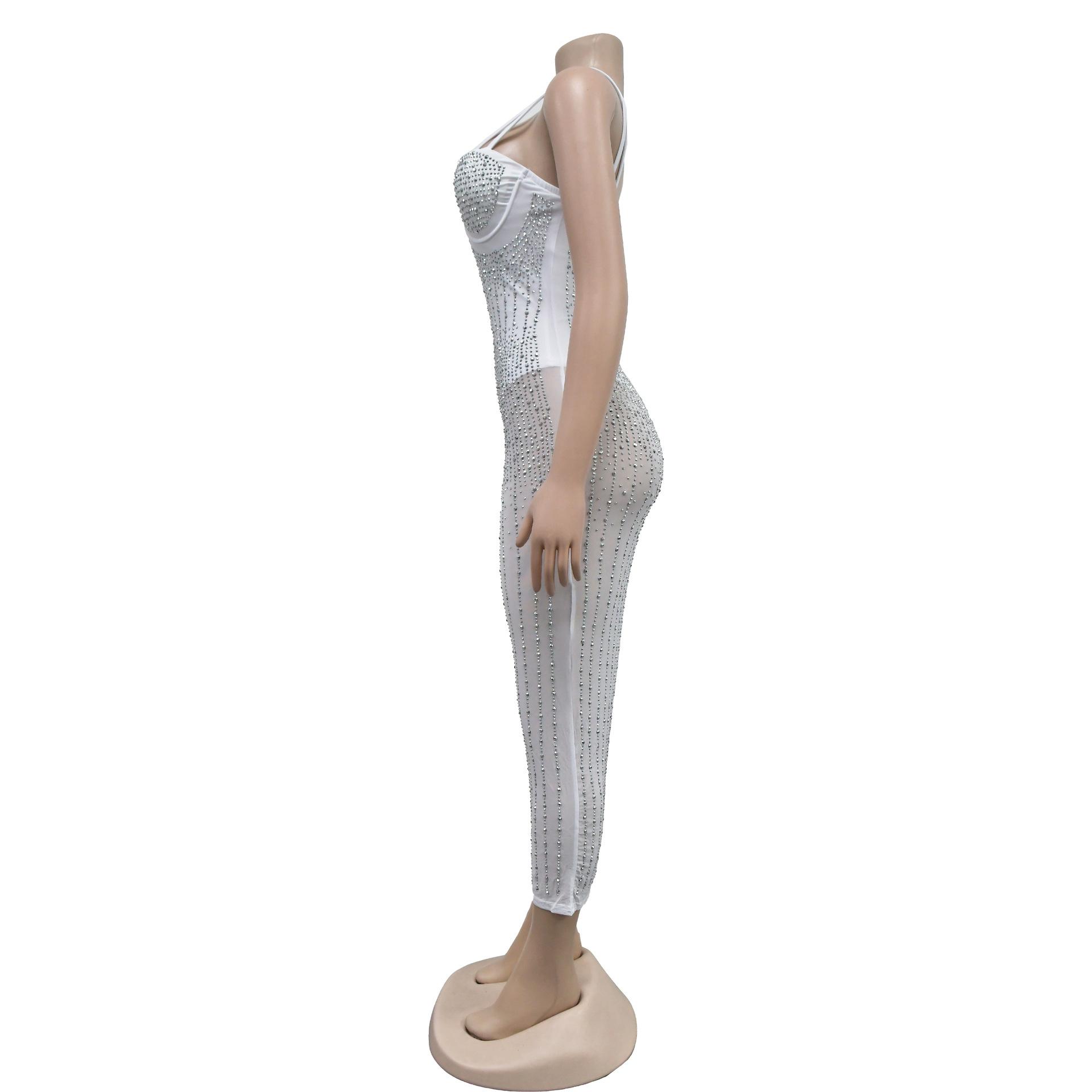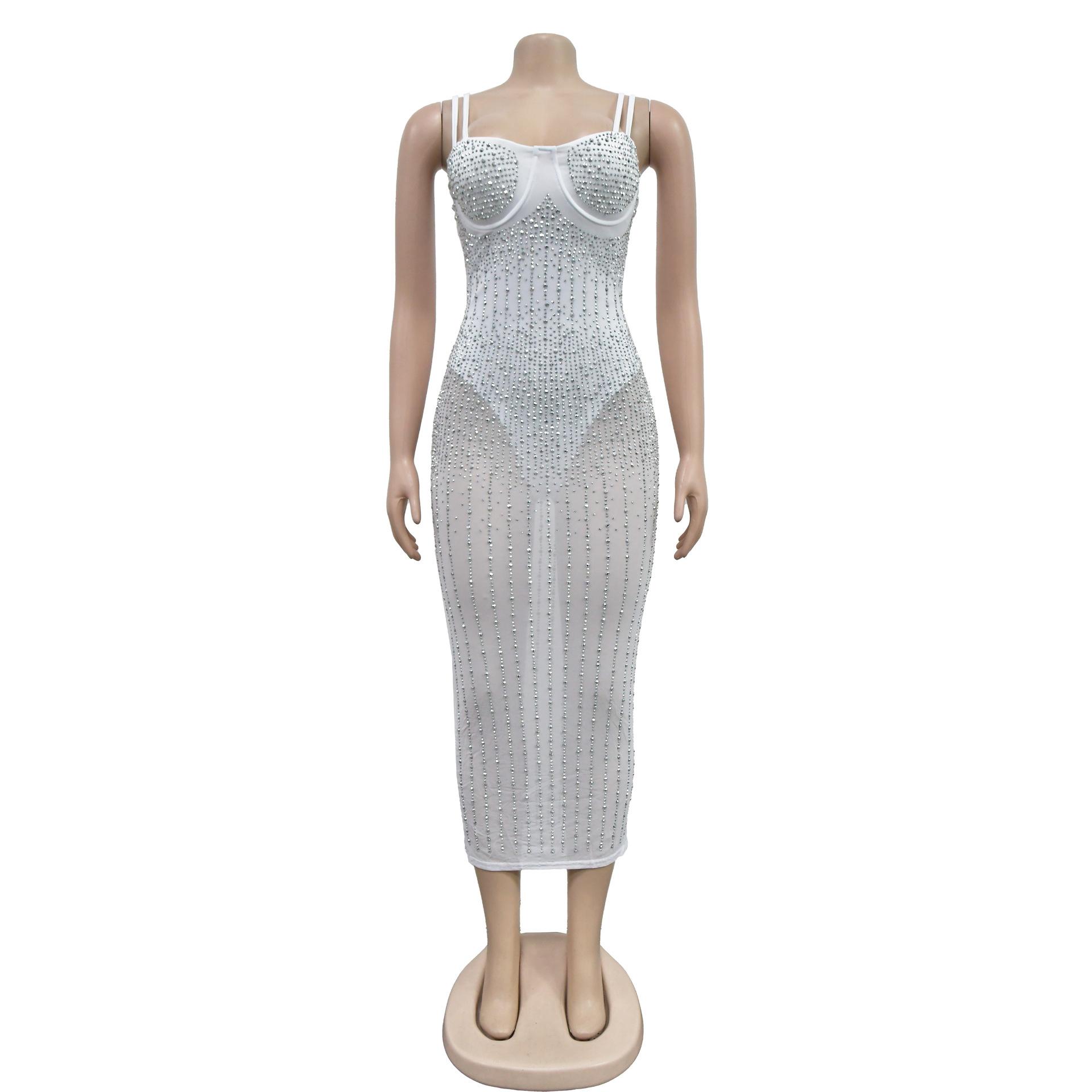 X3805 nuevo transfronterizo moda europea y americana ropa de mujer Fiesta club nocturno malla transparencia pedrería Diamante tirantes vestido