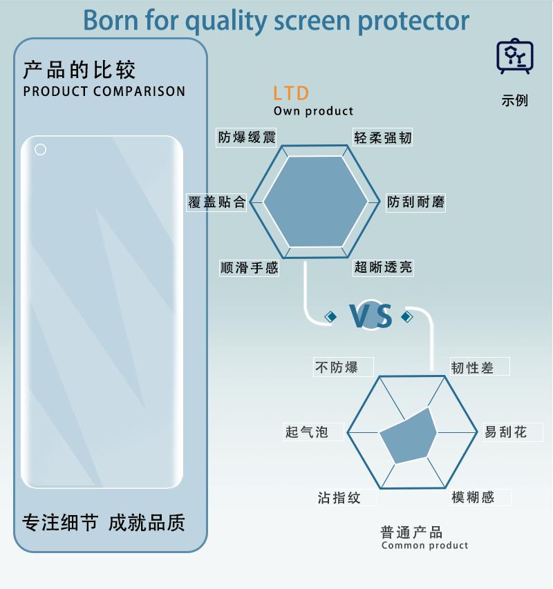 1. Las películas de alta definición, esmeriladas y antideflagrantes están hechas de PET, un material altamente transparente. La película nanoflexible está hecha de TPU.