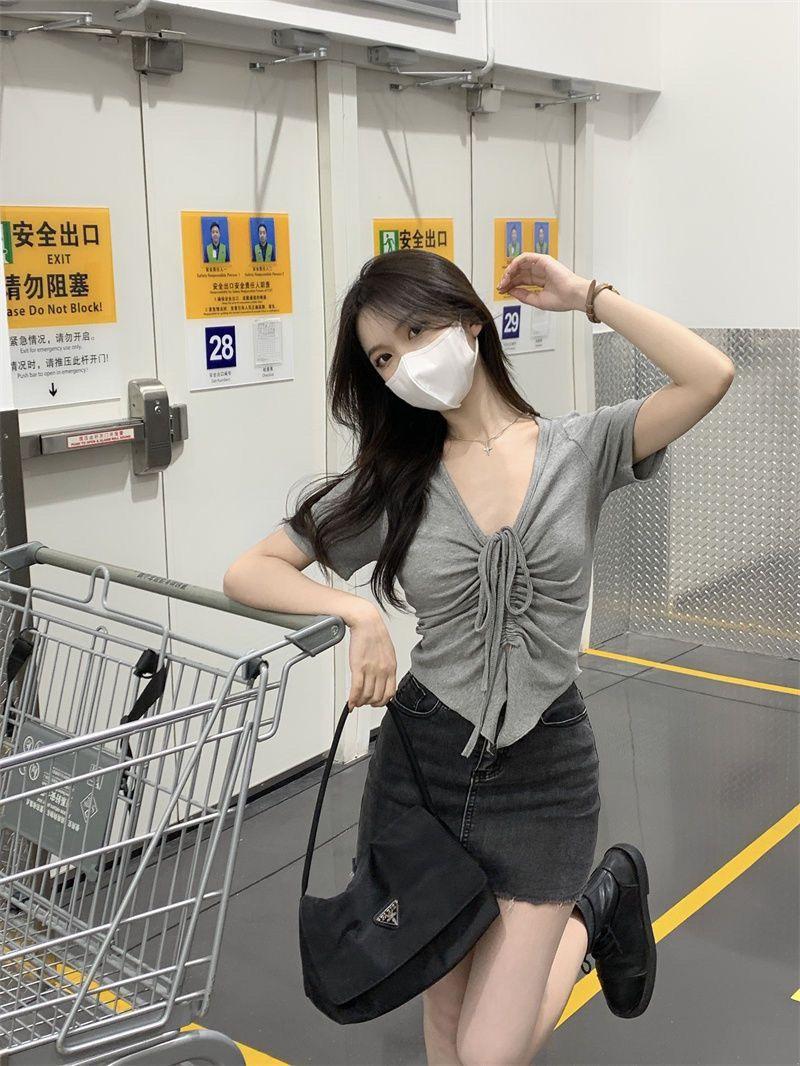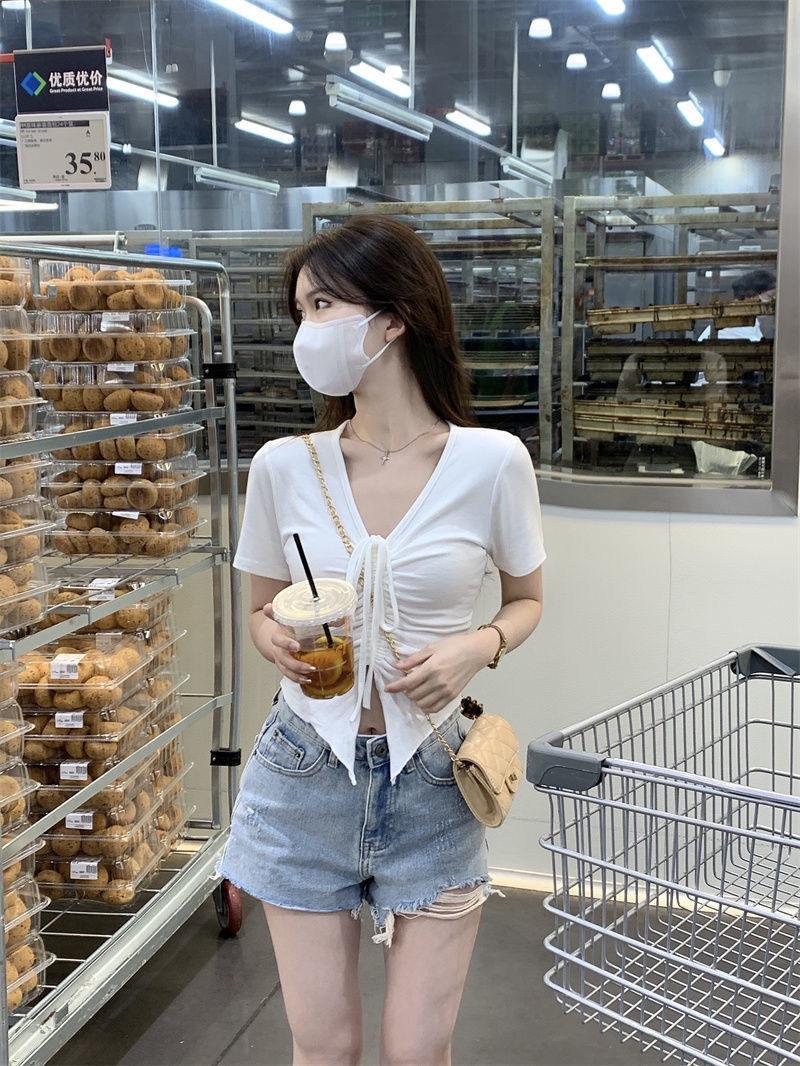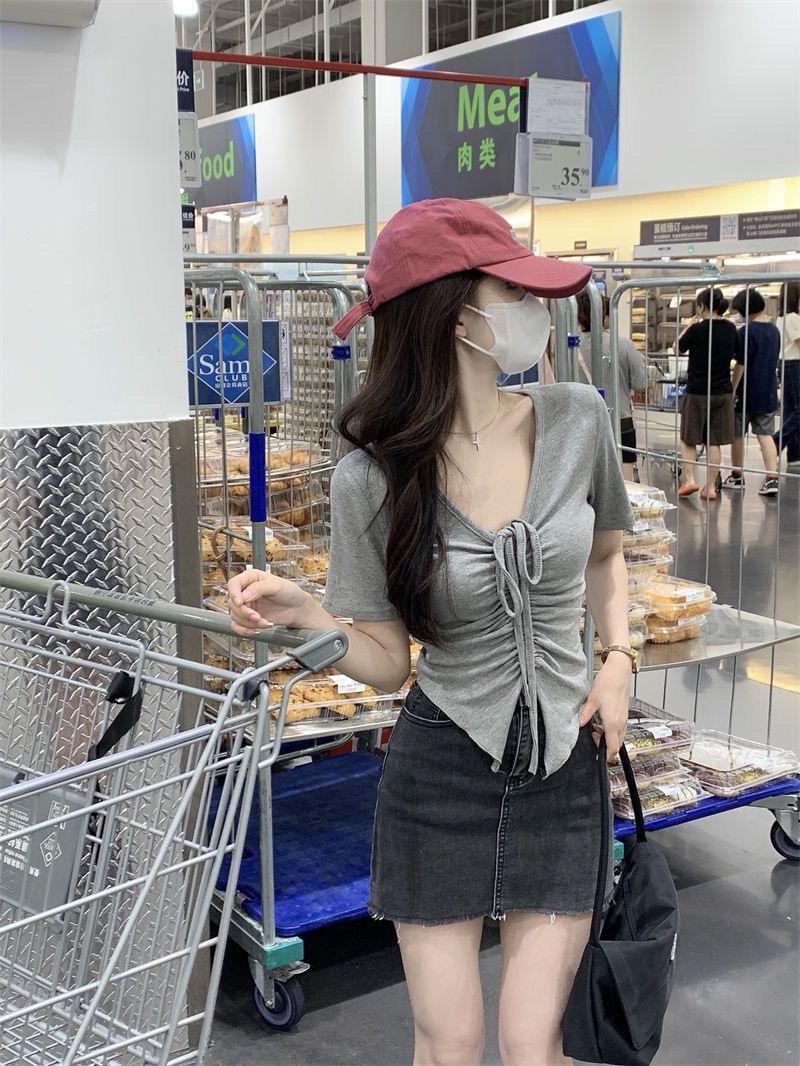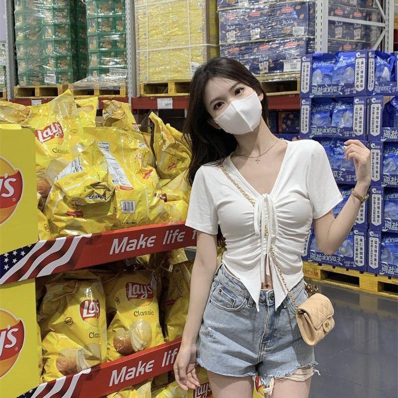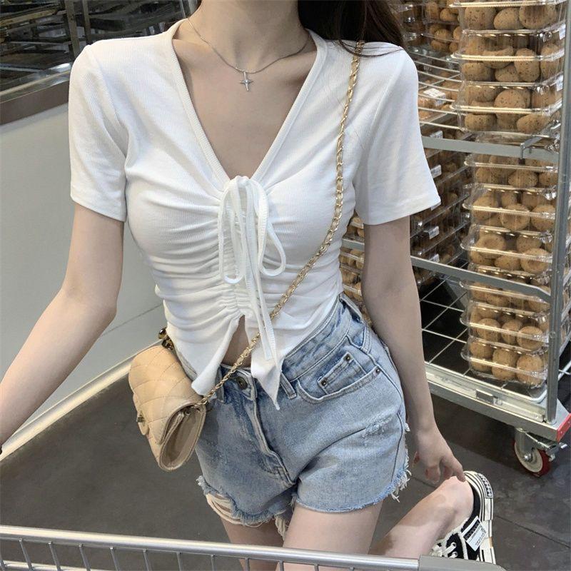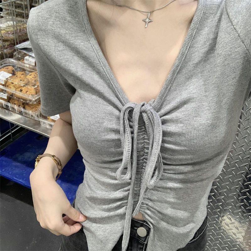 Camiseta corta con abertura y arrugas irregulares para mujer, novedad de verano 2024, cuello en V, hombros descubiertos, manga corta, elegante, estilo nicho.