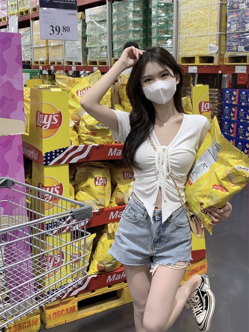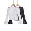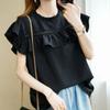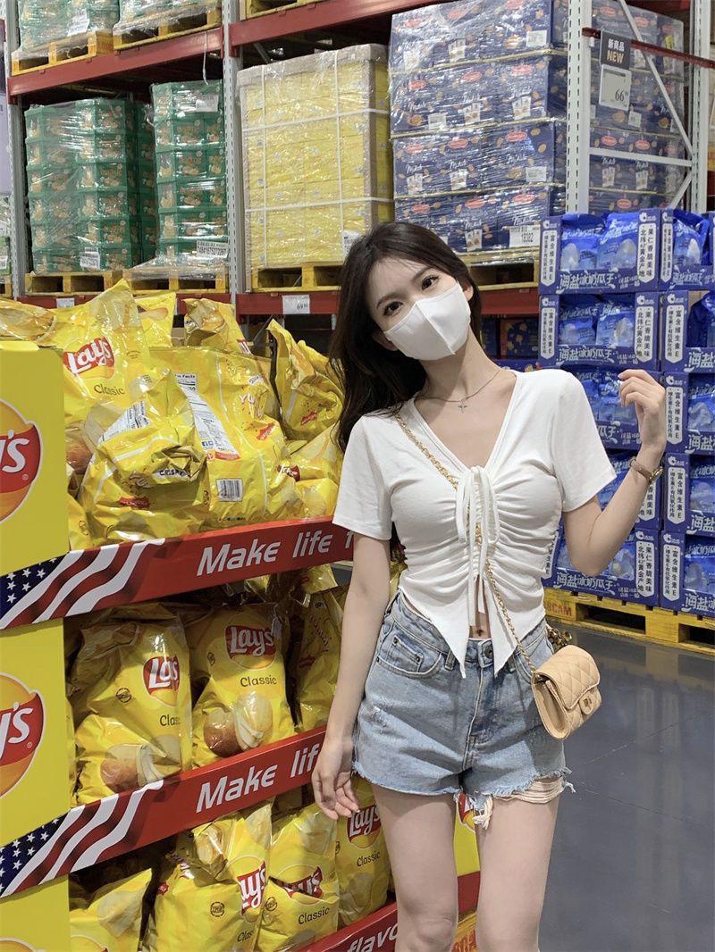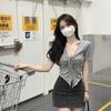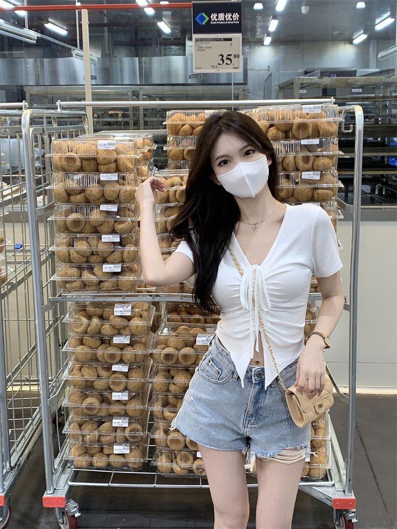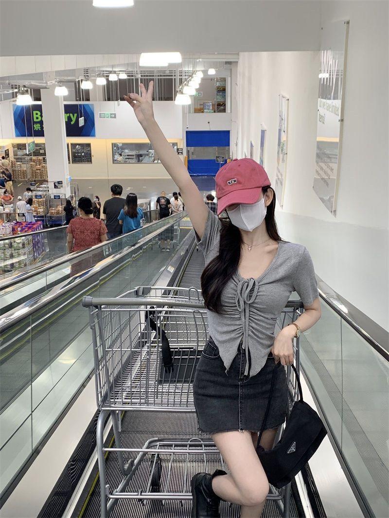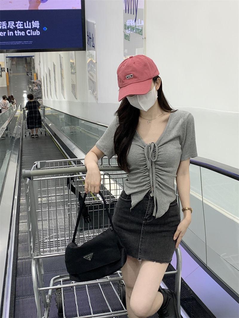 Camiseta corta con abertura y arrugas irregulares para mujer, novedad de verano 2024, cuello en V, hombros descubiertos, manga corta, elegante, estilo nicho.