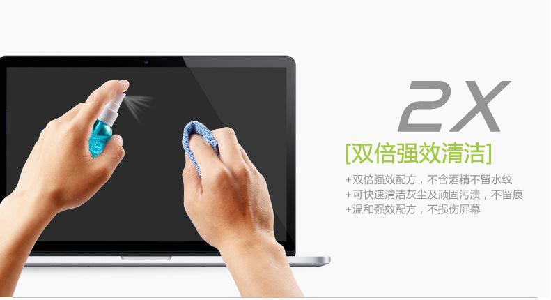 Doble el borde del paño hacia adentro y limpie suavemente desde el centro de la pantalla LCD hacia afuera. Sin embargo, para manchas difíciles, agite el detergente uniformemente, rocíelo directamente sobre la superficie de la computadora portátil, pantalla LCD o TV LCD a unos 20-30 cm de distancia y límpiela suavemente. También puede rociar el detergente directamente sobre la superficie del paño y luego limpiar la pantalla; quedará como nueva.