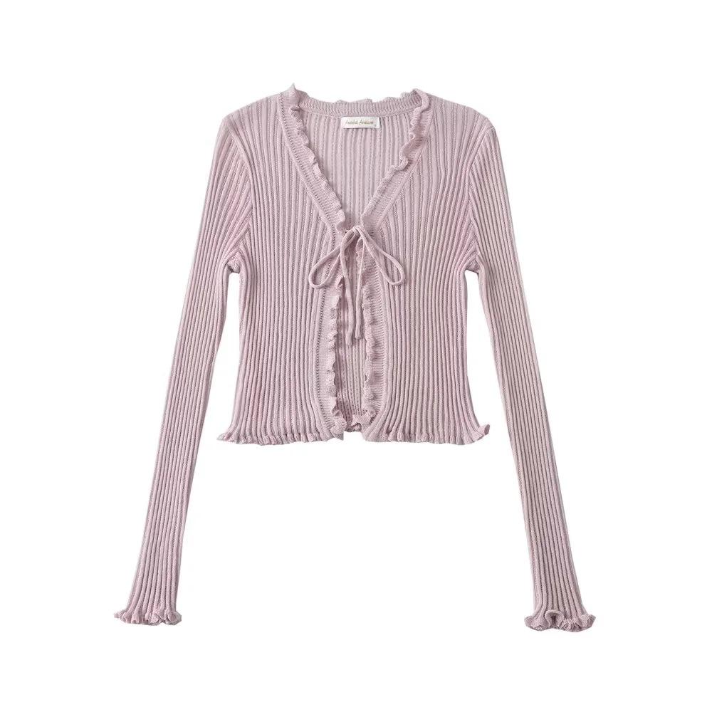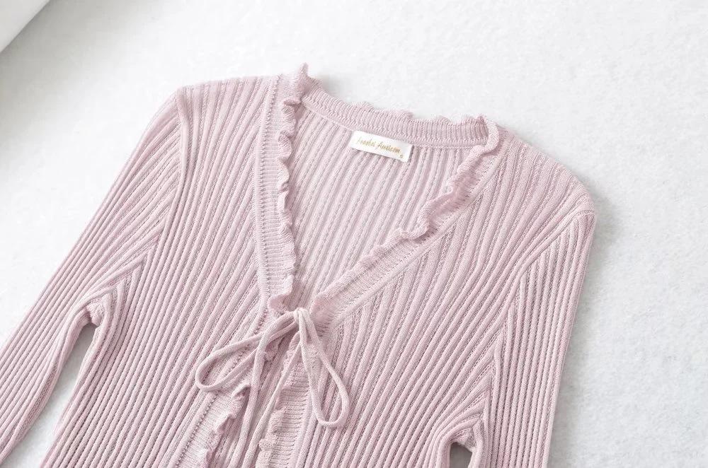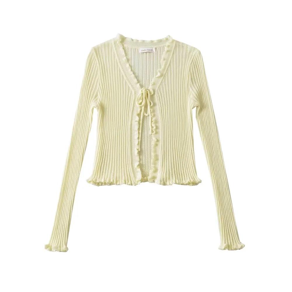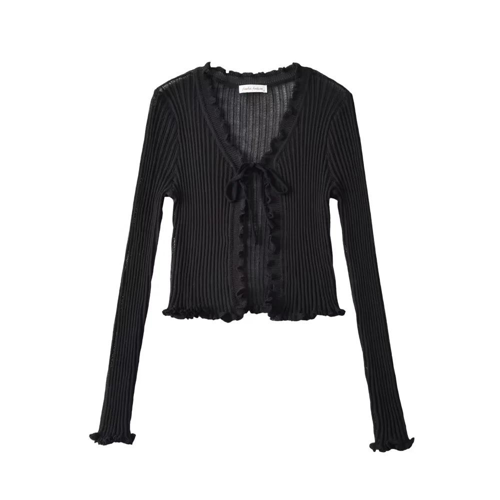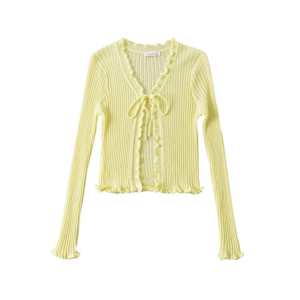 Cárdigan de punto fino con cordones de estilo europeo y americano de verano para mujer, dulce niña, cuello en V, manga larga, camiseta exterior de protección solar para mujer