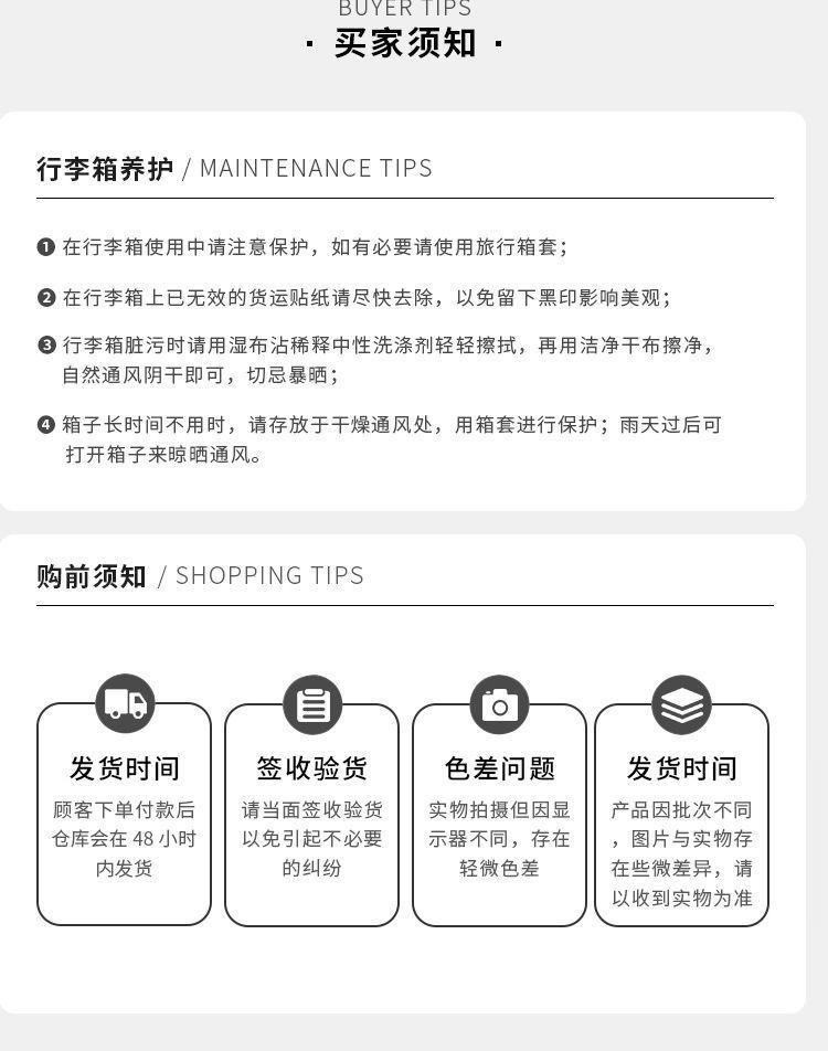 3. Acerca de los accesorios: Todas las cajas de 20 pulgadas no incluyen asas ni patas laterales. Debido a los diferentes lotes de producción, algunos accesorios pueden variar (entre otros: ruedas, cremalleras, estructura interna, tiradores, asas, cerraduras y forro). Si le importa, tenga cuidado al comprar y pregunte con claridad al comunicarse.