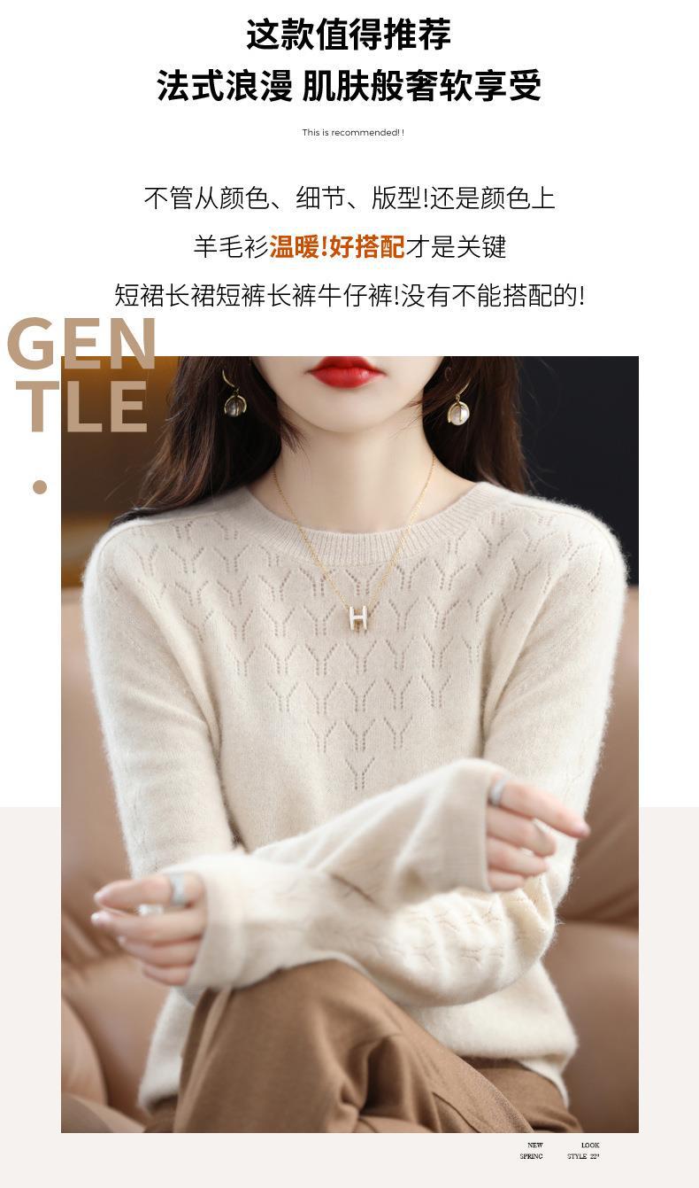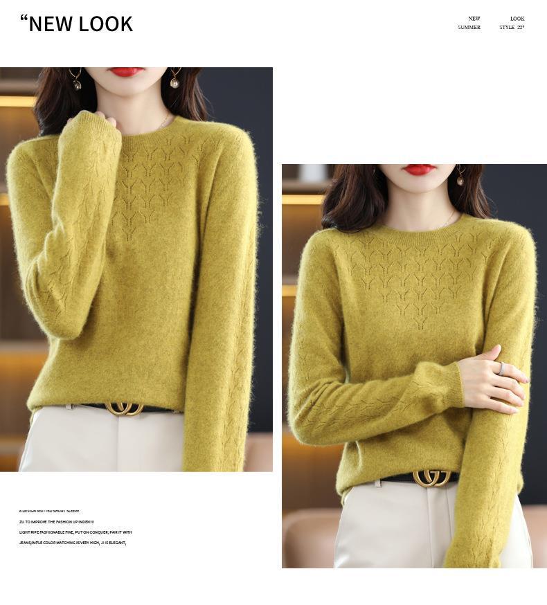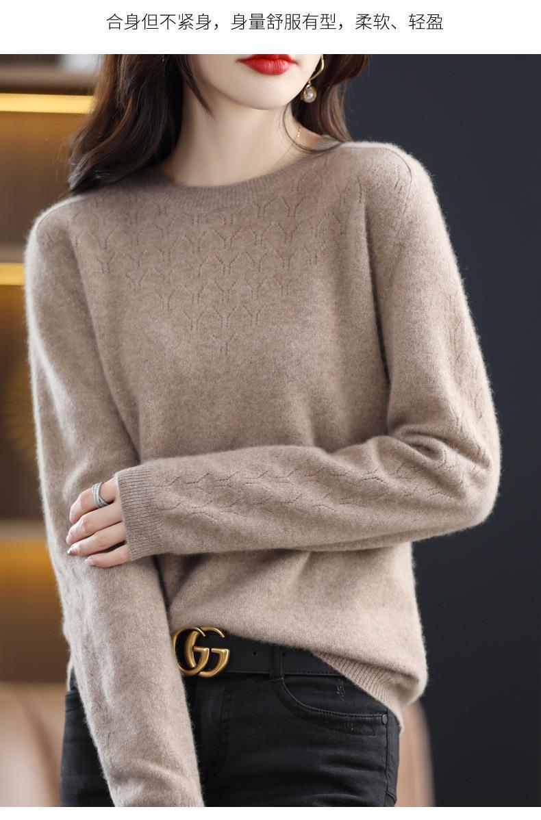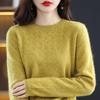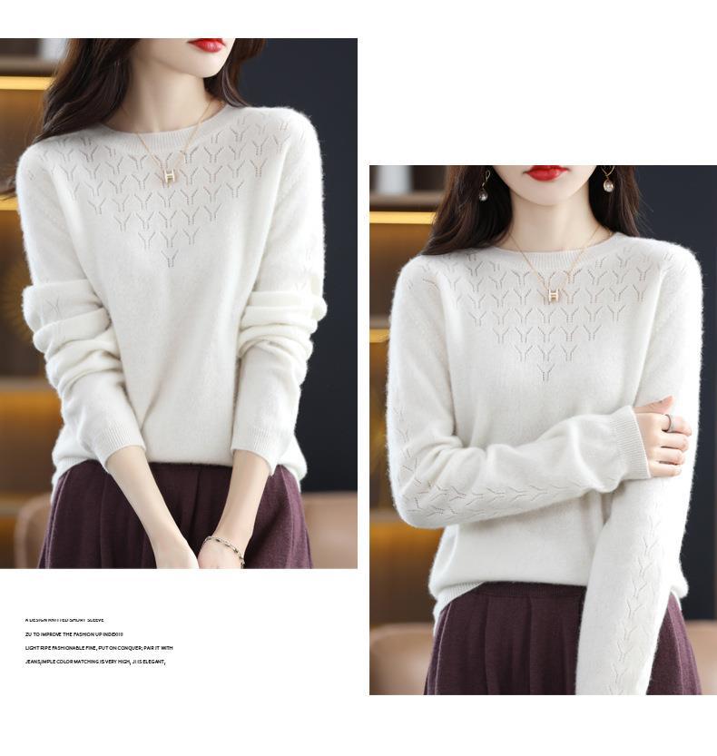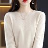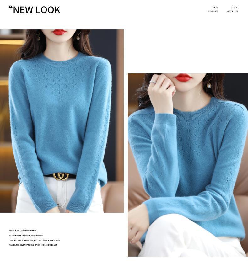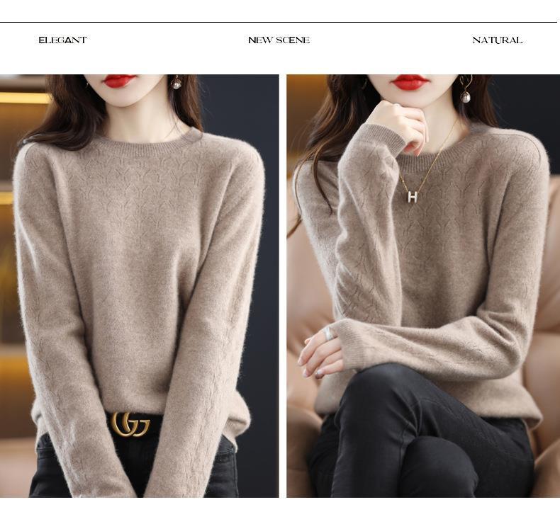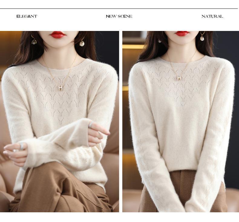 Suéter de lana 100% para mujer, cuello redondo, otoño e invierno, nuevo suéter de punto hueco, jersey holgado, camisa de cachemira de manga larga.