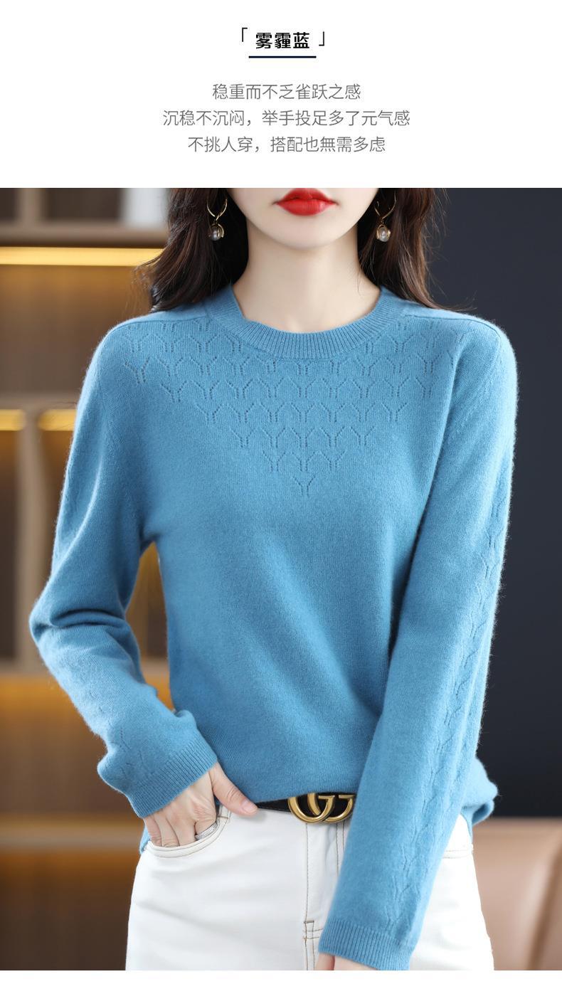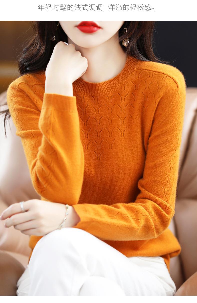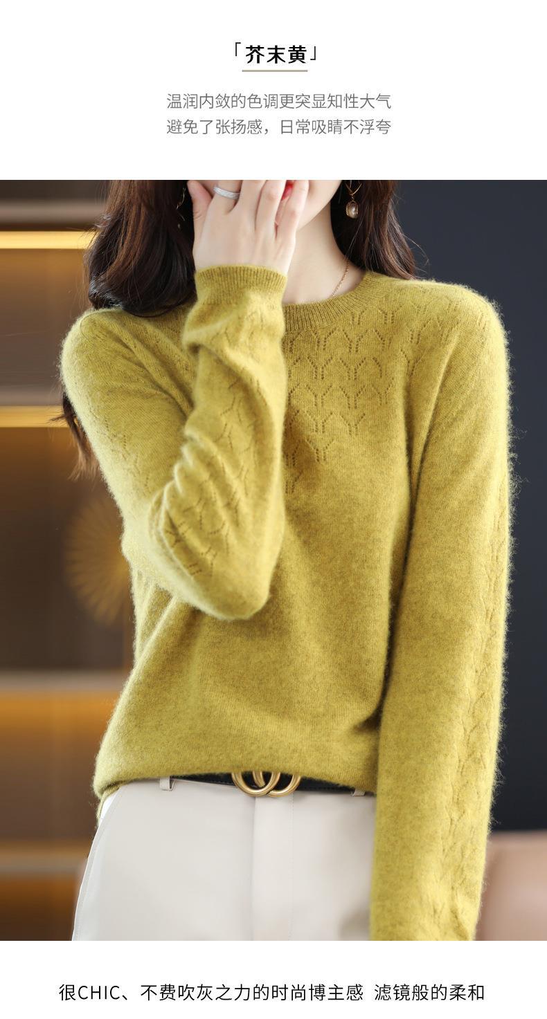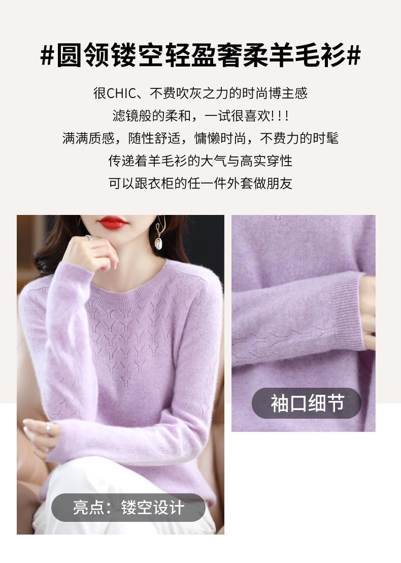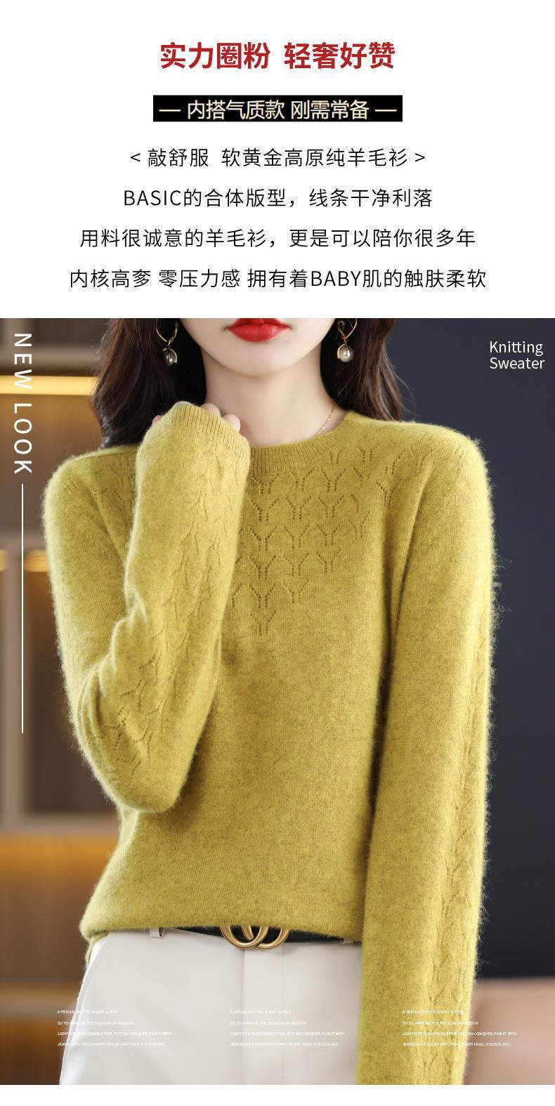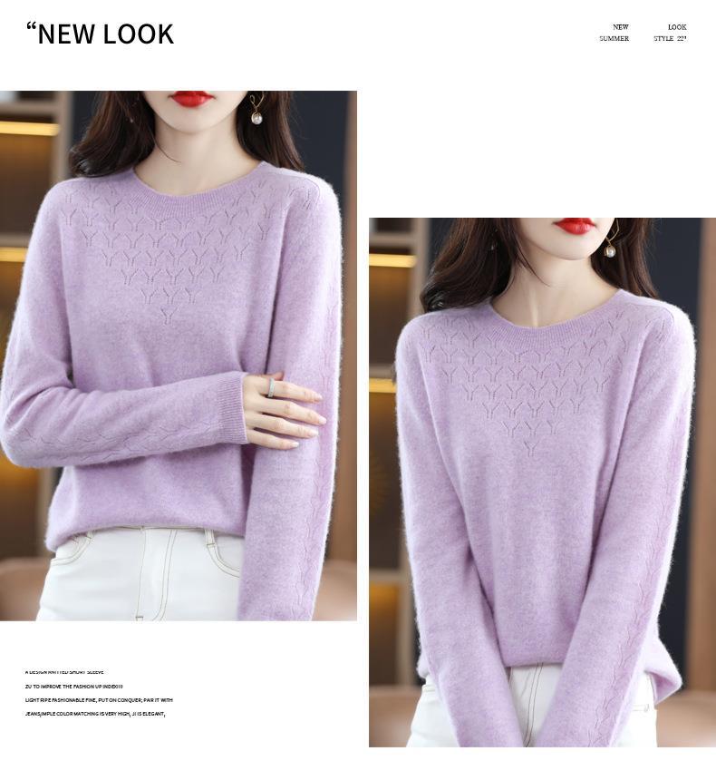 Suéter de lana 100% para mujer, cuello redondo, otoño e invierno, nuevo suéter de punto hueco, jersey holgado, camisa de cachemira de manga larga.