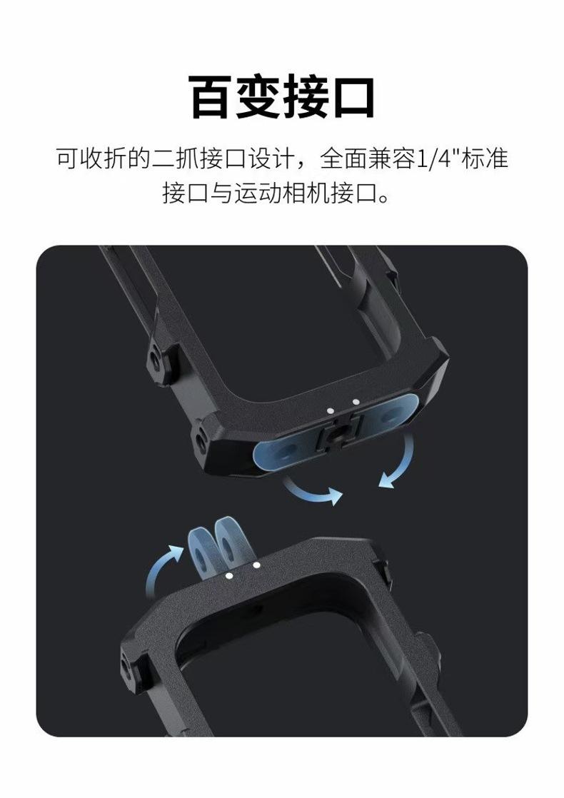 Características del producto: Hecho de aleación de aluminio, a prueba de golpes y caídas, altamente efectivo para proteger la cámara, tecnología ultradelgada, apariencia exquisita, mejor disipación del calor, se ajusta al cuerpo, control exquisito de la posición de los orificios,El diseño de la ventana es práctico y conveniente, con puerto de carga USB rápido, fácil desmontaje y operación, interfaz de zapata fría de expansión dual en el marco, admite disparo horizontal y vertical, compatible con interfaz estándar de 1/4 e interfaz de cámara deportiva, puede instalar luces de relleno duales y micrófonos al mismo tiempo