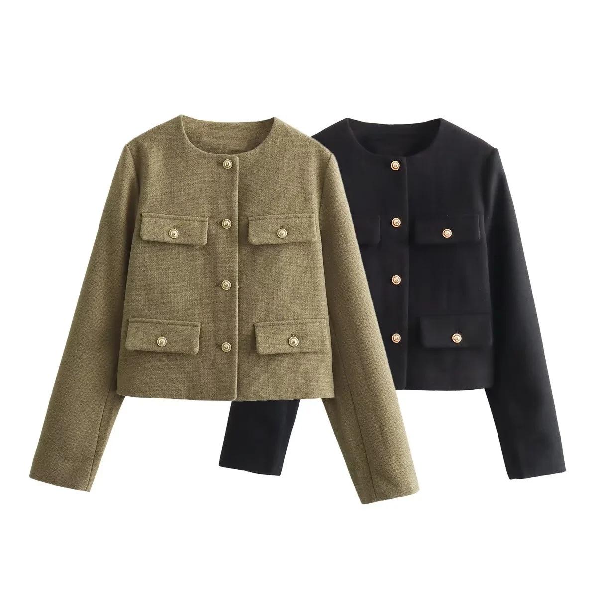Ropa de mujer europea y americana 2023 otoño nuevo moda callejera solapa decorativa corta cuello redondo botonadura sencilla chaqueta de traje