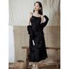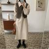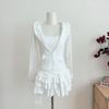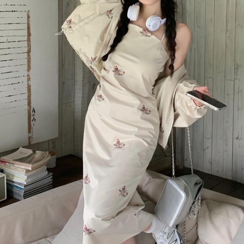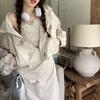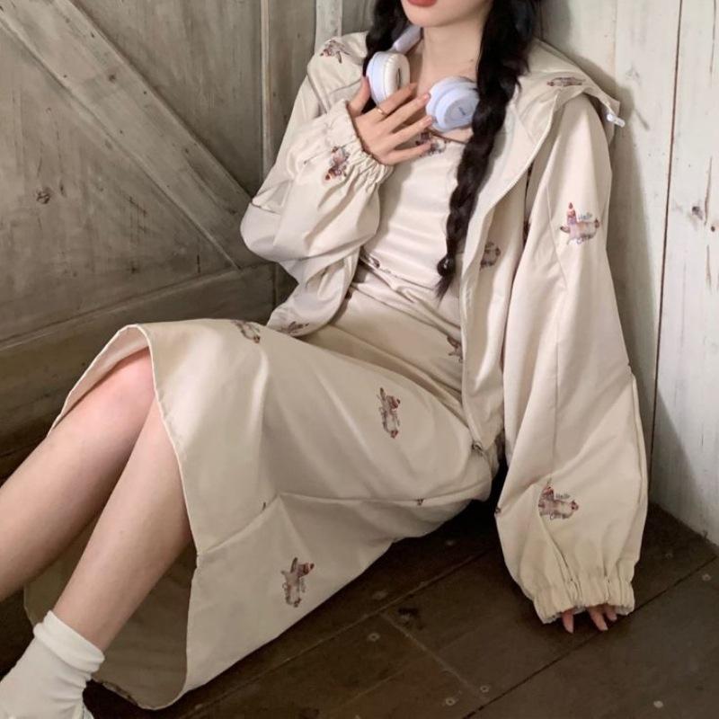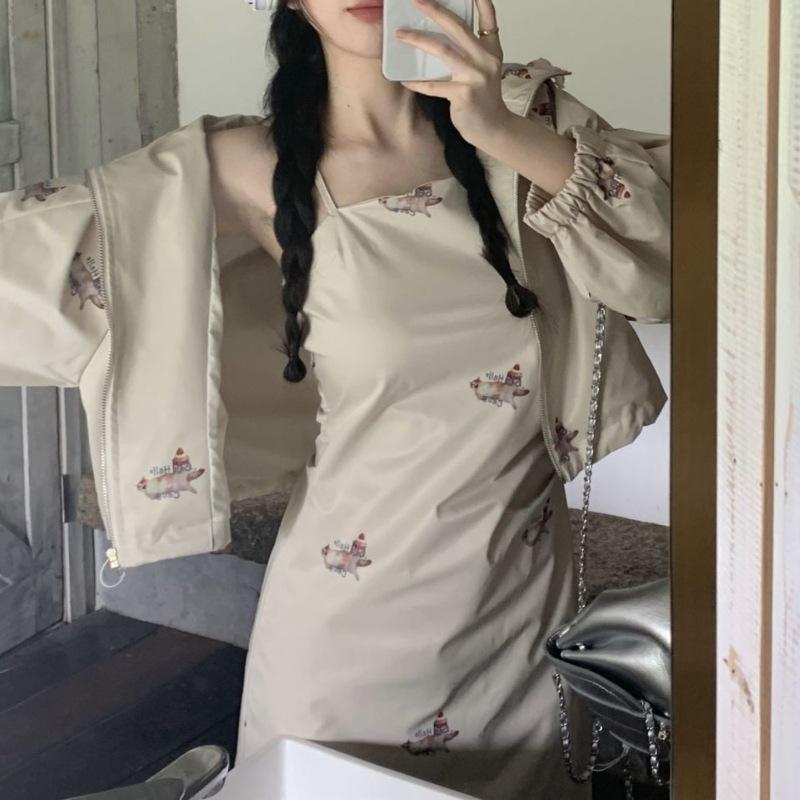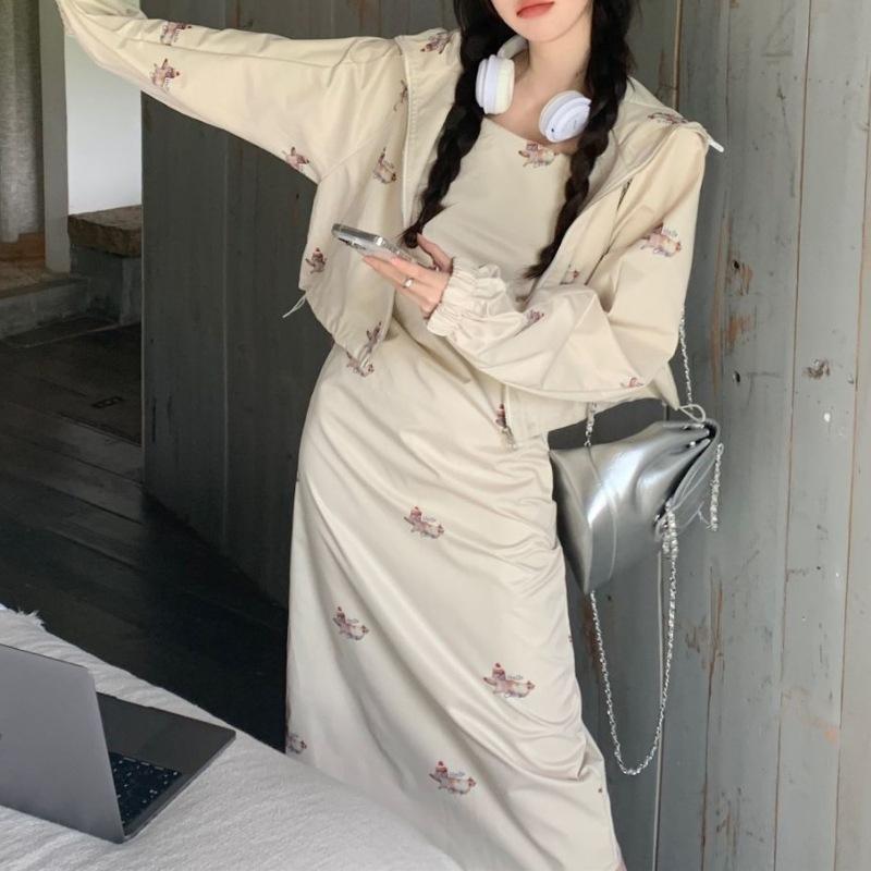 Dulce y Picante Hermana ~ Vestido Cintura Diseño Retro a la Moda + Chaqueta con Capucha y Cremallera Set de Dos Piezas para Mujer