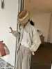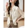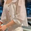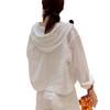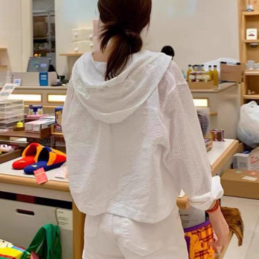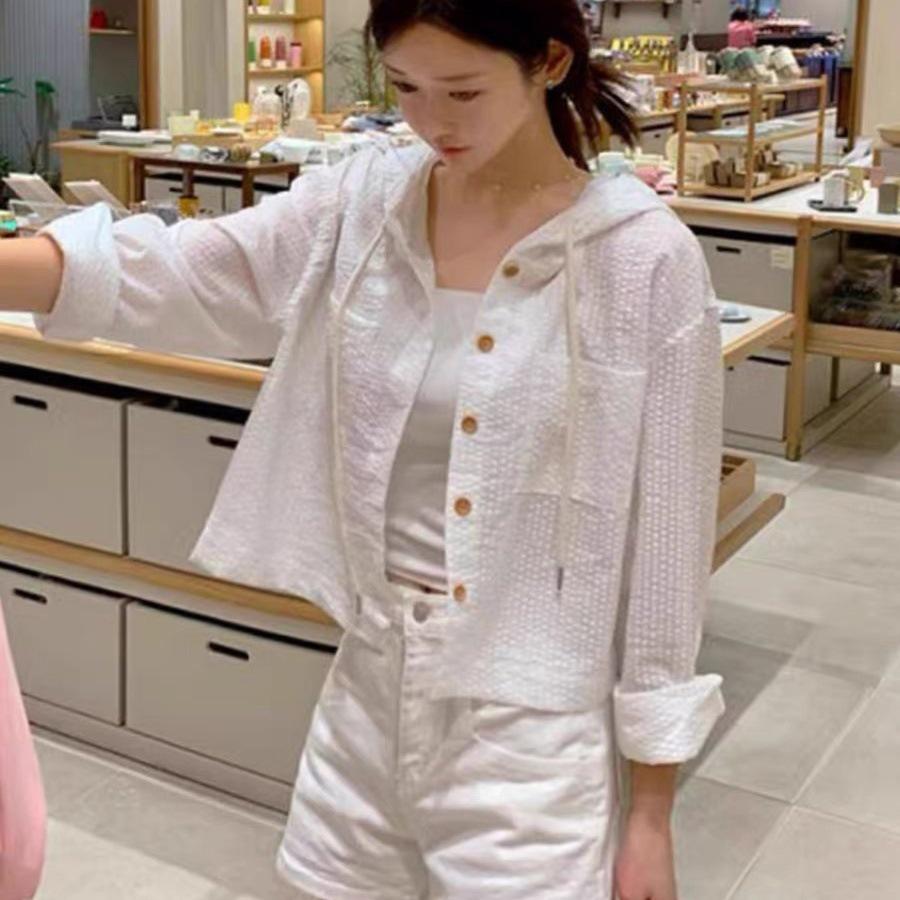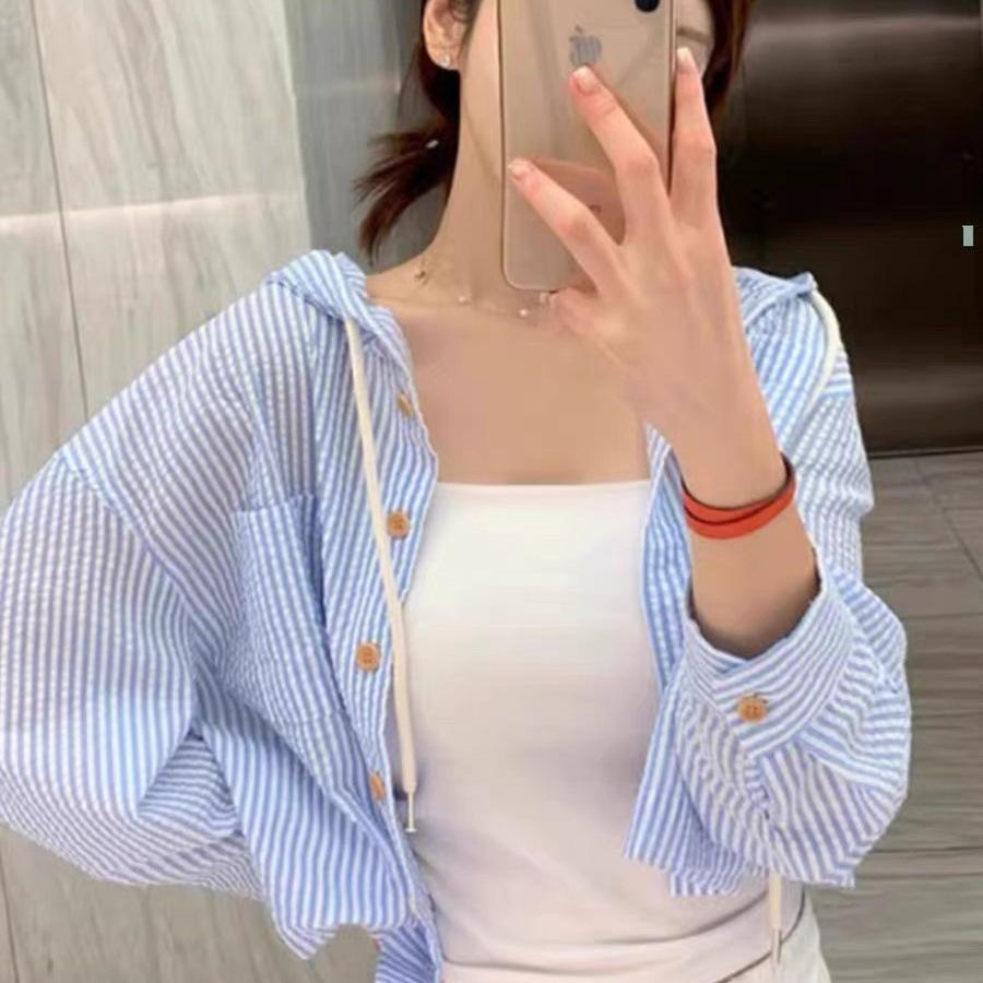 Camisa elegante de verano 2024, nueva llegada, combinable con todo, de una sola fila, a rayas, de color contrastante, corta, holgada, de manga larga, con capucha y protector solar