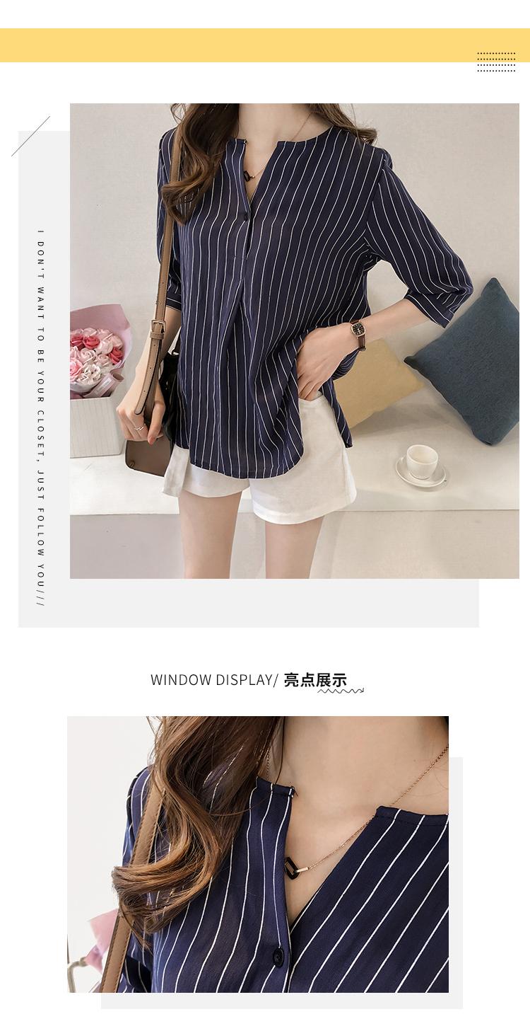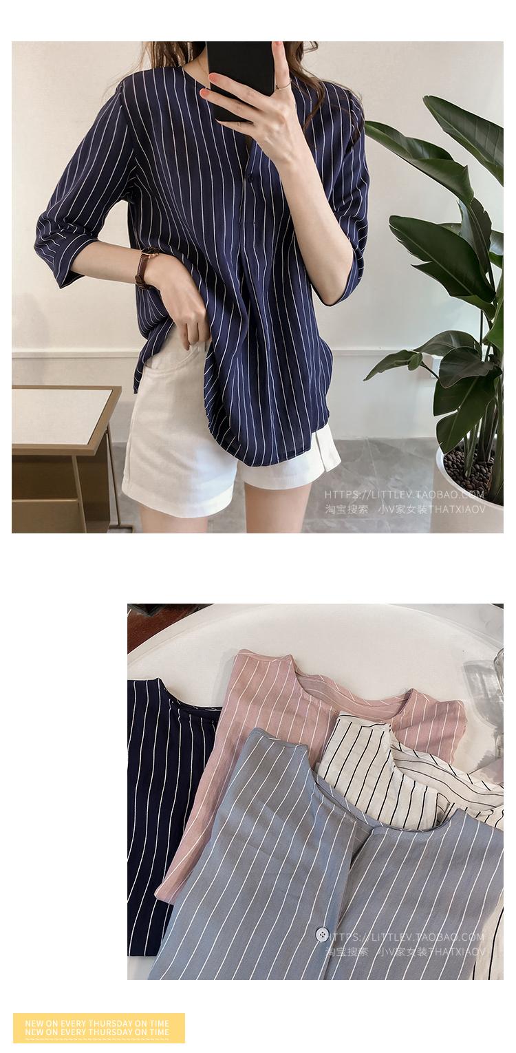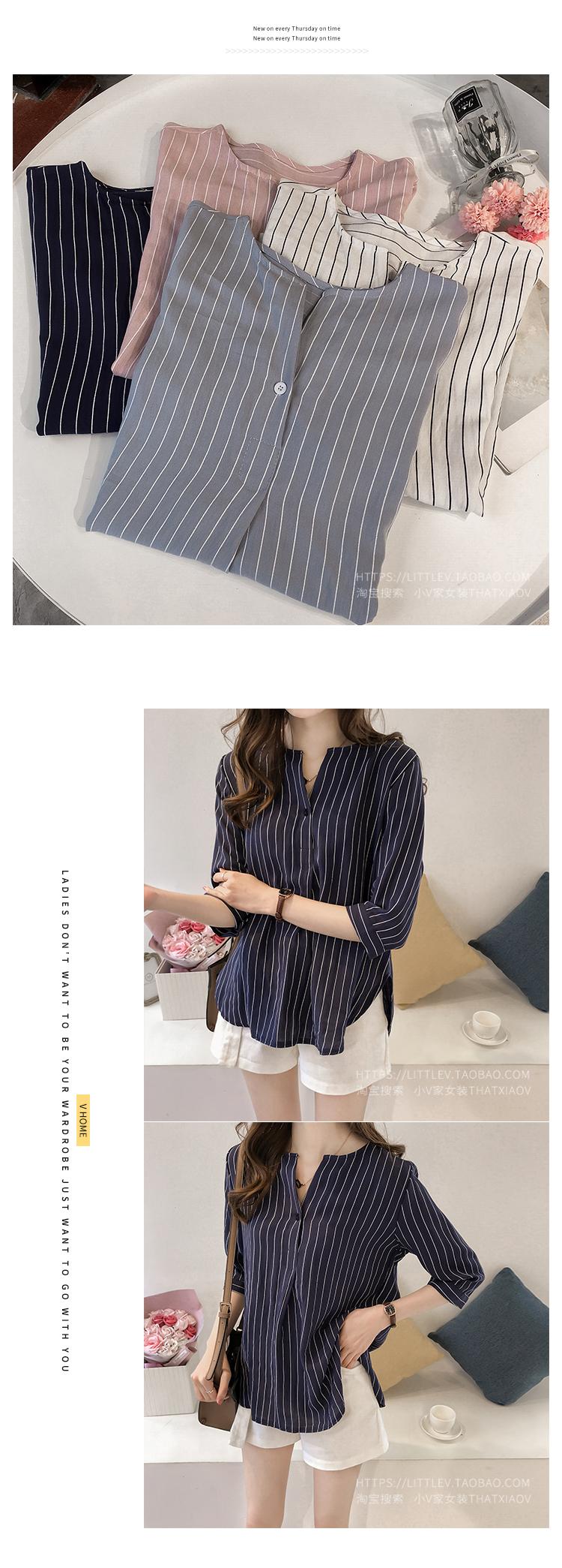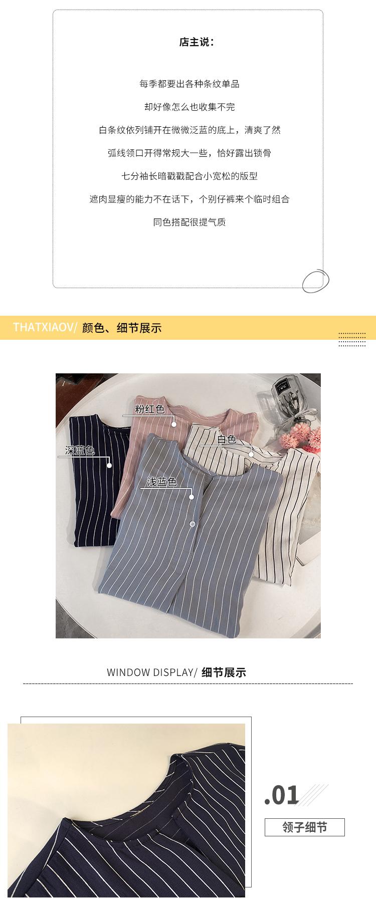 Compra Camisa a rayas de cuello redondo de talla grande de estilo coreano, novedad de verano de 2019, camisa informal holgada de manga tres cuartos para mujer al por mayor en Joom.pro