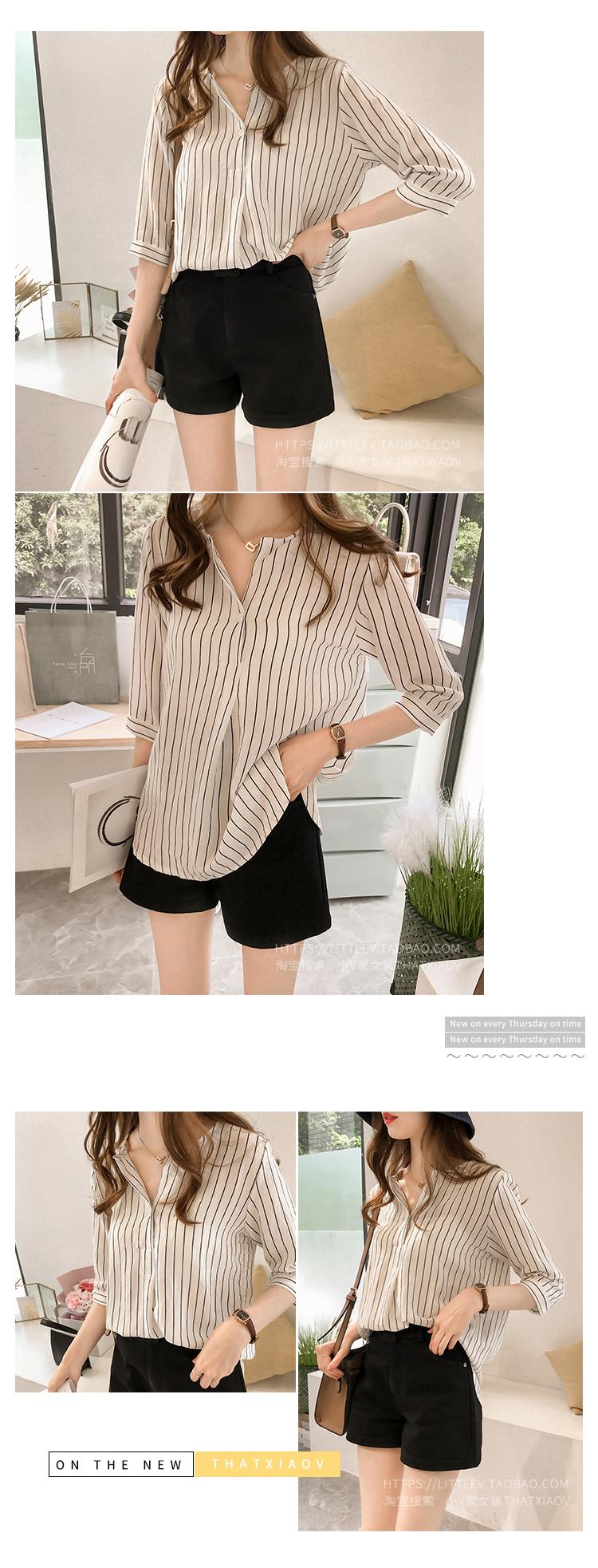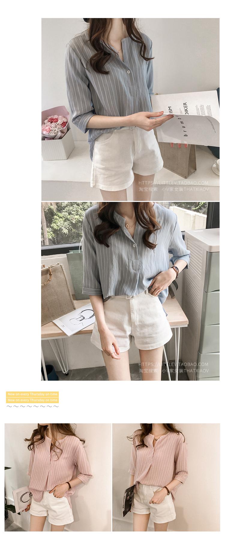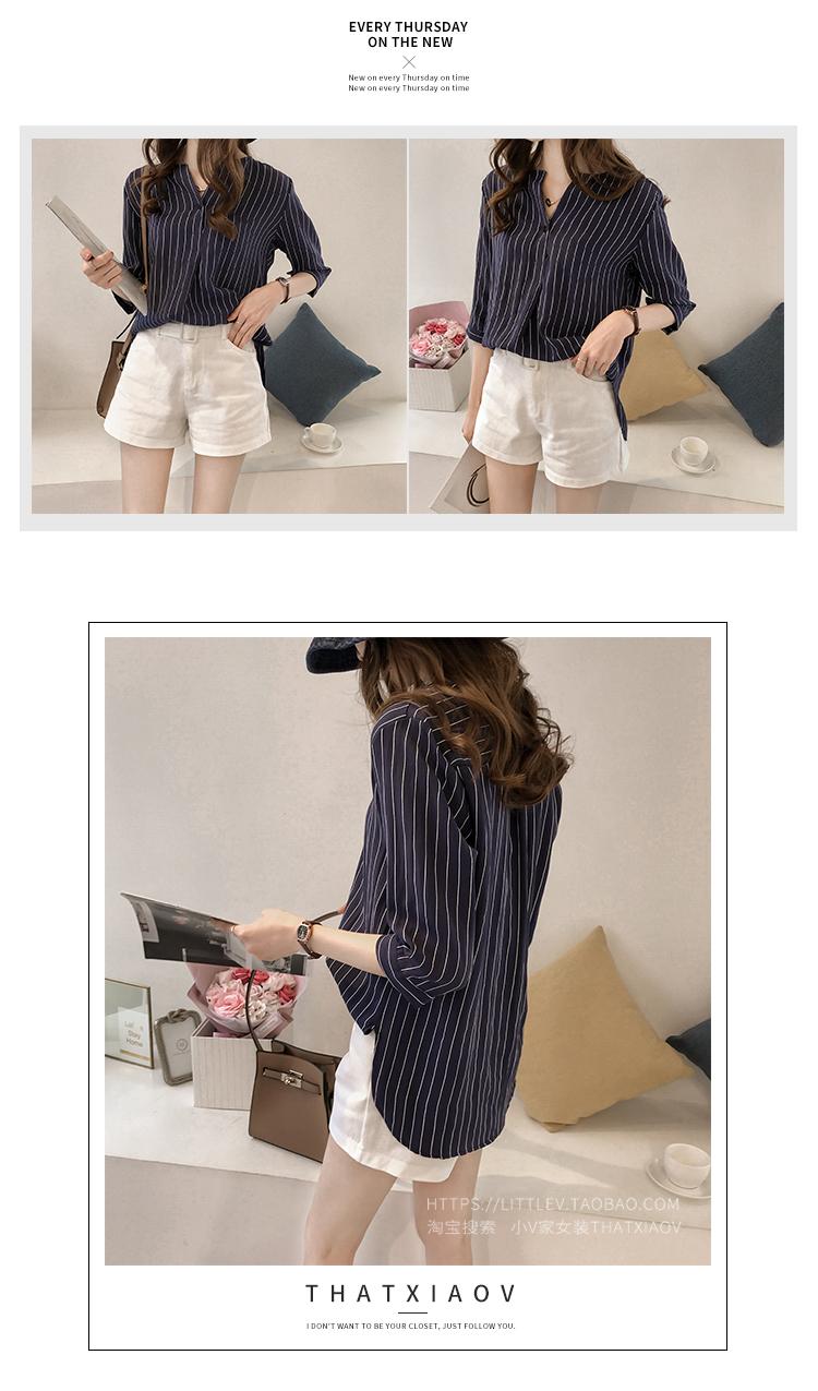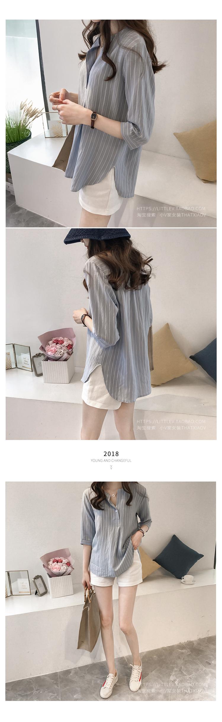 Compra Camisa a rayas de cuello redondo de talla grande de estilo coreano, novedad de verano de 2019, camisa informal holgada de manga tres cuartos para mujer al por mayor en Joom.pro