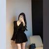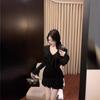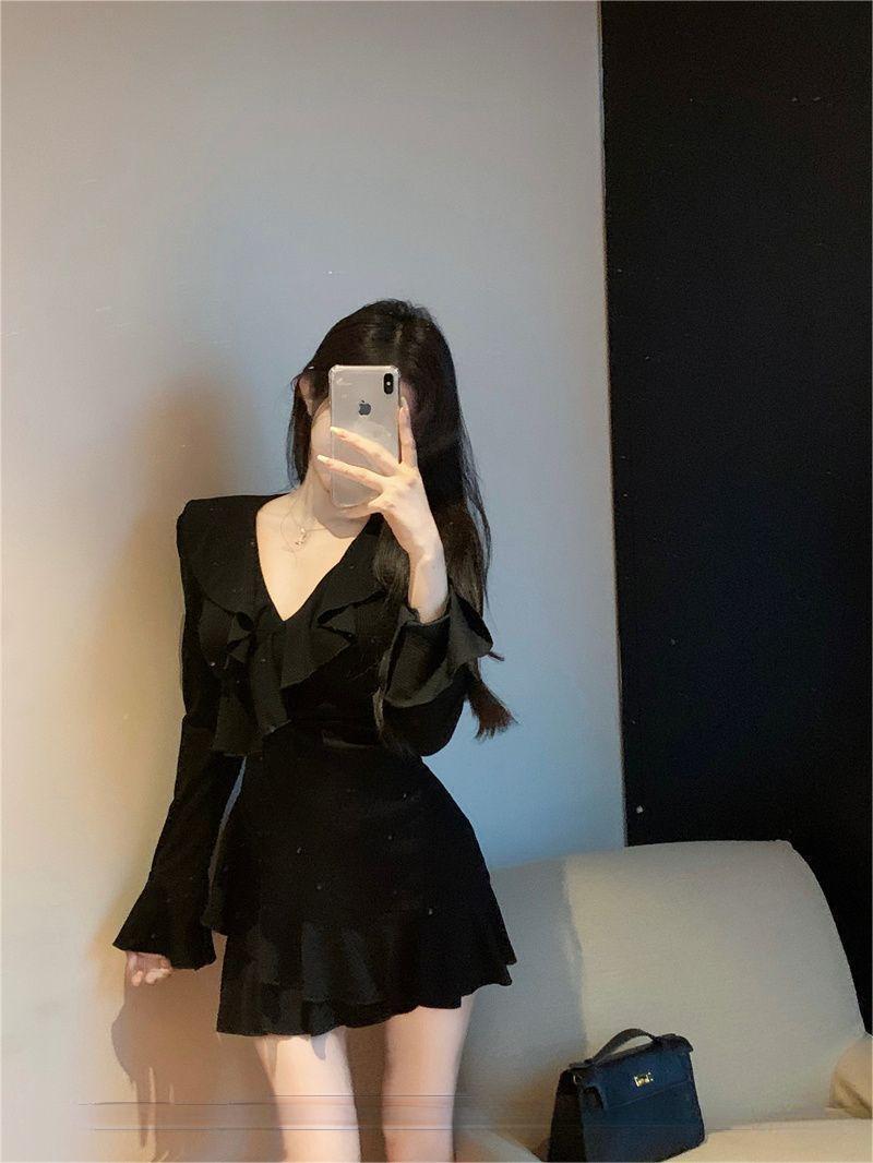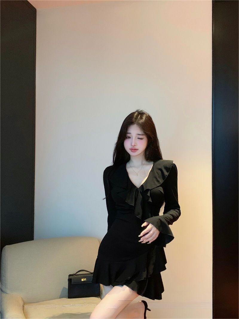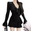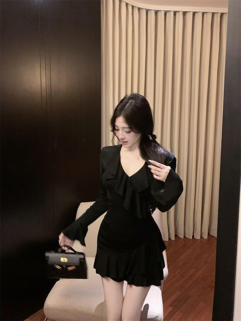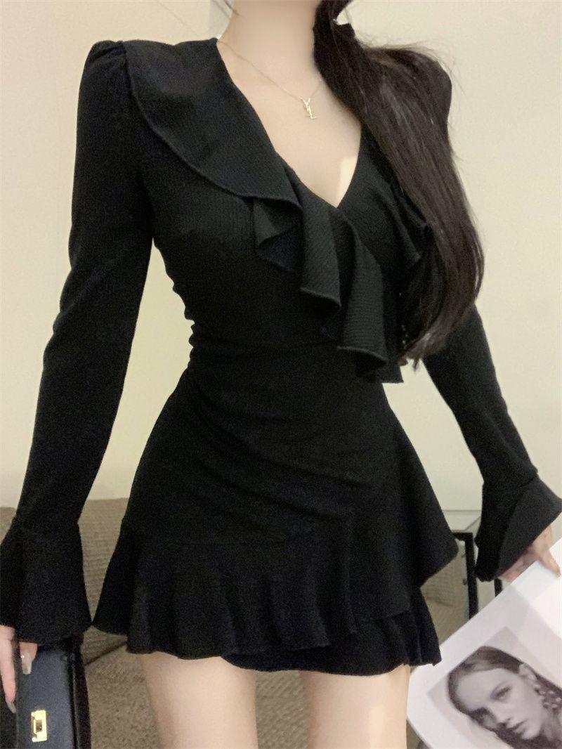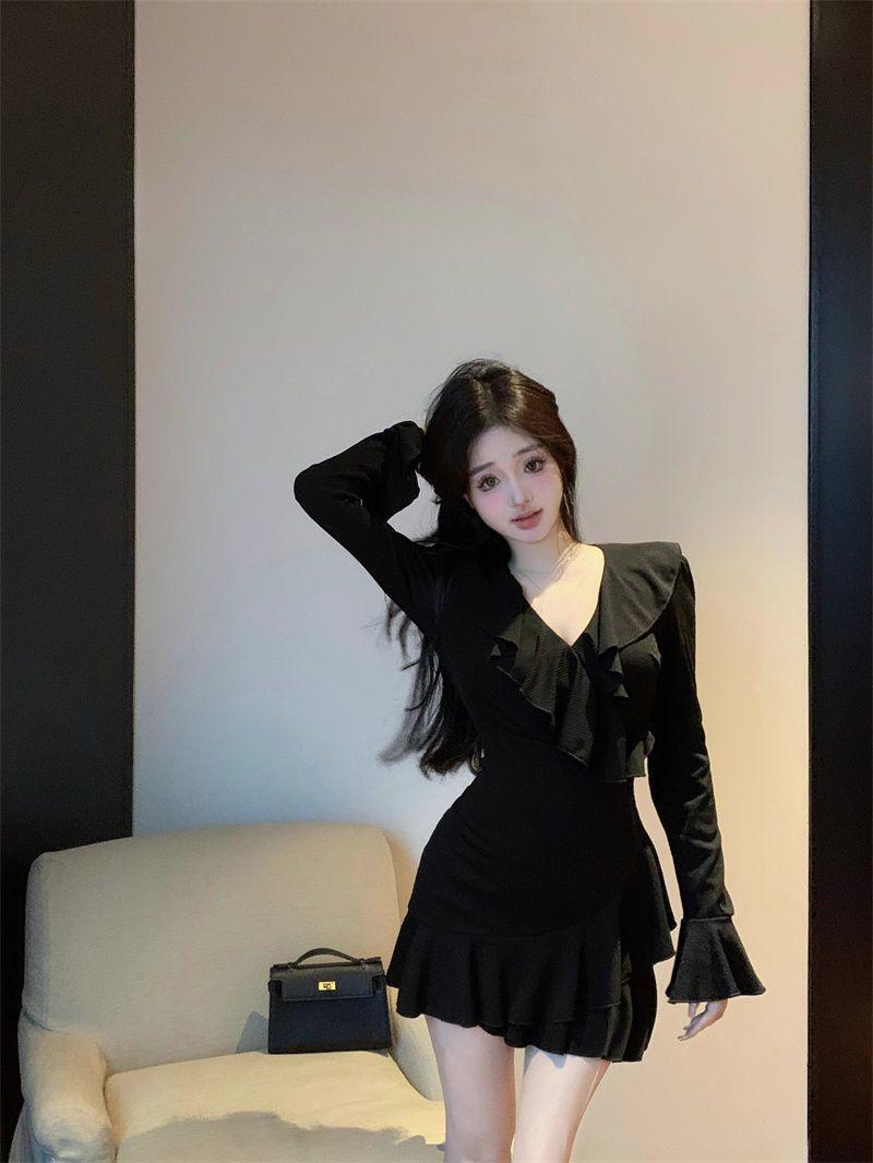 Vestido de chica sexy con escote en V de puro deseo, estilo francés elegante, dulce y picante, ajustado, para otoño e invierno, falda corta ajustada a la cintura