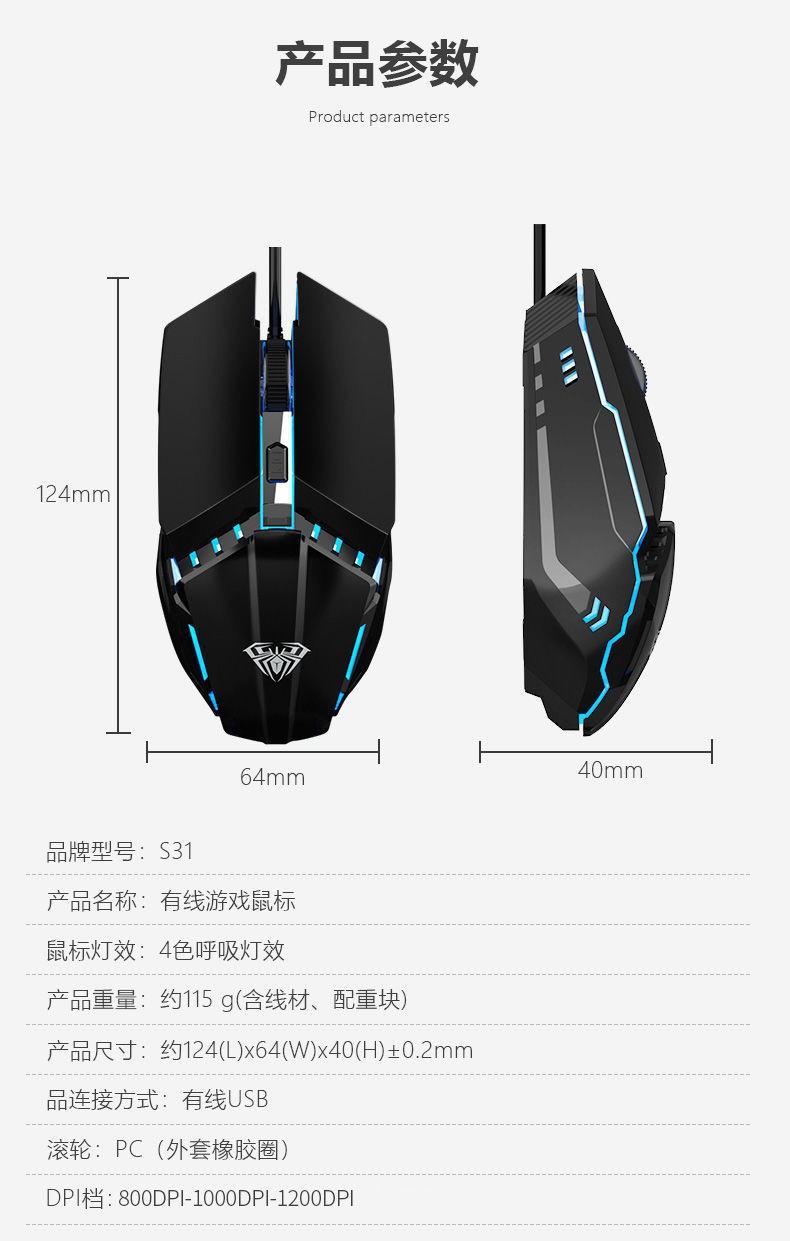 Ratón con cable Tarantula S31 para juegos electrónicos, luminoso, USB, para ordenador portátil, de escritorio, fotoeléctrico, con peso.