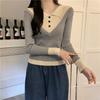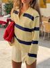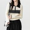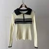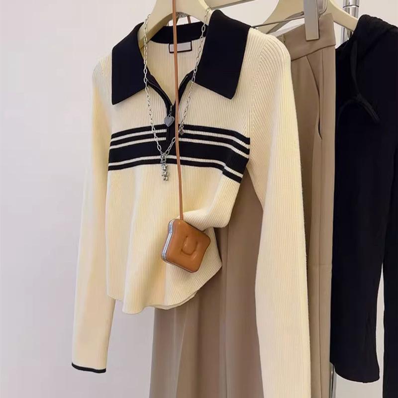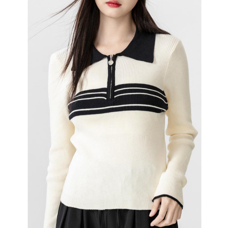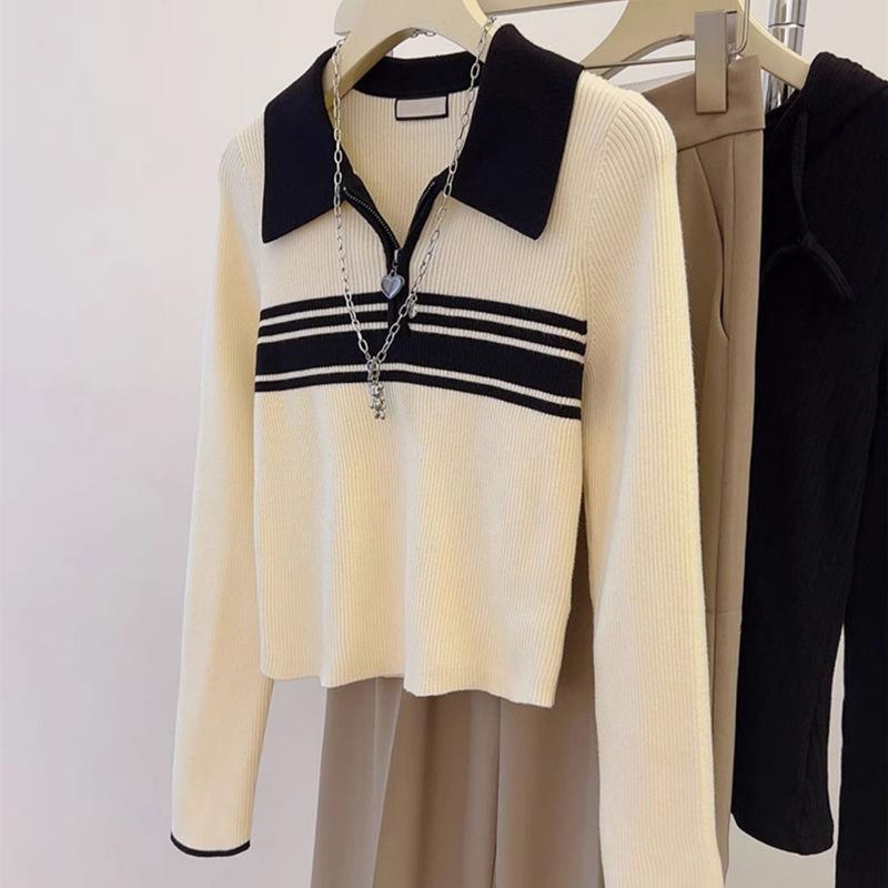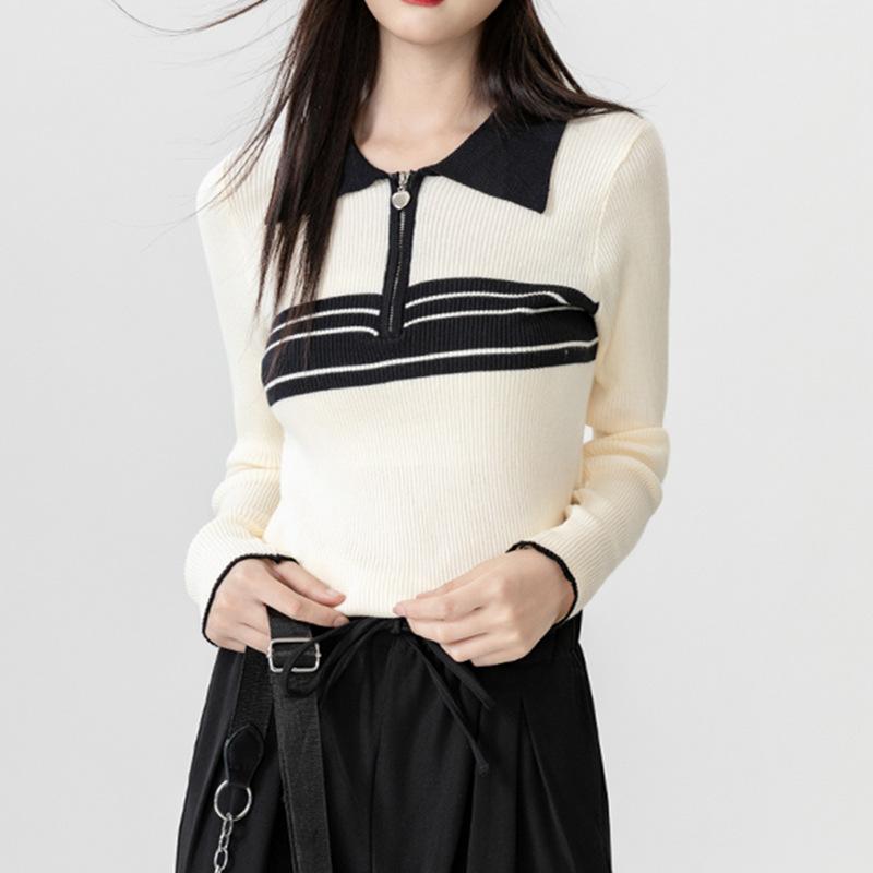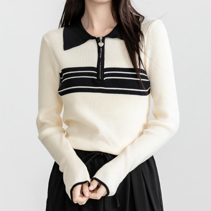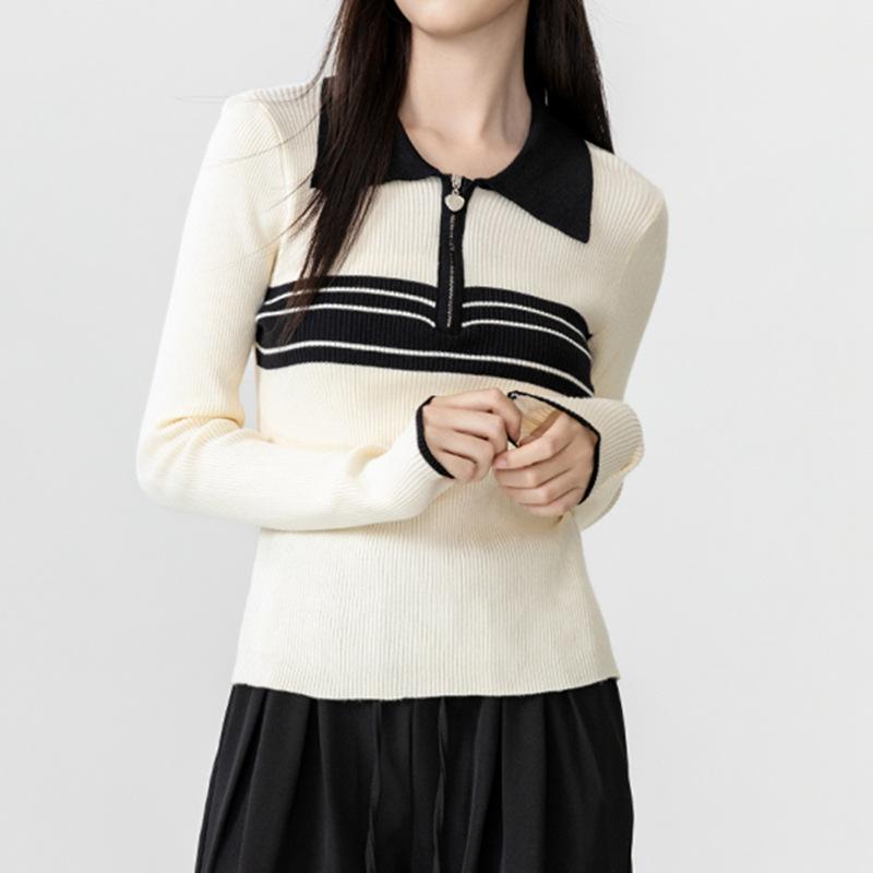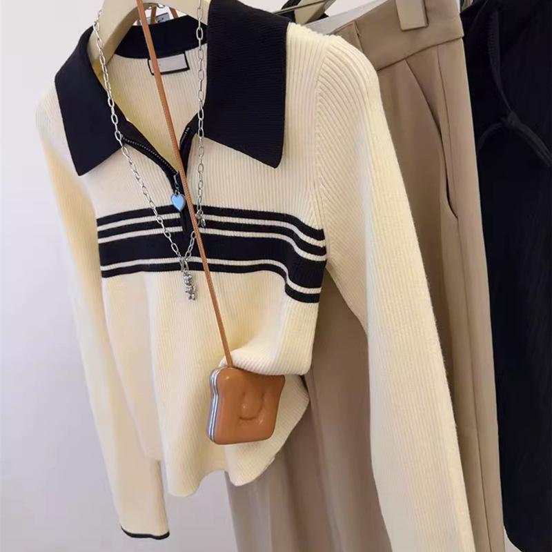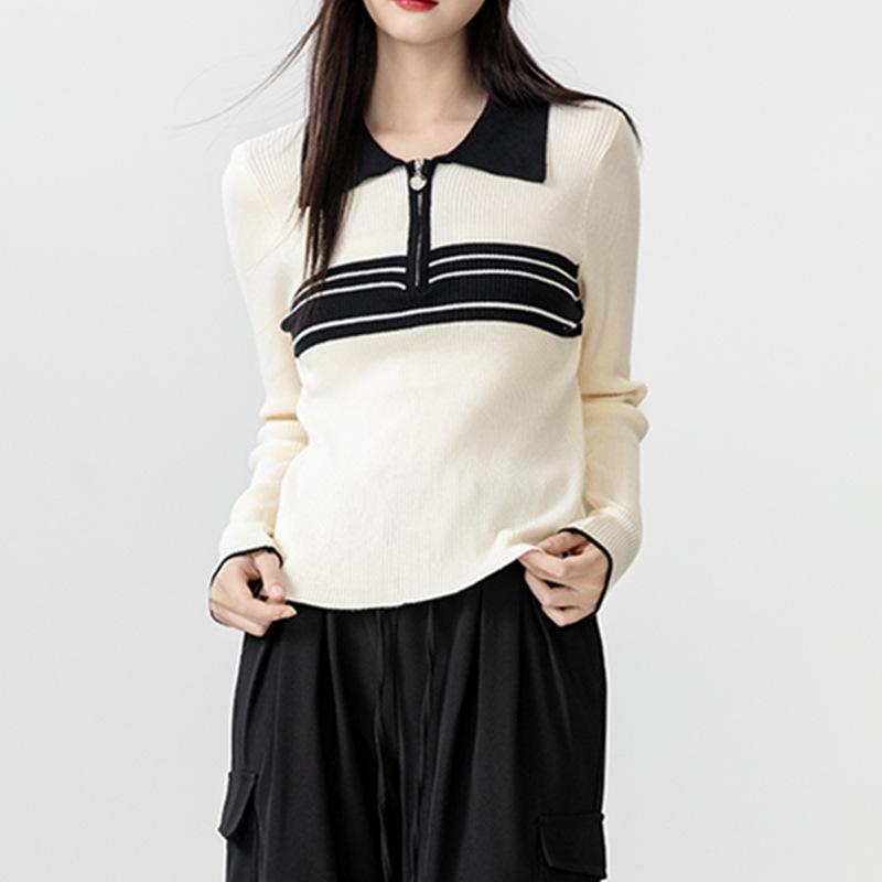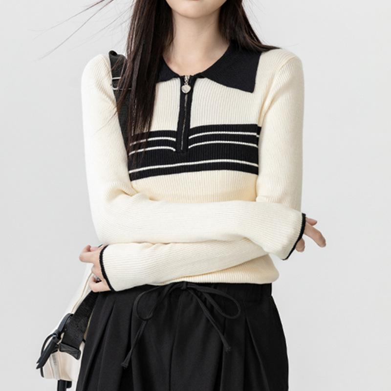 Nuevo suéter de otoño de punto con cuello polo a rayas de color contrastante para mujer, primavera y otoño, manga larga, solapa con media cremallera