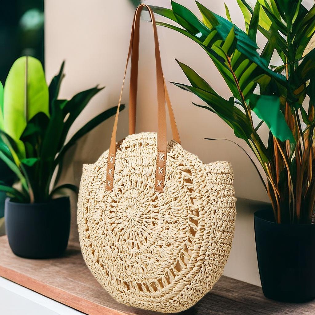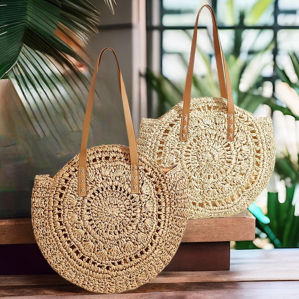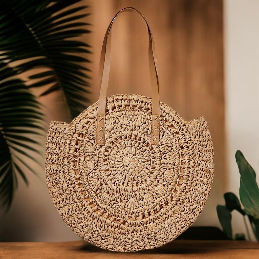 Compra Bolso de hombro tejido de paja con flores huecas, bolso de playa redondo para mujer, bolso de mano para vacaciones al por mayor en Joom.pro