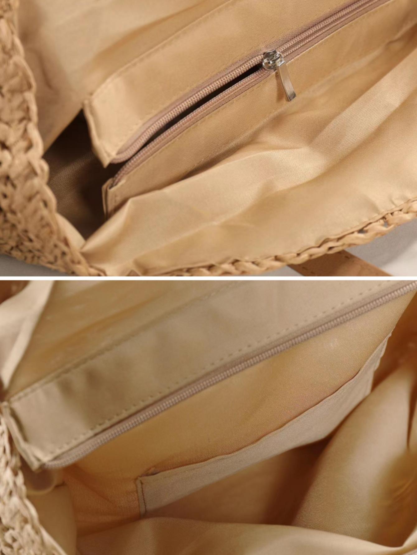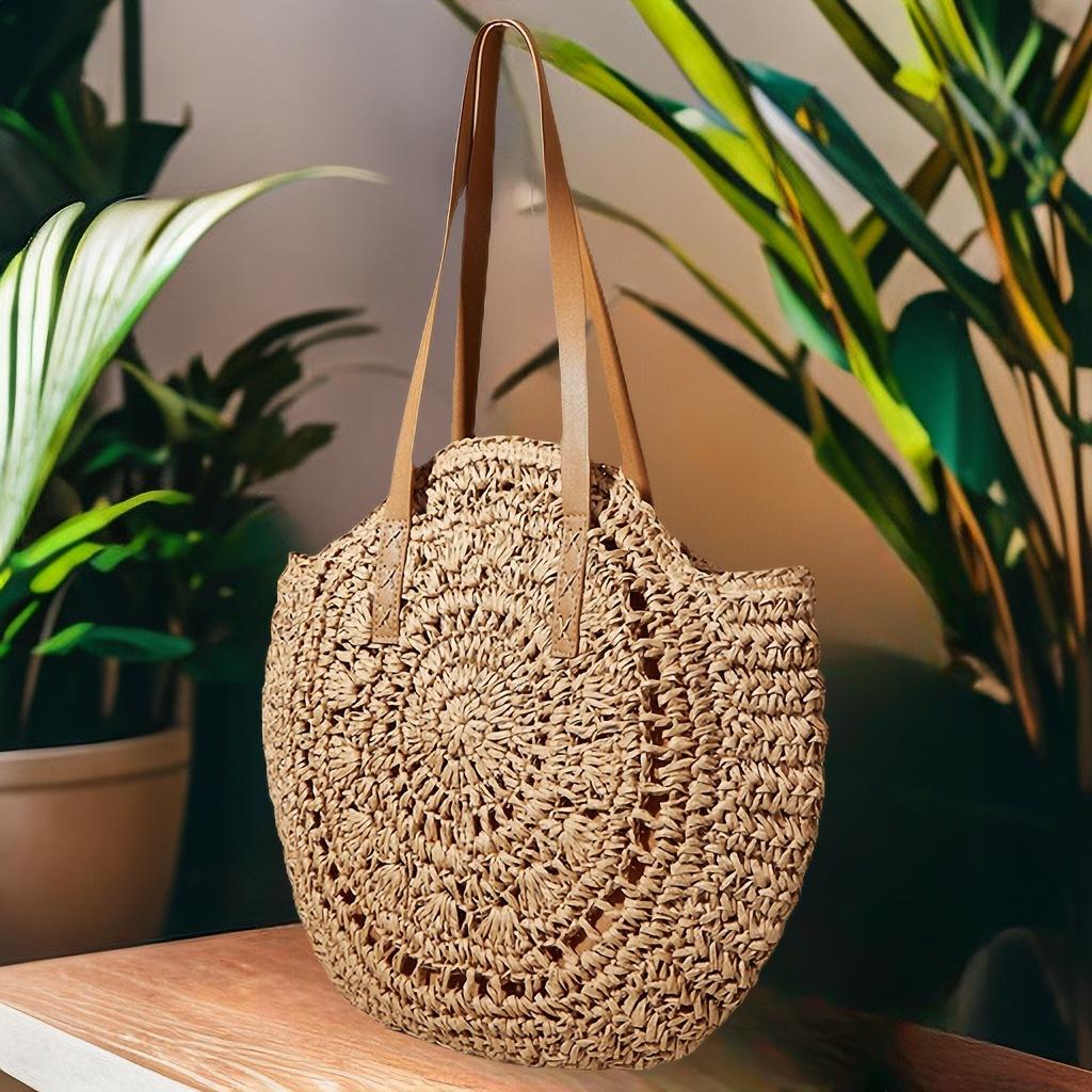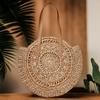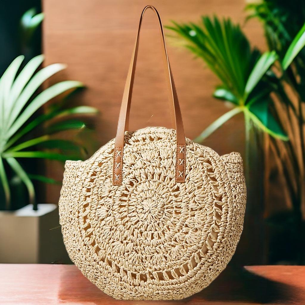Bolso de hombro tejido de paja con flores huecas, bolso de playa redondo para mujer, bolso de mano para vacaciones