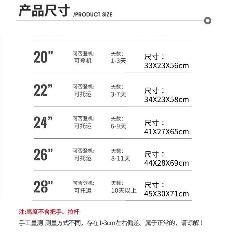 20 inch [can board]], 24 inch [can be checked]], 26 inch [can be checked]]