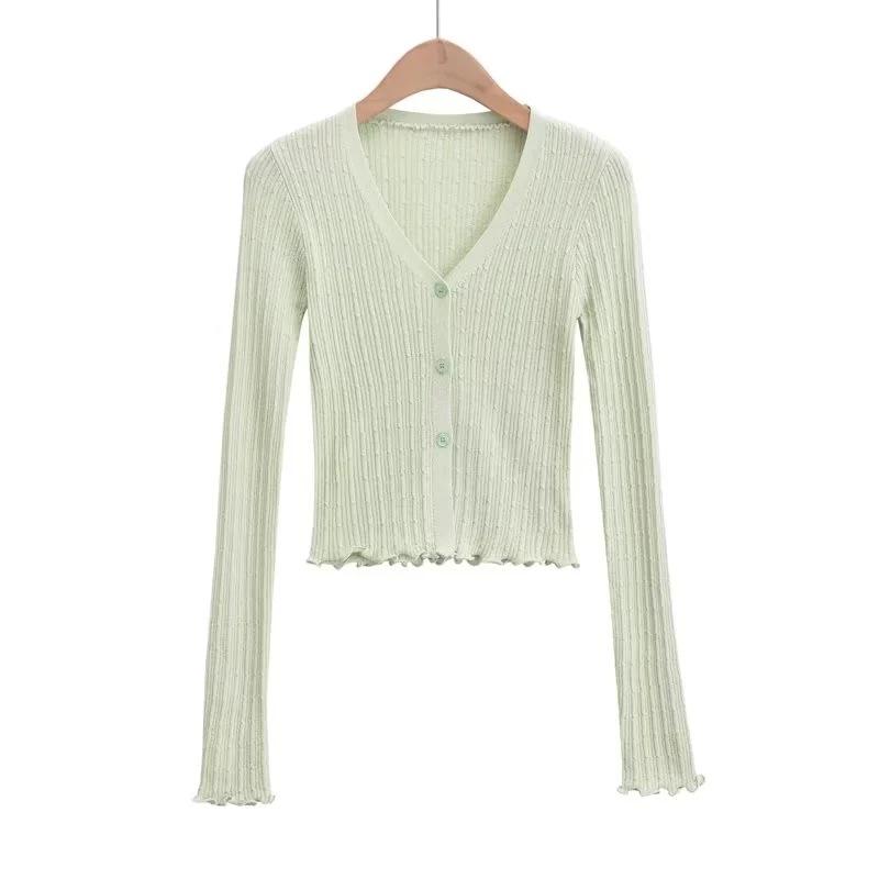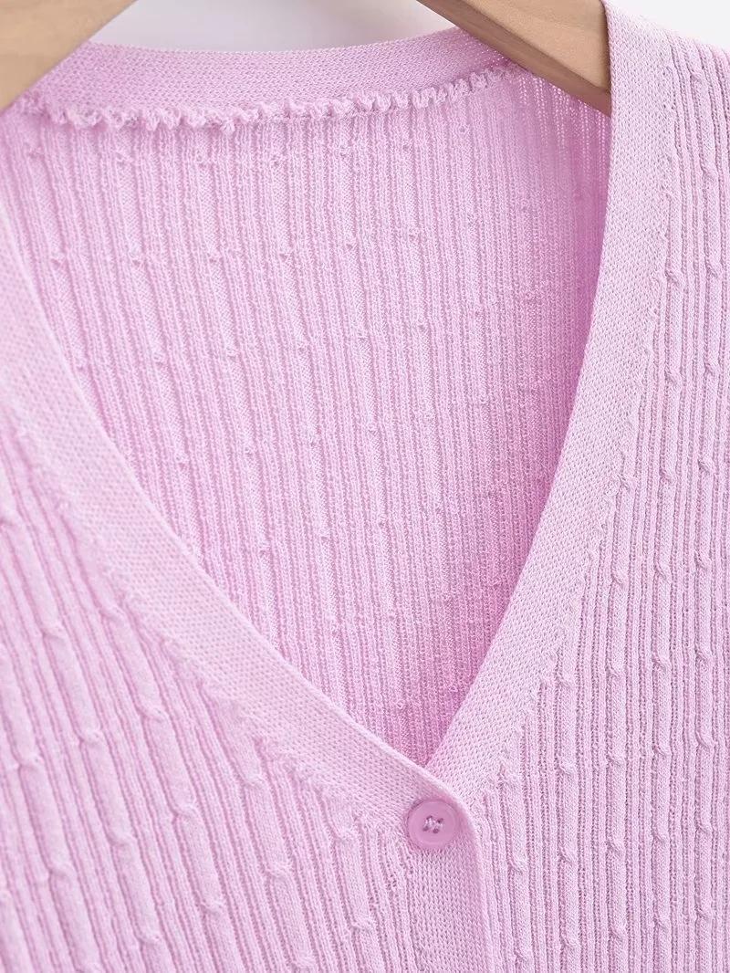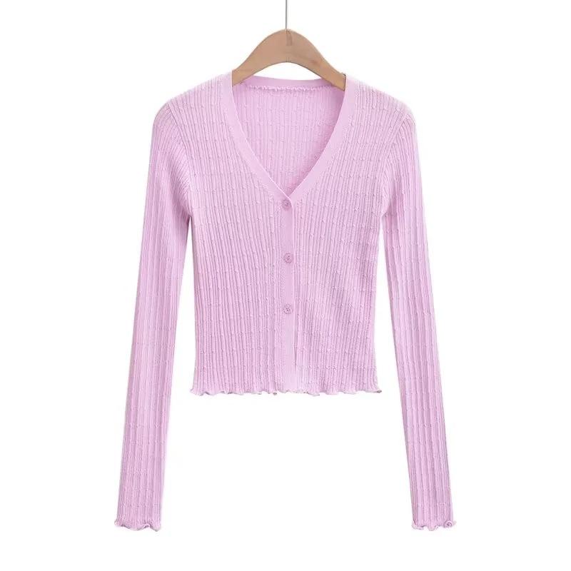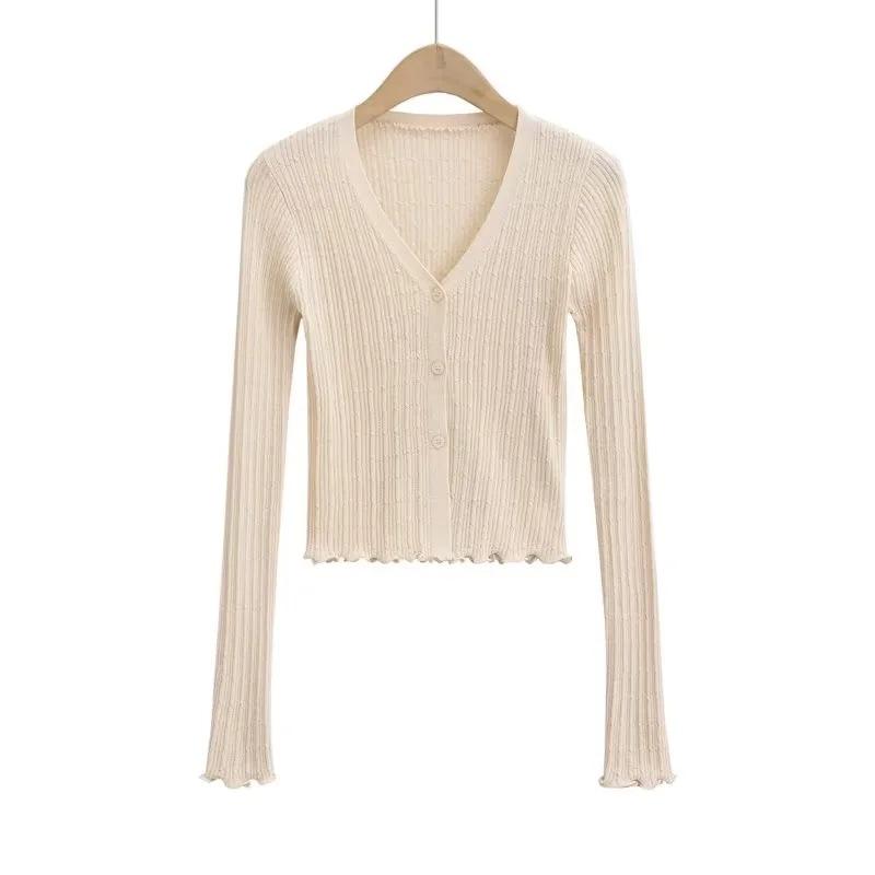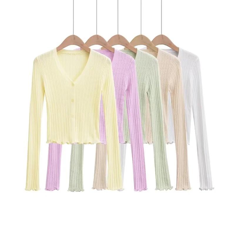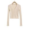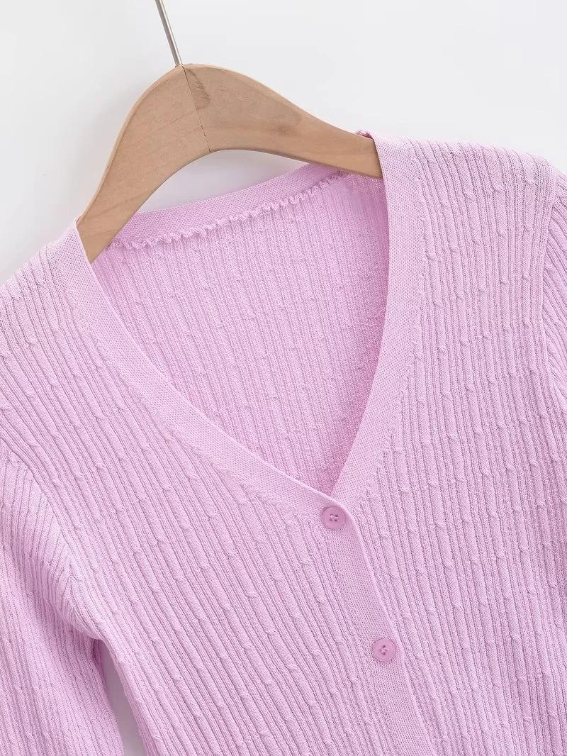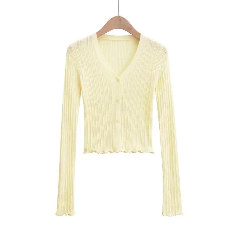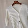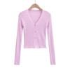 Cárdigan Top Tejido de Tres Botones Color Caramelo Ins para Mujer, Nuevo Verano Cuello en V Acanalado Ajustado Ligero Manga Larga