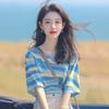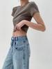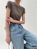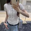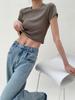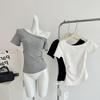 Hongshan 2024 Verano Nuevo Color Puro Versátil Top Corto Manga Corta Hombro Derecho Elástico Cuello Redondo Camiseta Corta