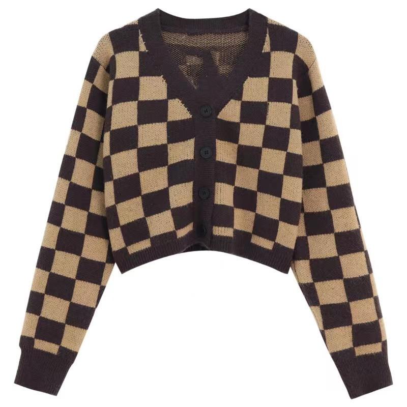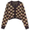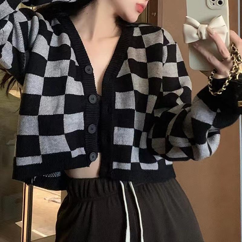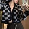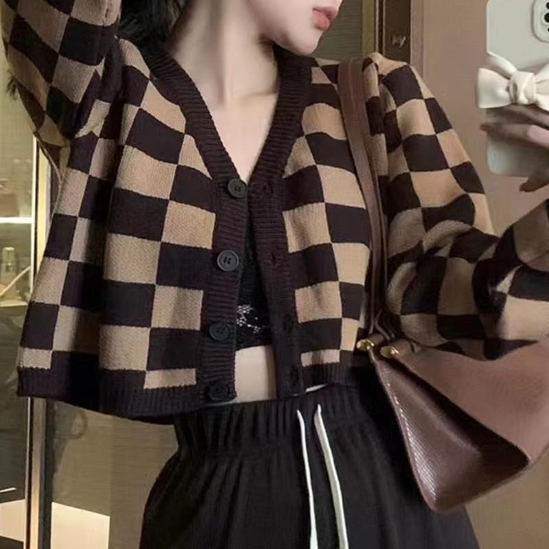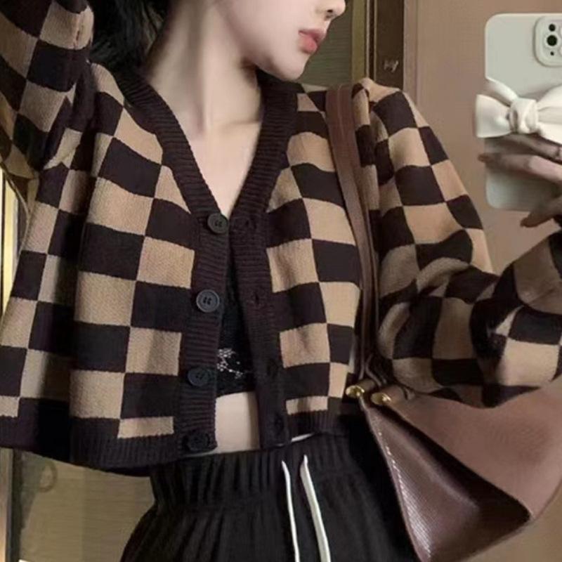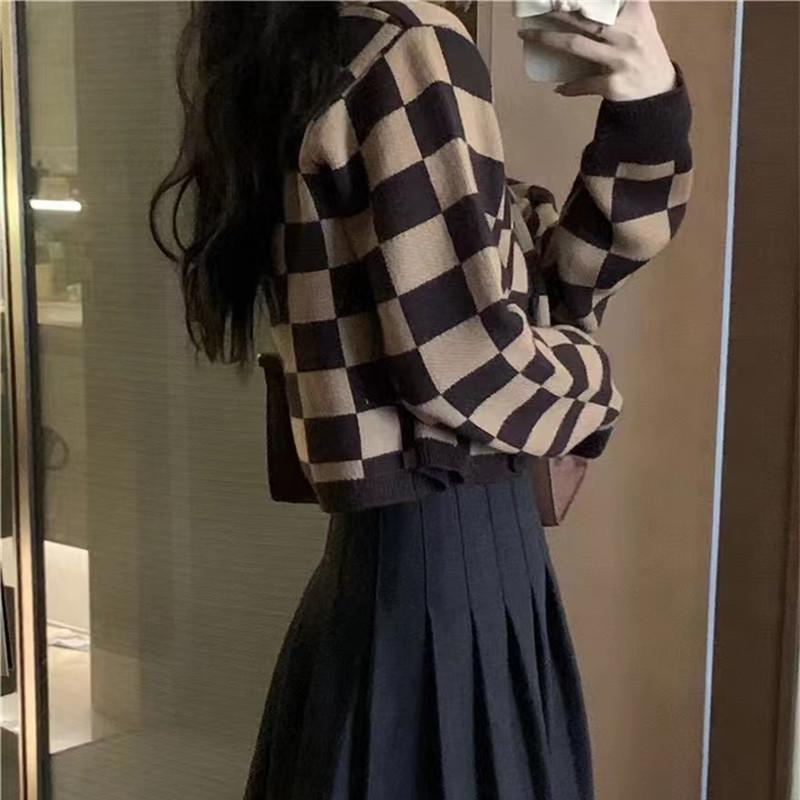 Suéter de punto para mujer, estilo coreano, holgado, estilo francés, a cuadros, manga larga, corto, otoño 2023
