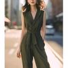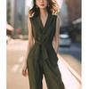 Mono Traje Verde Estilo Maduro Ligero para Mujer Verano 2025 Elegante Profesional Sin Mangas Mono Pantalón Pierna Ancha Traje