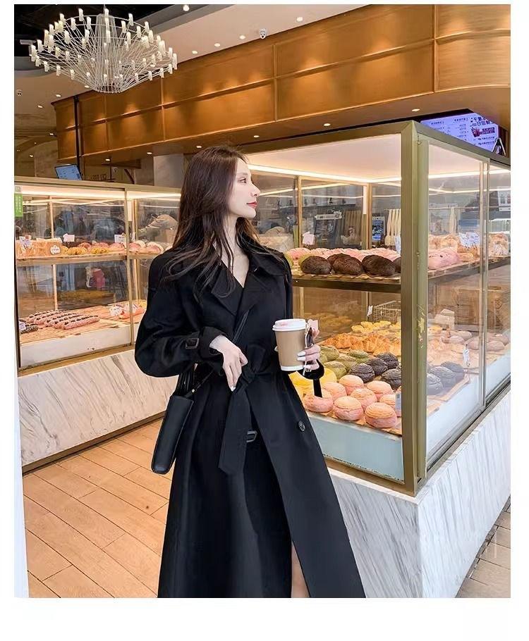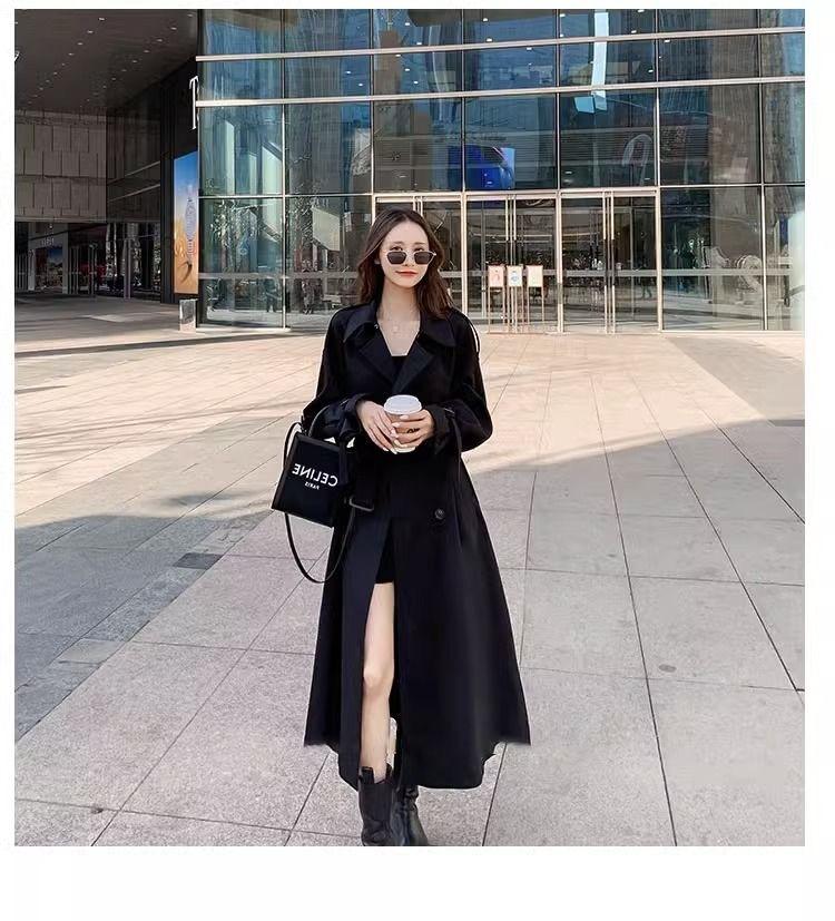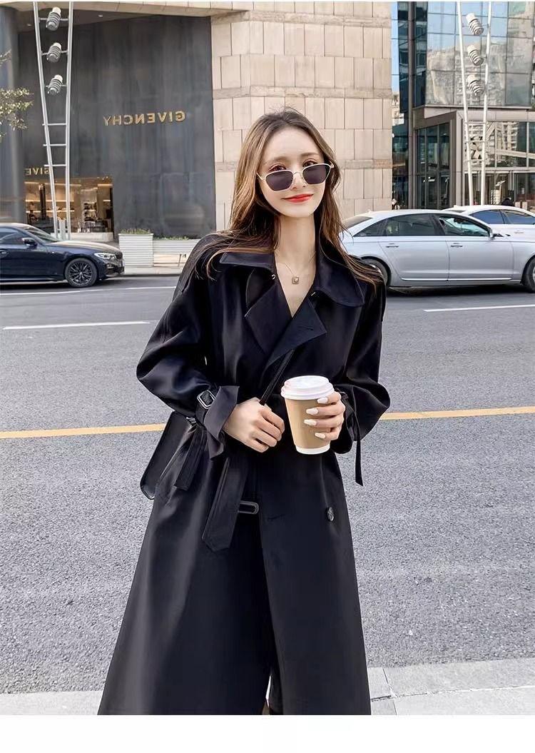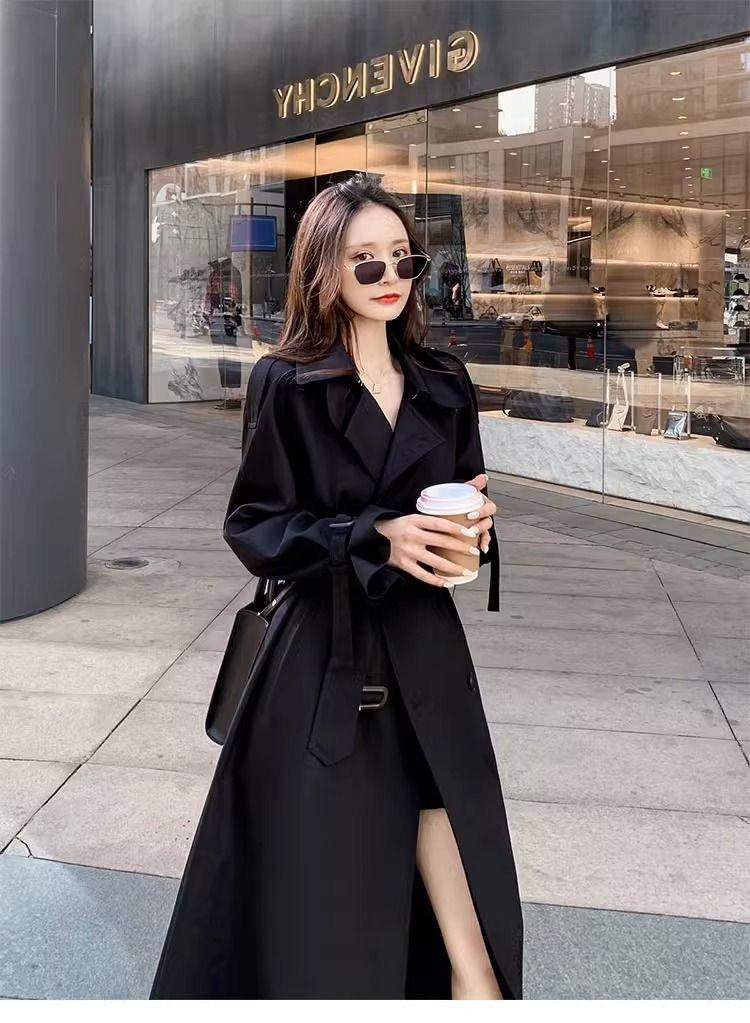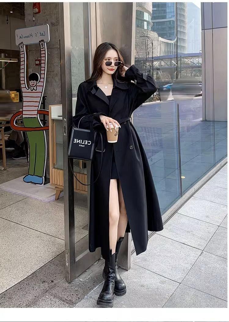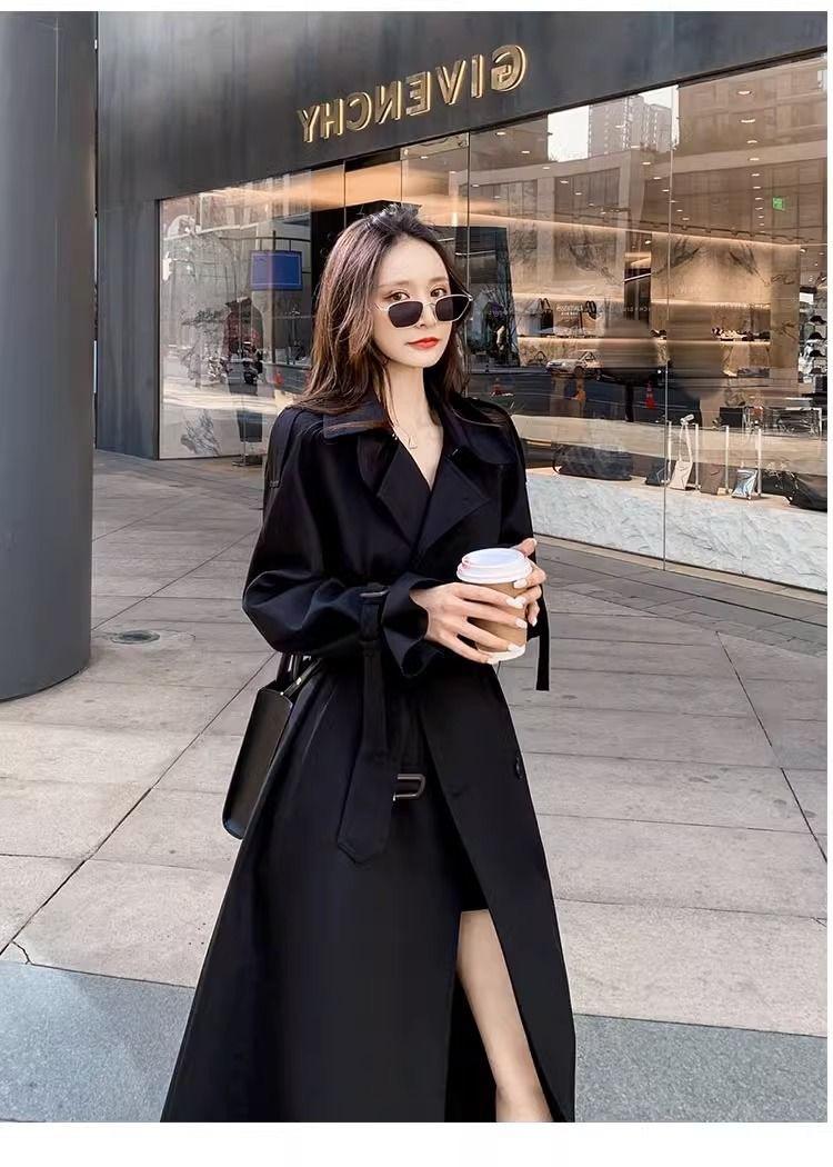 Gabardina negra para mujer, otoño 2023, estilo británico, largo medio, por encima de la rodilla, estilo coreano, abrigo elegante y adelgazante.
