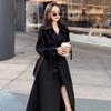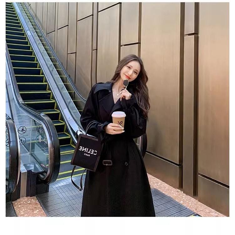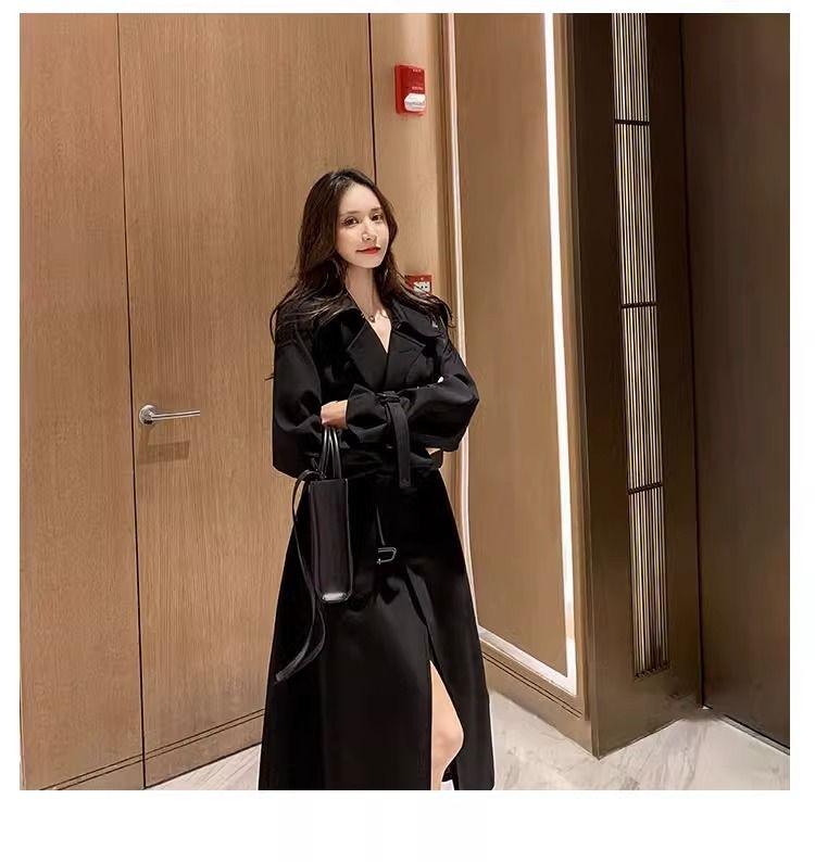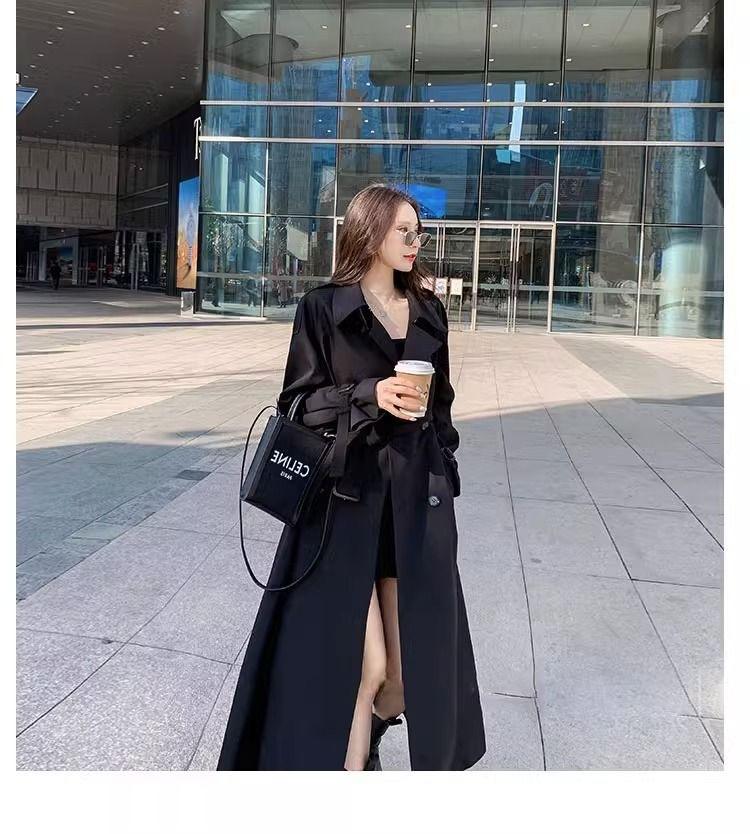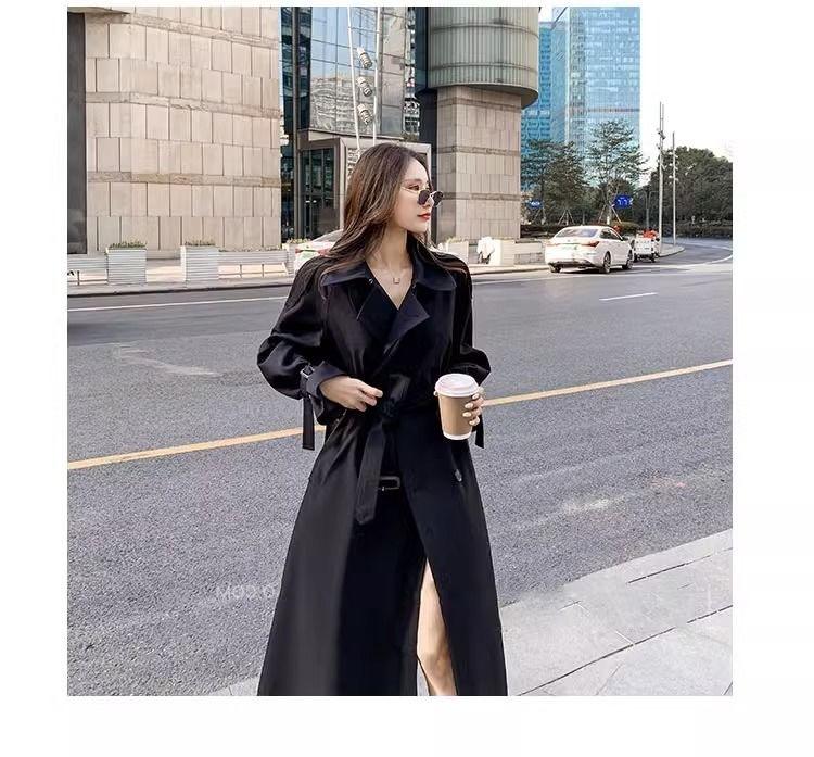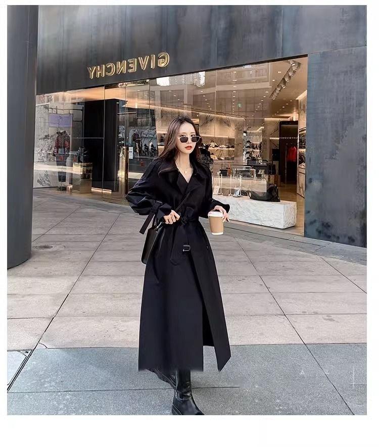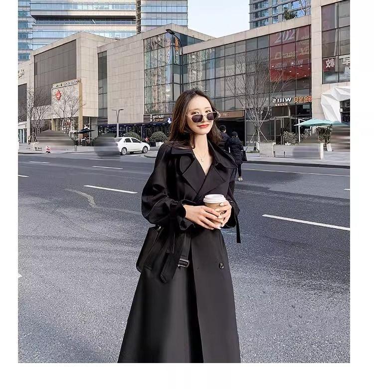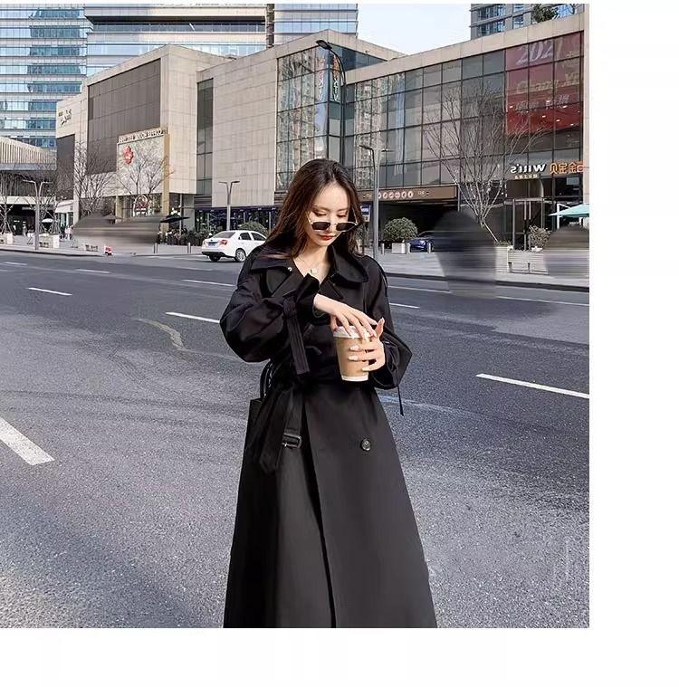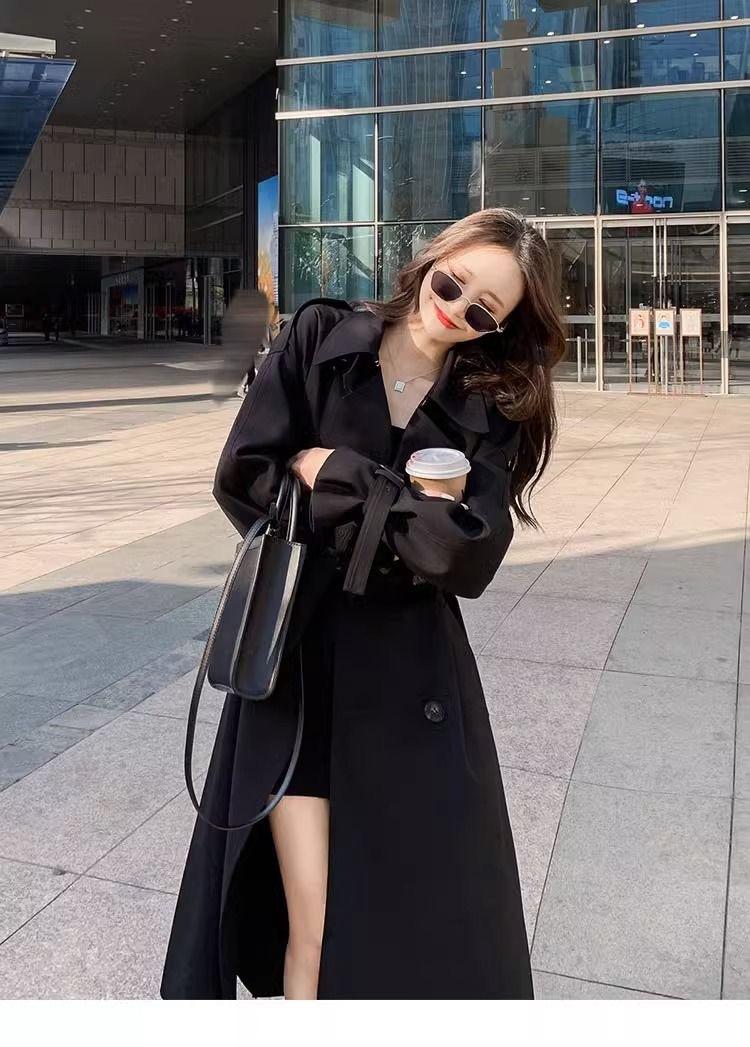 Gabardina negra para mujer, otoño 2023, estilo británico, largo medio, por encima de la rodilla, estilo coreano, abrigo elegante y adelgazante.