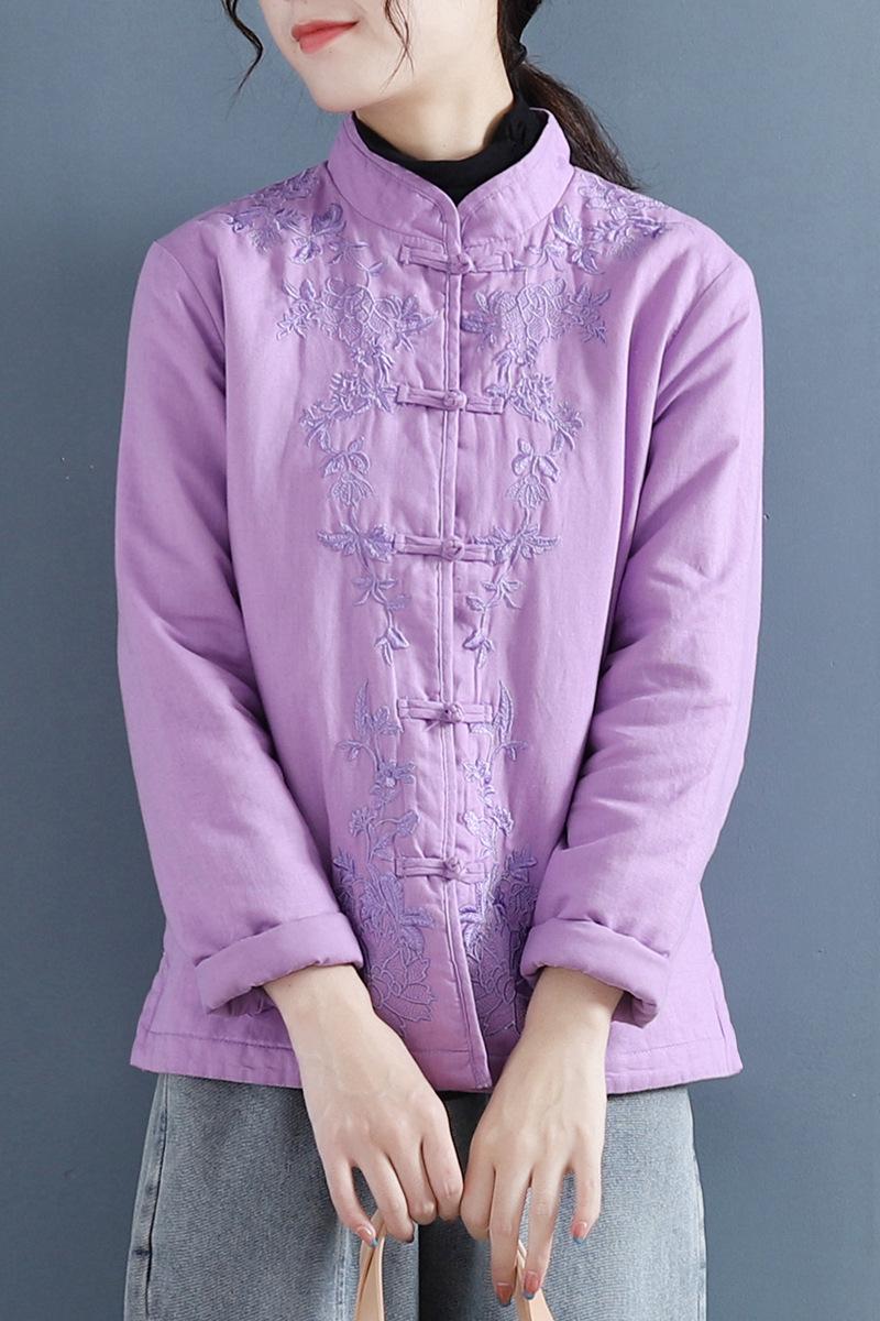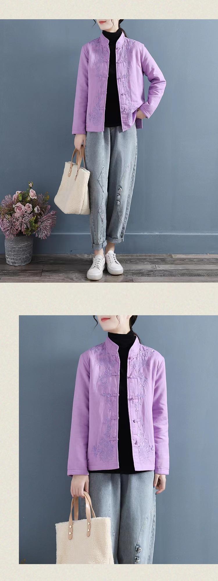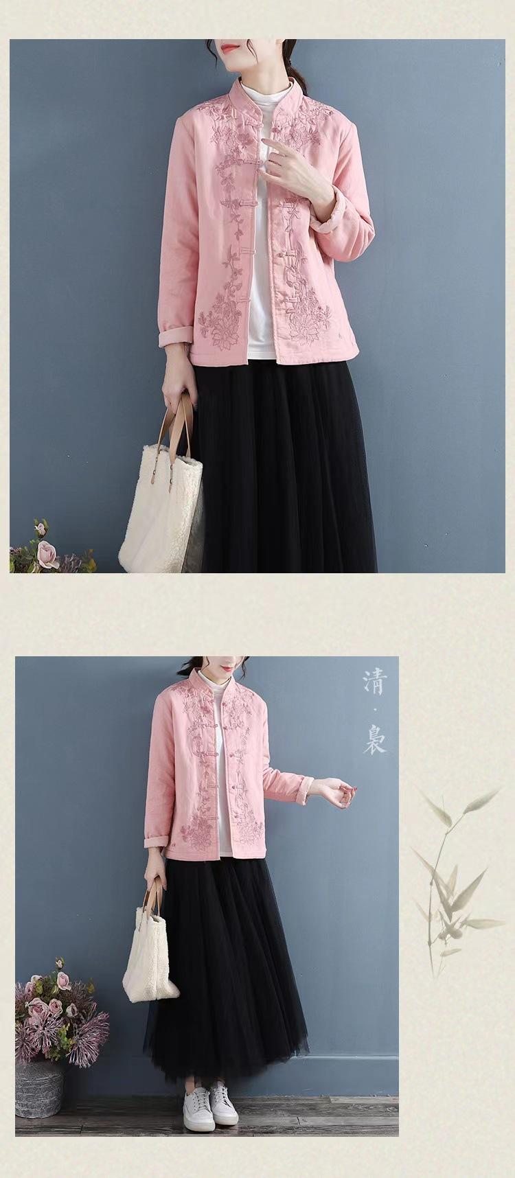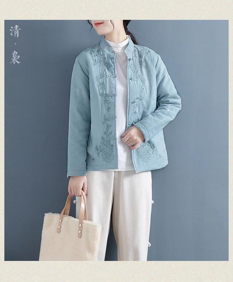 Abrigo Delgado de Algodón Retro con Hebilla de Estilo Chino para Mujer con Bordado Artístico Ropa Exterior Chaqueta de Algodón Casual Acolchada Chaqueta con Cuello Alto