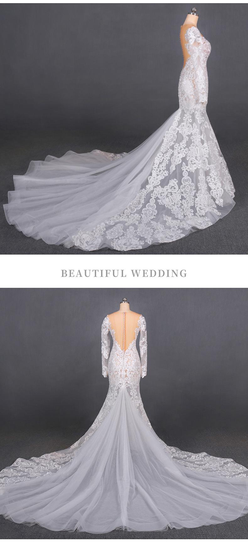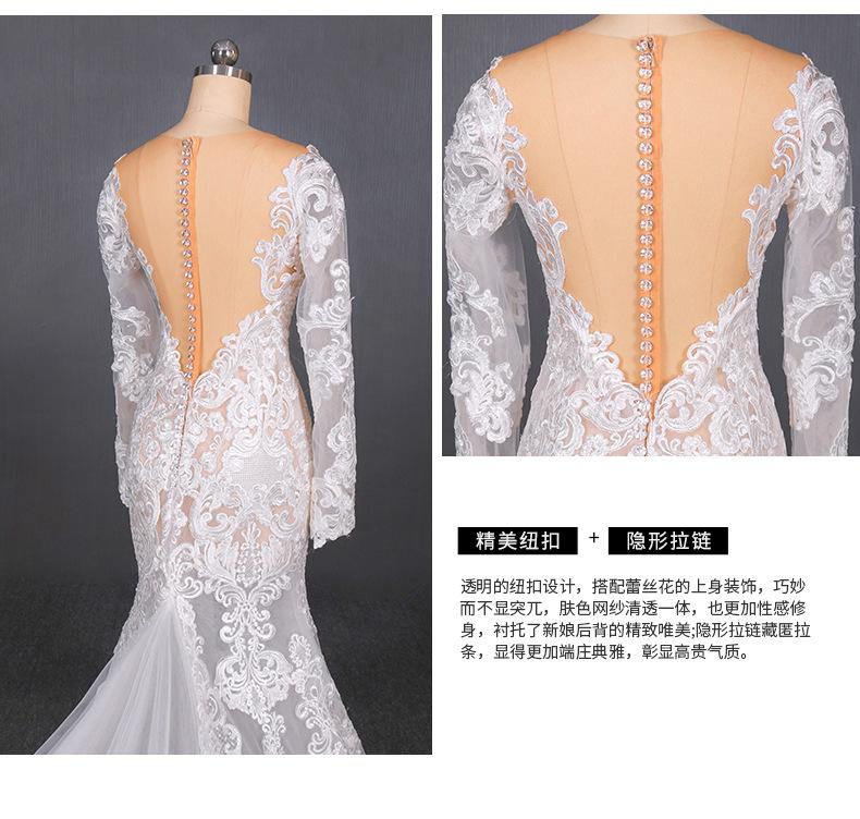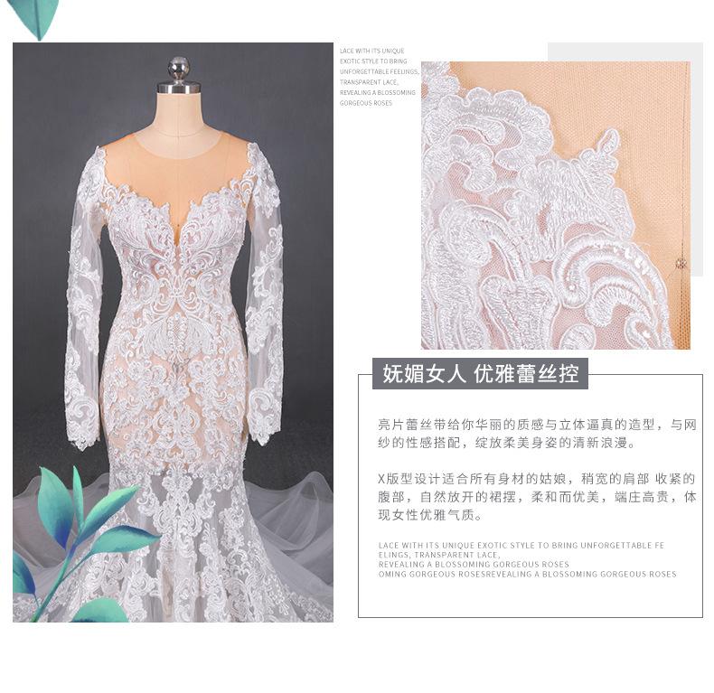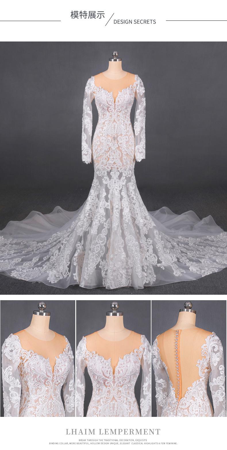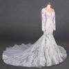 Nuevo vestido de novia de cola de pez entallado de encaje de malla, manga larga, cuello redondo, cola grande, alto, delgado, sexy, para boda