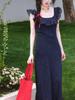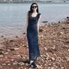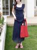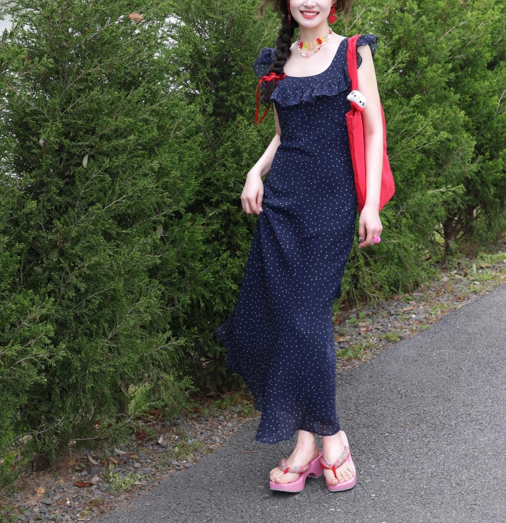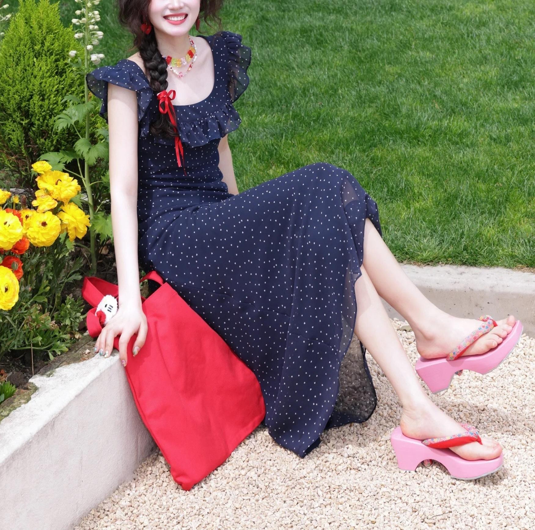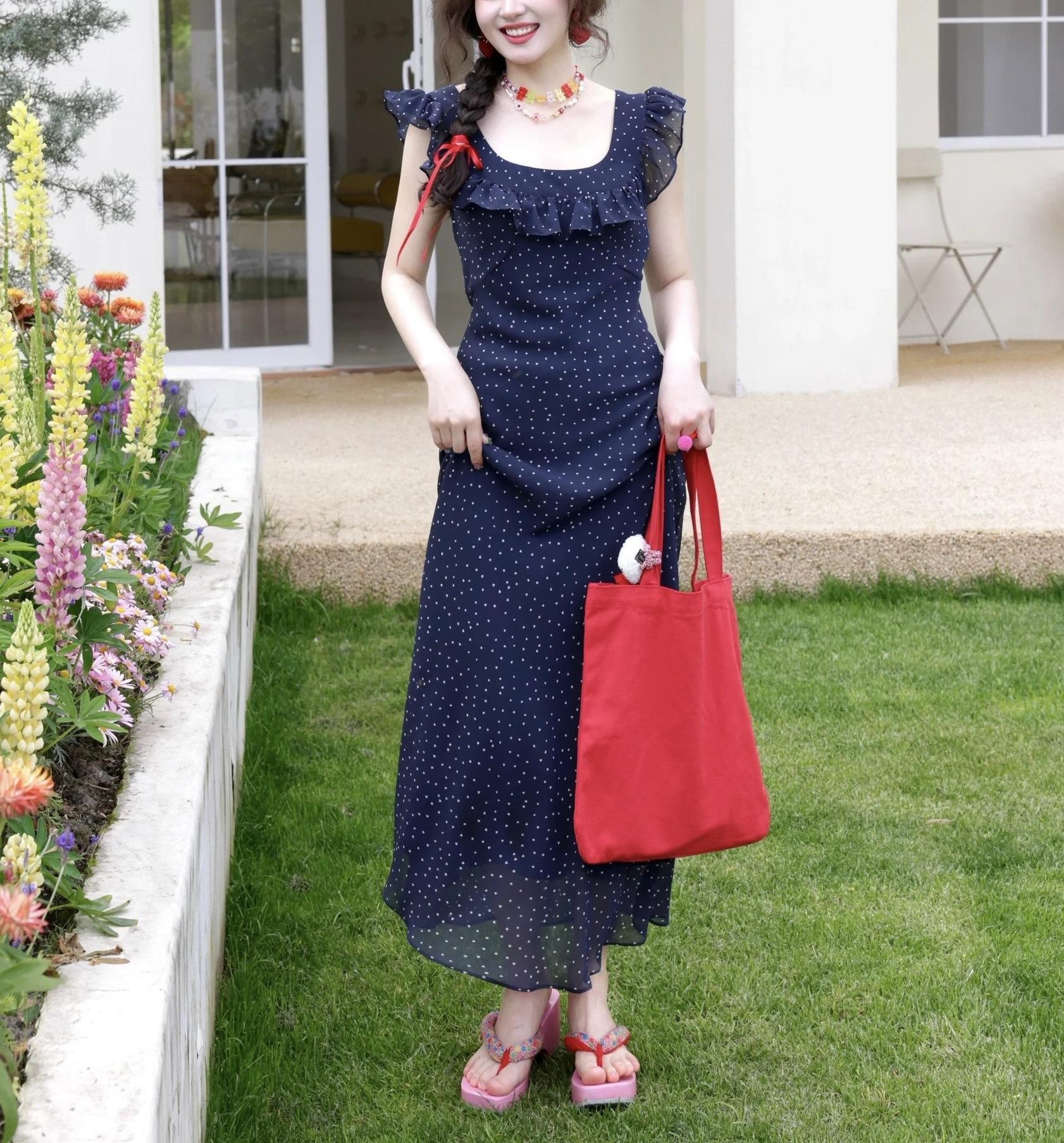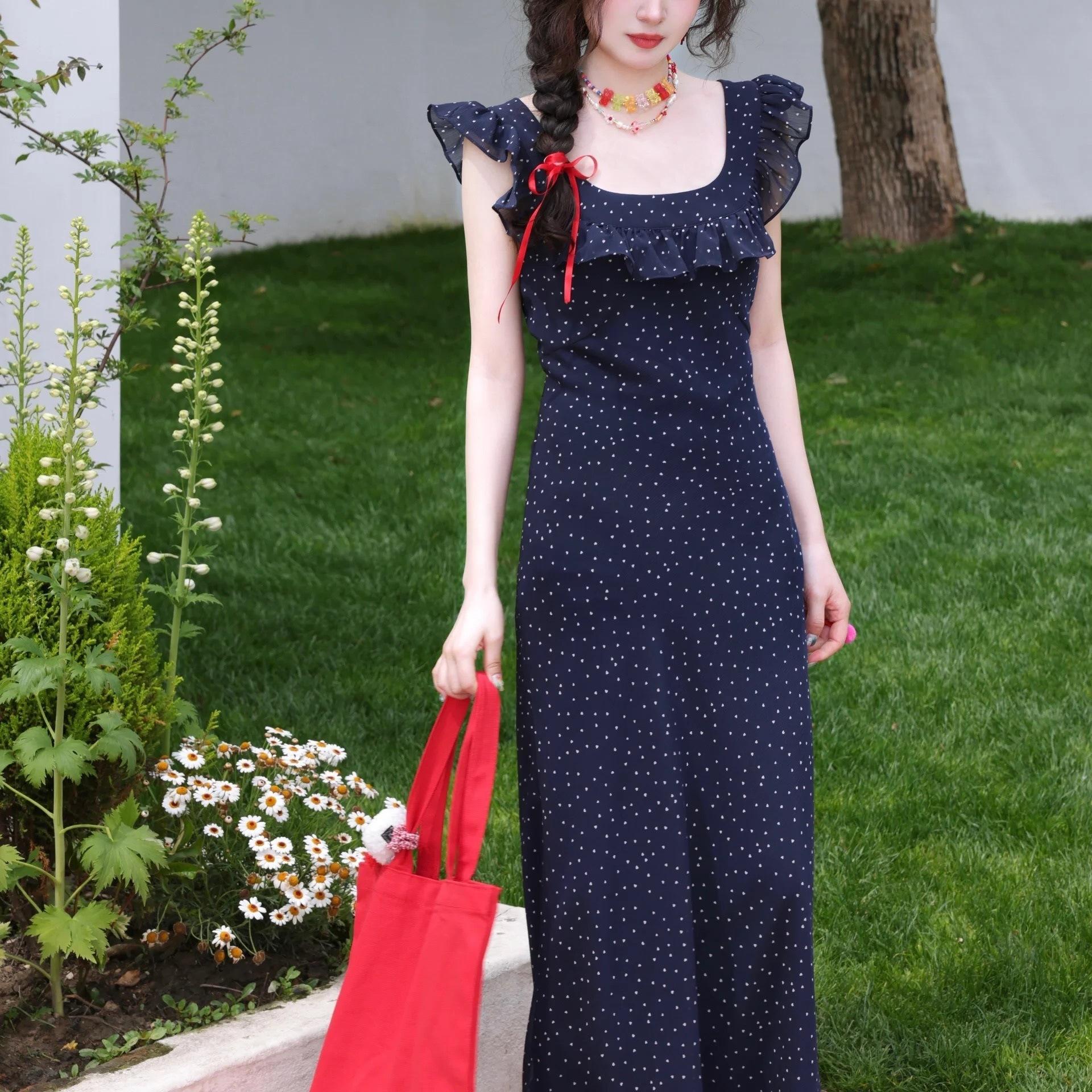 Vestido de Lunares con Mangas Cortas Volantes Mujer Verano 2025 Nuevo Vacaciones Marinas Francesas Falda Larga con Tirantes