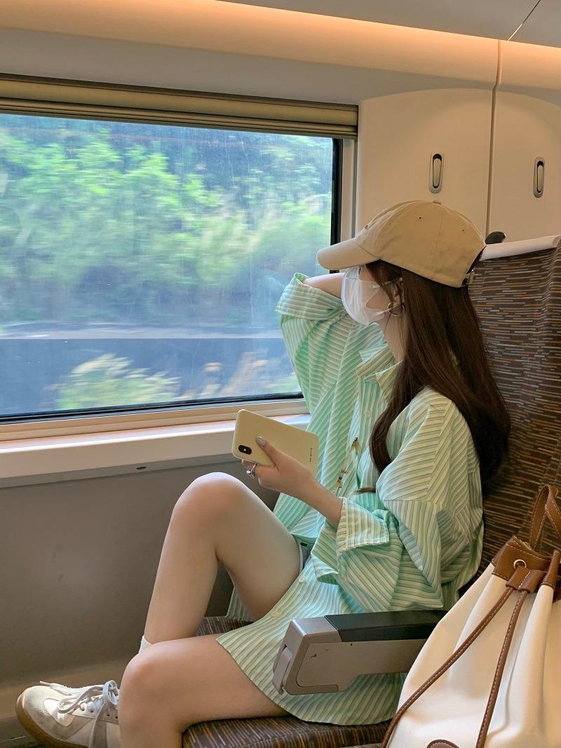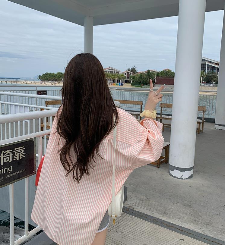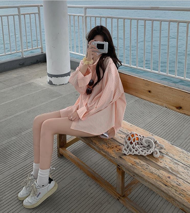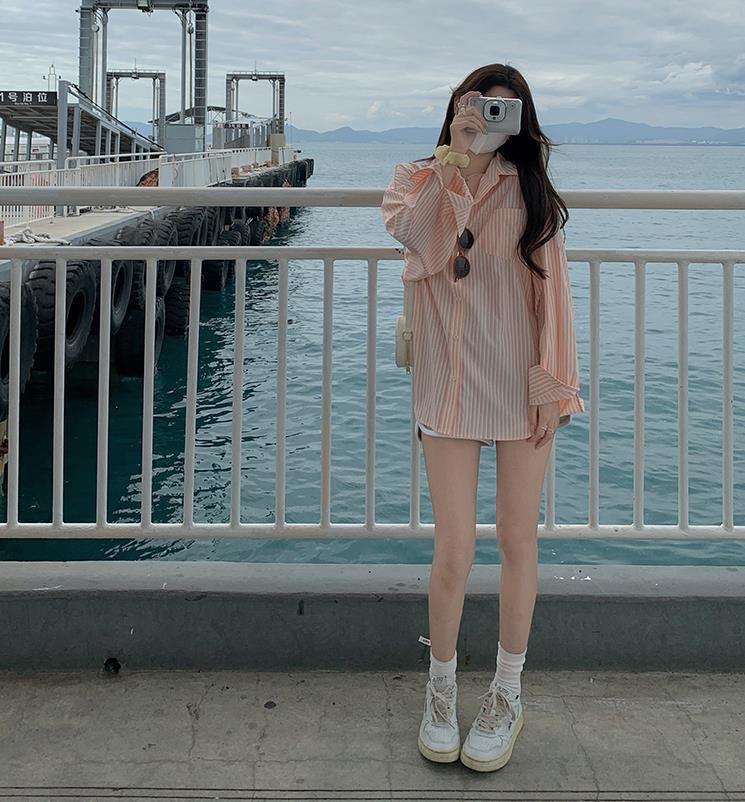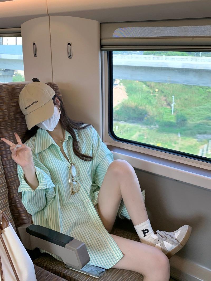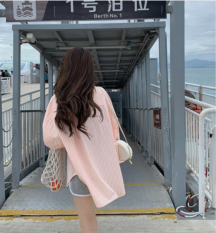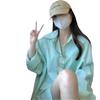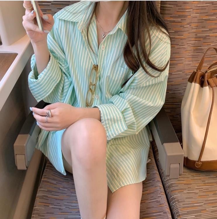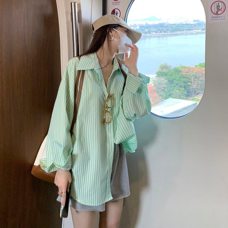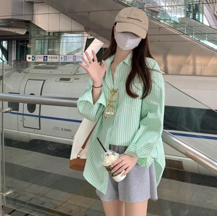 Camisa de rayas verdes de verano para mujer, de largo medio, diseño Sense Niche, de alta gama, holgada, tipo cárdigan exterior, con protección solar.
