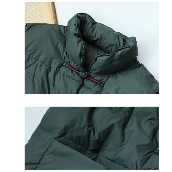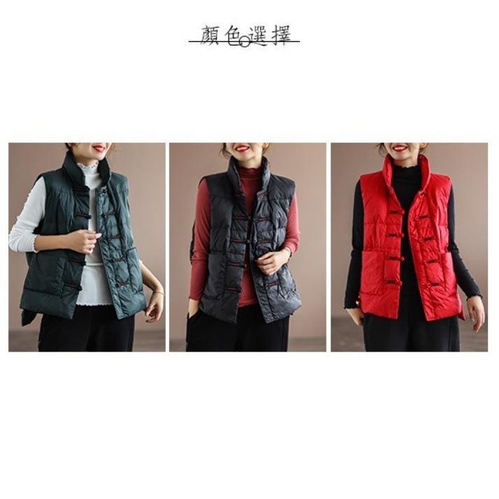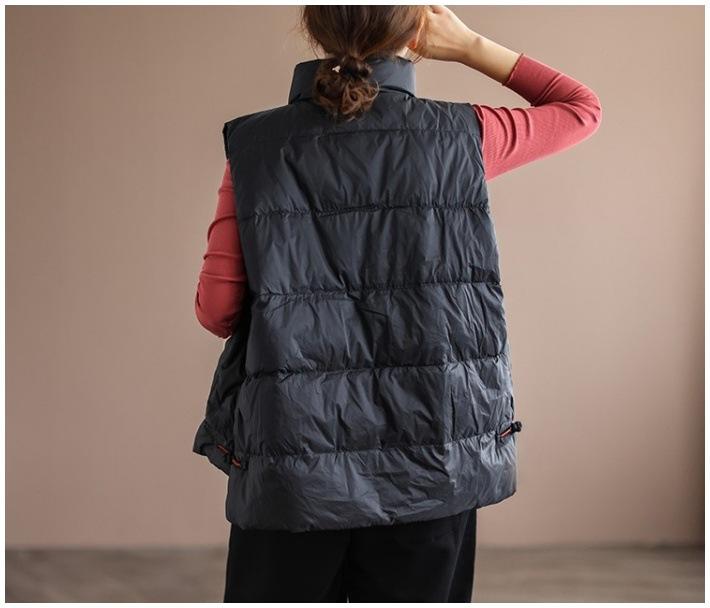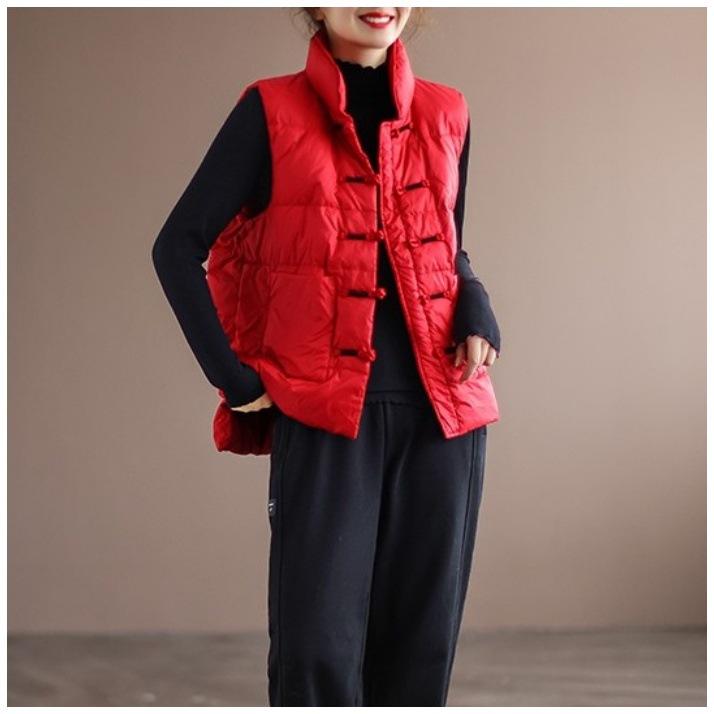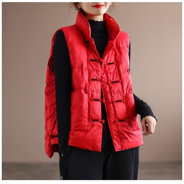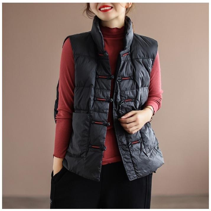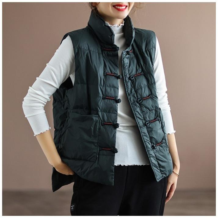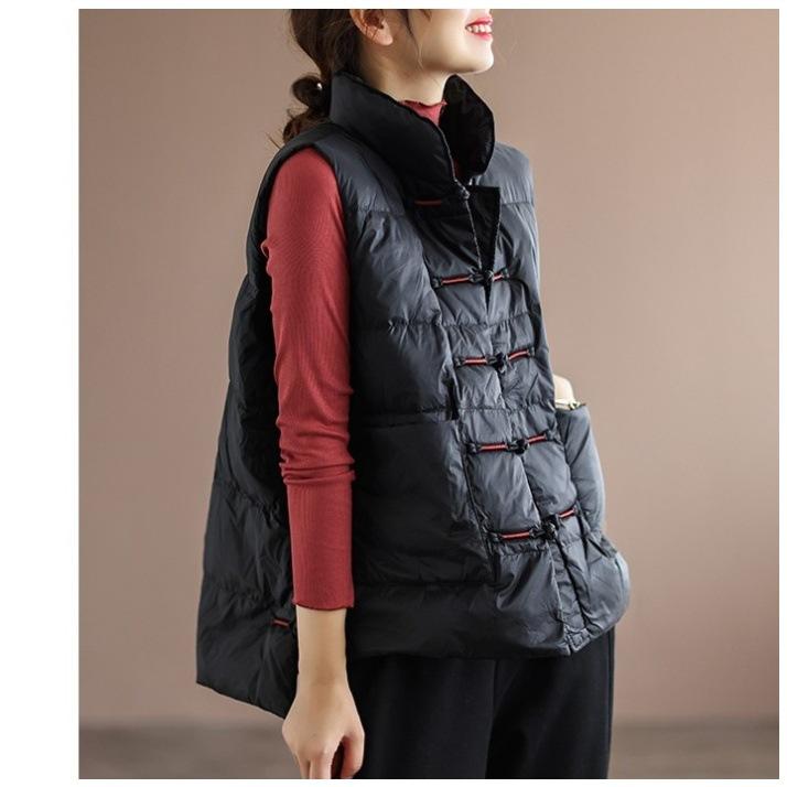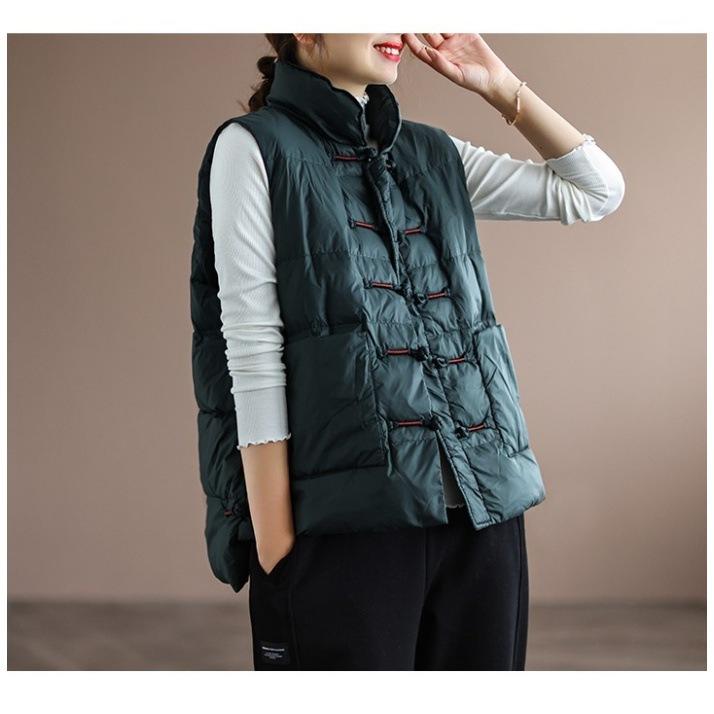 Chaleco fino con hebilla de estilo étnico retro de invierno de los años 90, chaleco de plumón de pato blanco con cuello alto y parte superior cálida para mujer