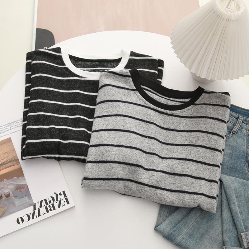 Camisa sencilla de rayas de cachemira para otoño e invierno, nueva camiseta de manga larga con cuello redondo, estilo coreano, holgada, versátil y adelgazante, estilo occidental.