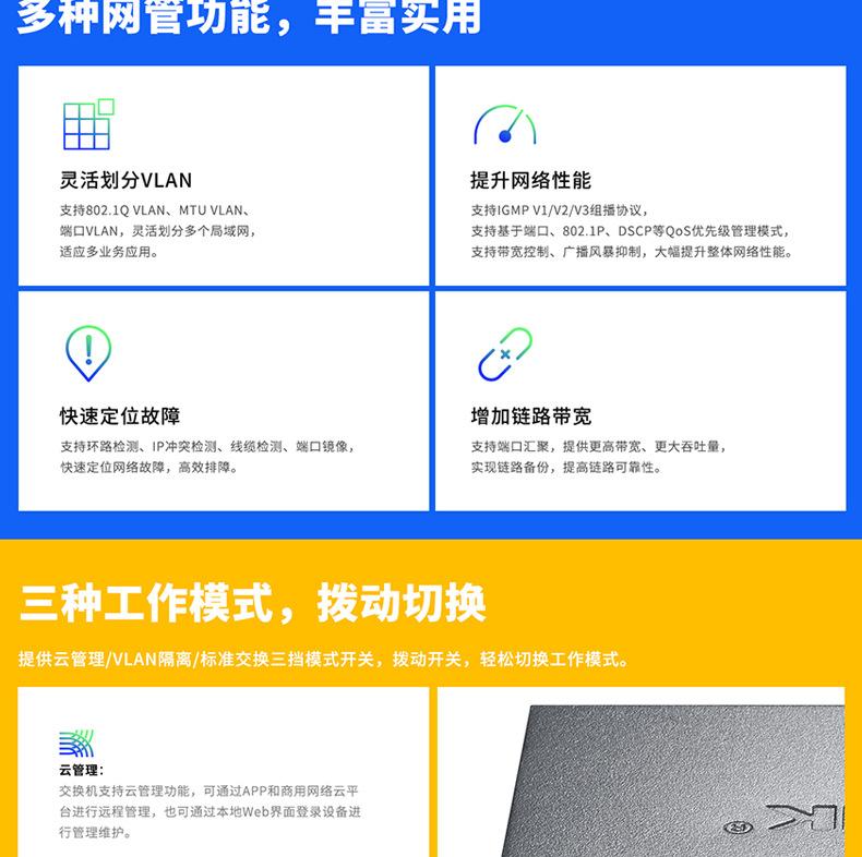 | Interruptor de modo | Admite tres modos de trabajo: gestión de la nube, aislamiento de VLAN y conmutación estándar | ||||