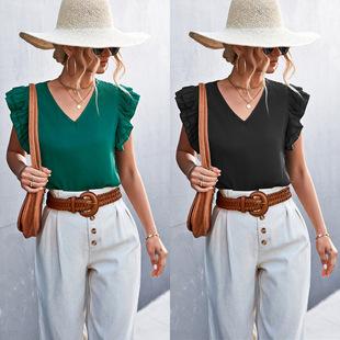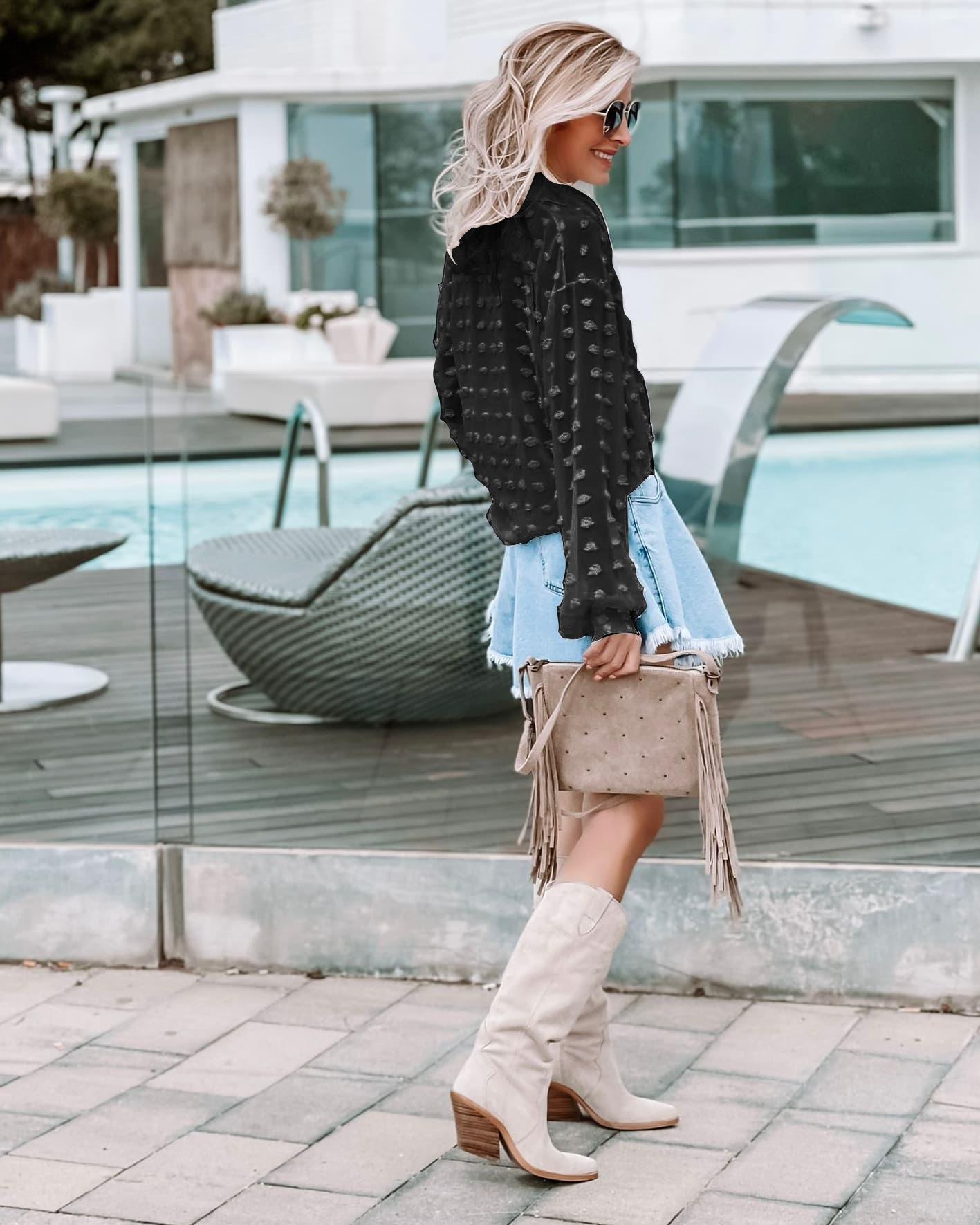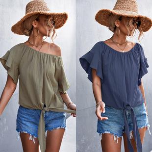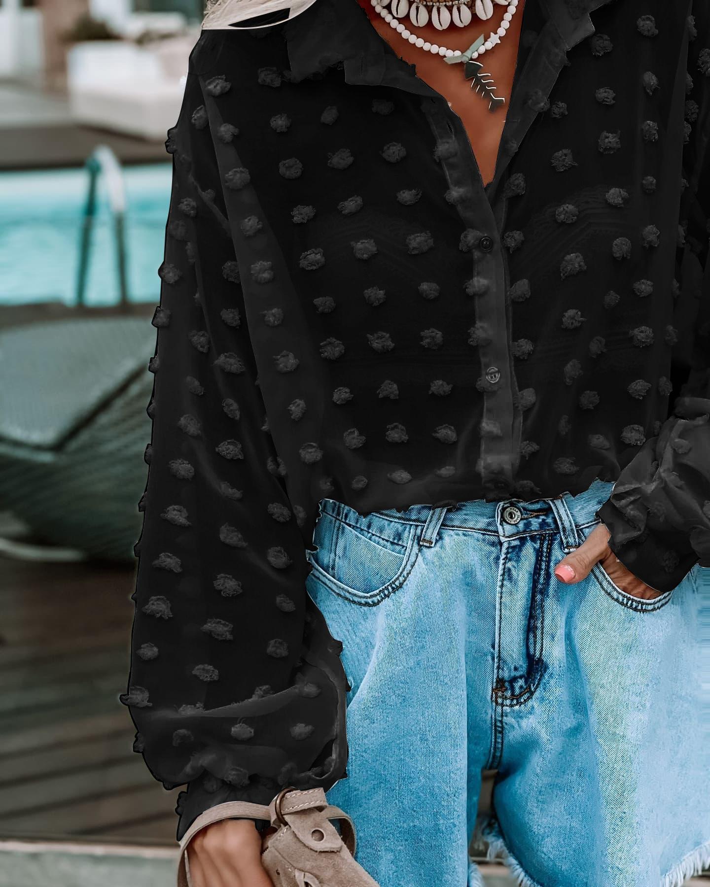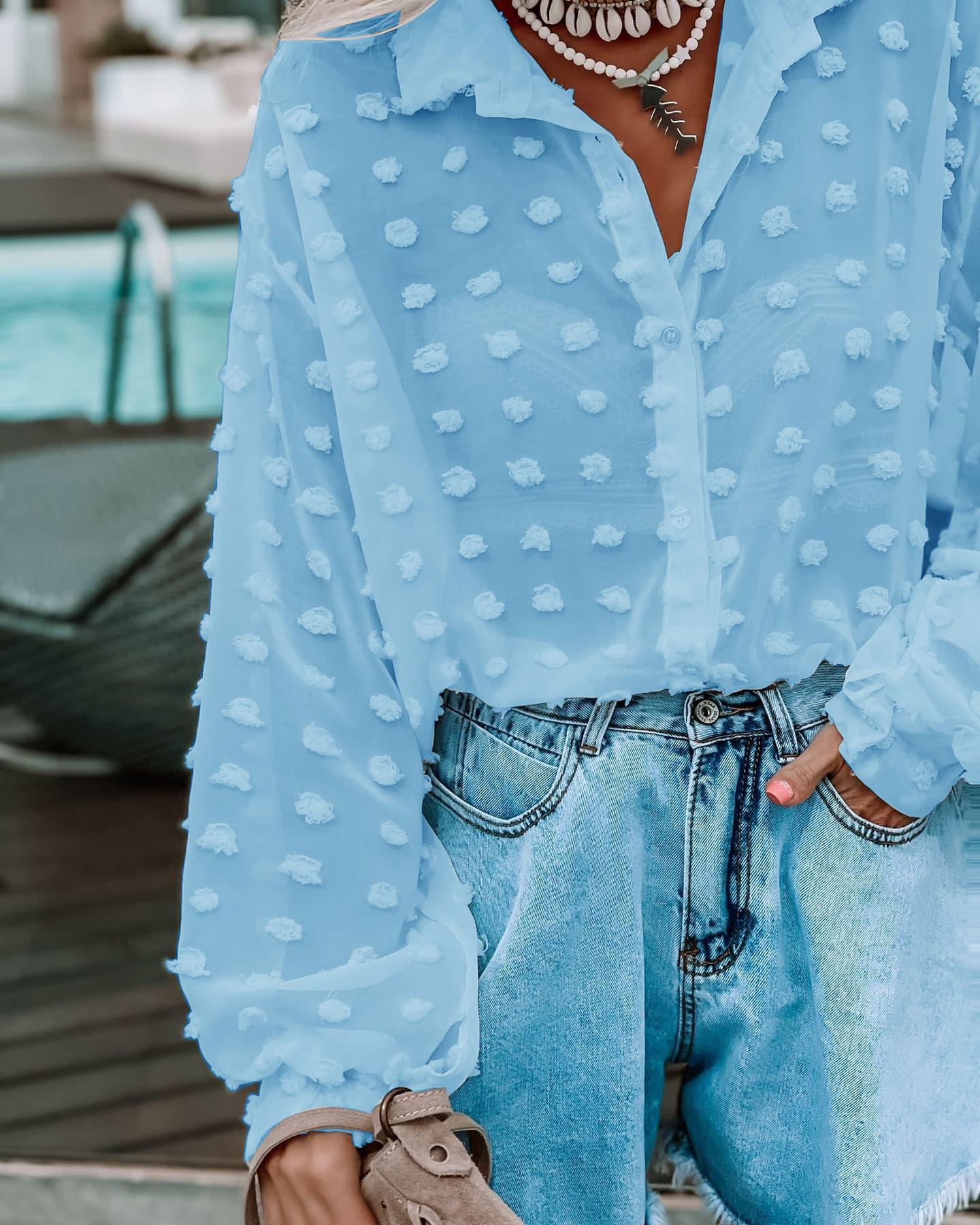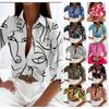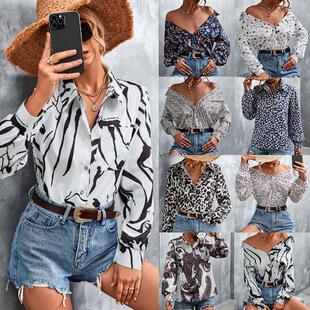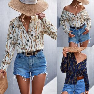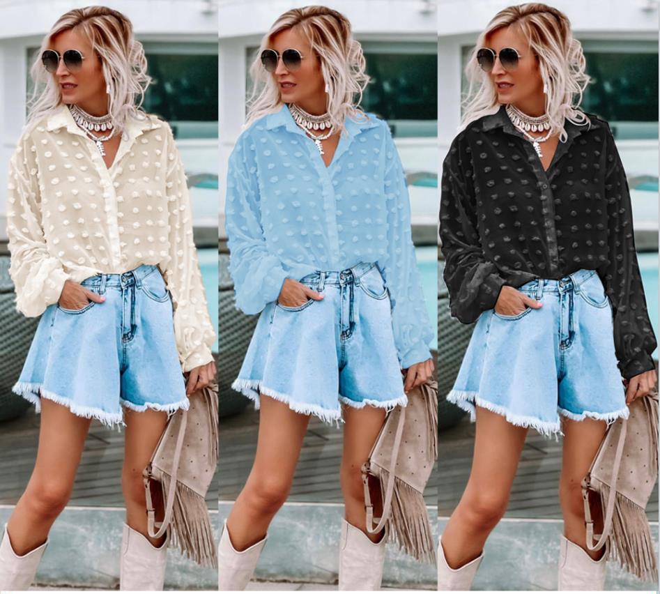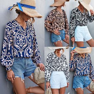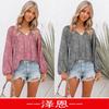 Primavera y Otoño 2022 Transfronterizo Amazon wish Venta Caliente Color Sólido Cuello en V Jacquard Manga Larga Camisa Top Mujer