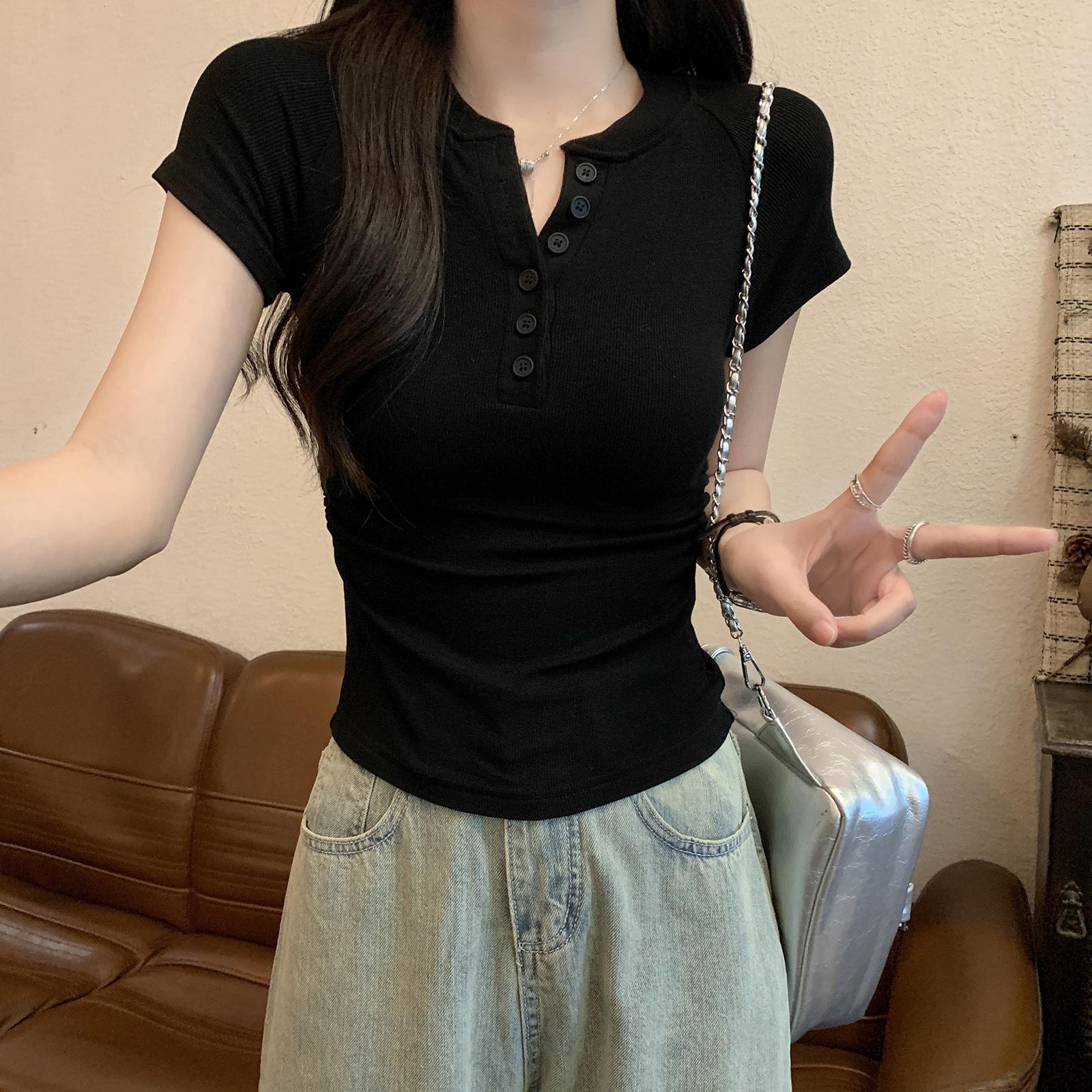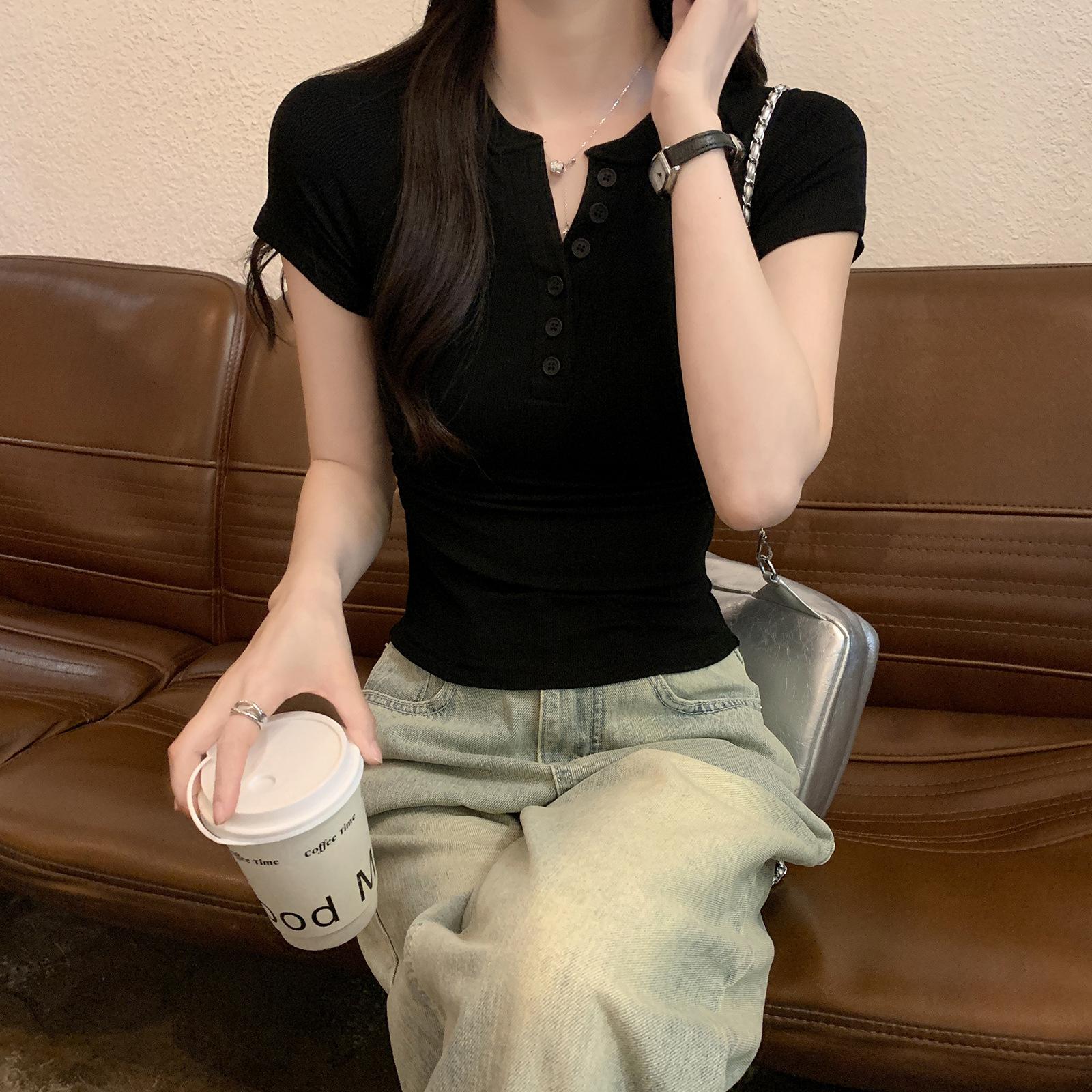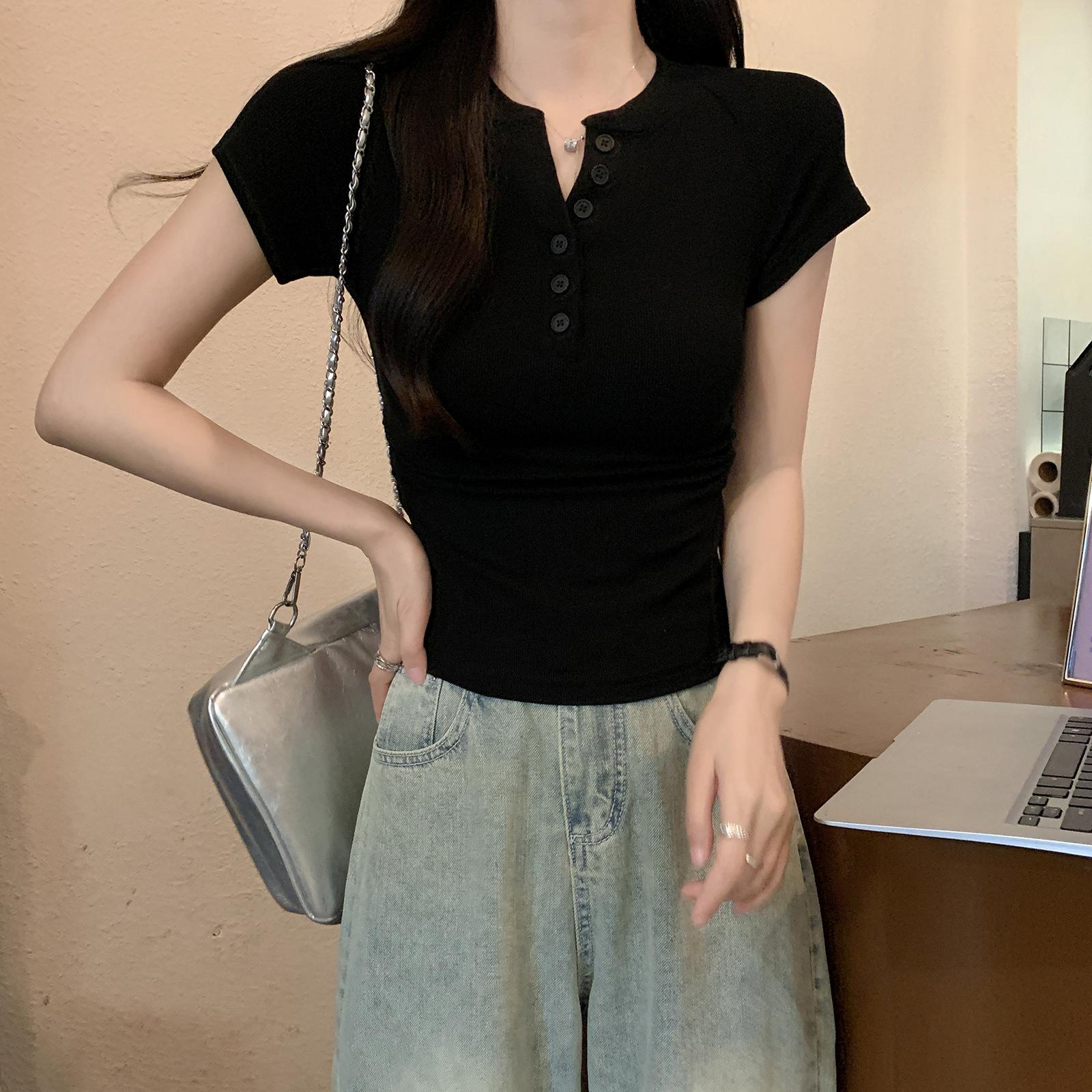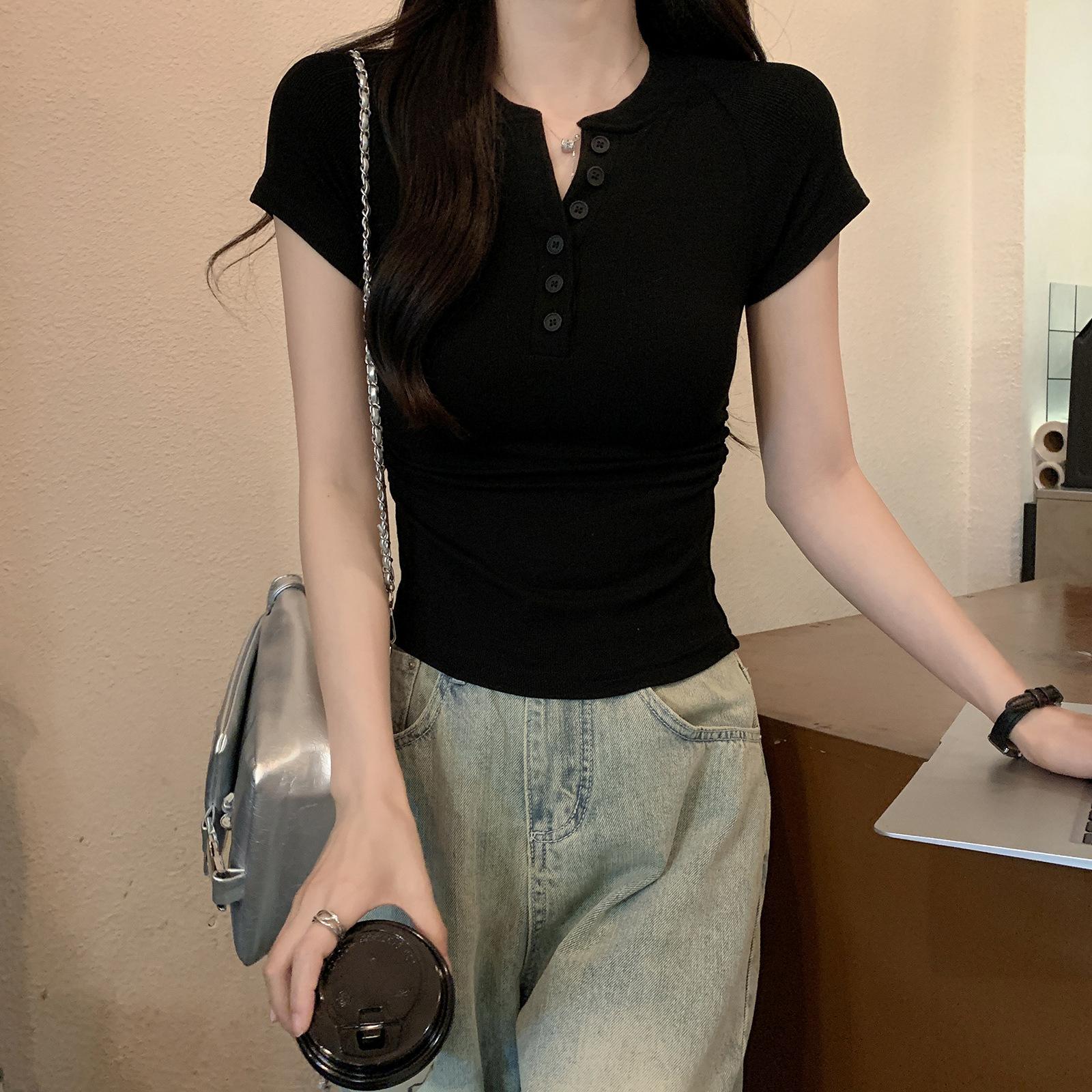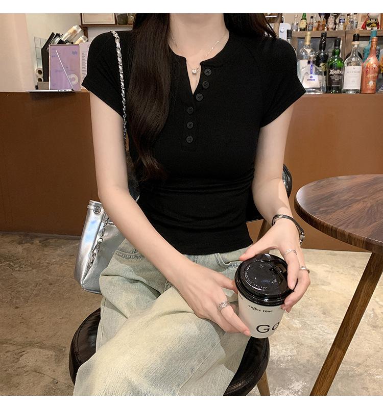 Camiseta de manga corta con cuello en V y botones medio abiertos para mujer, novedad de verano, chaqueta corta ajustada y arrugada para chica sexy para el cabello