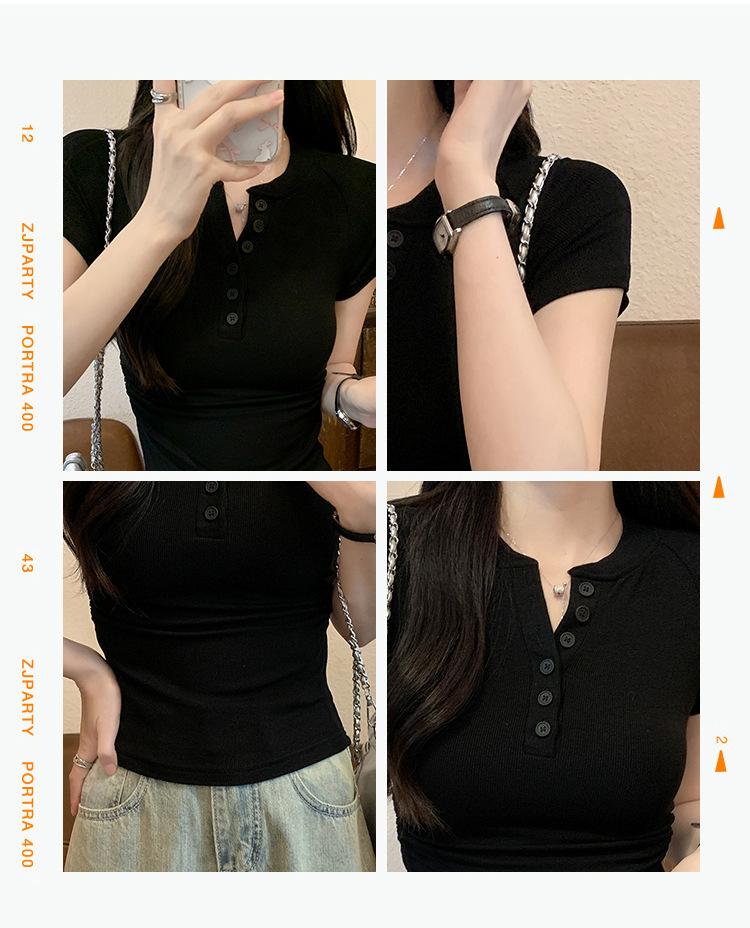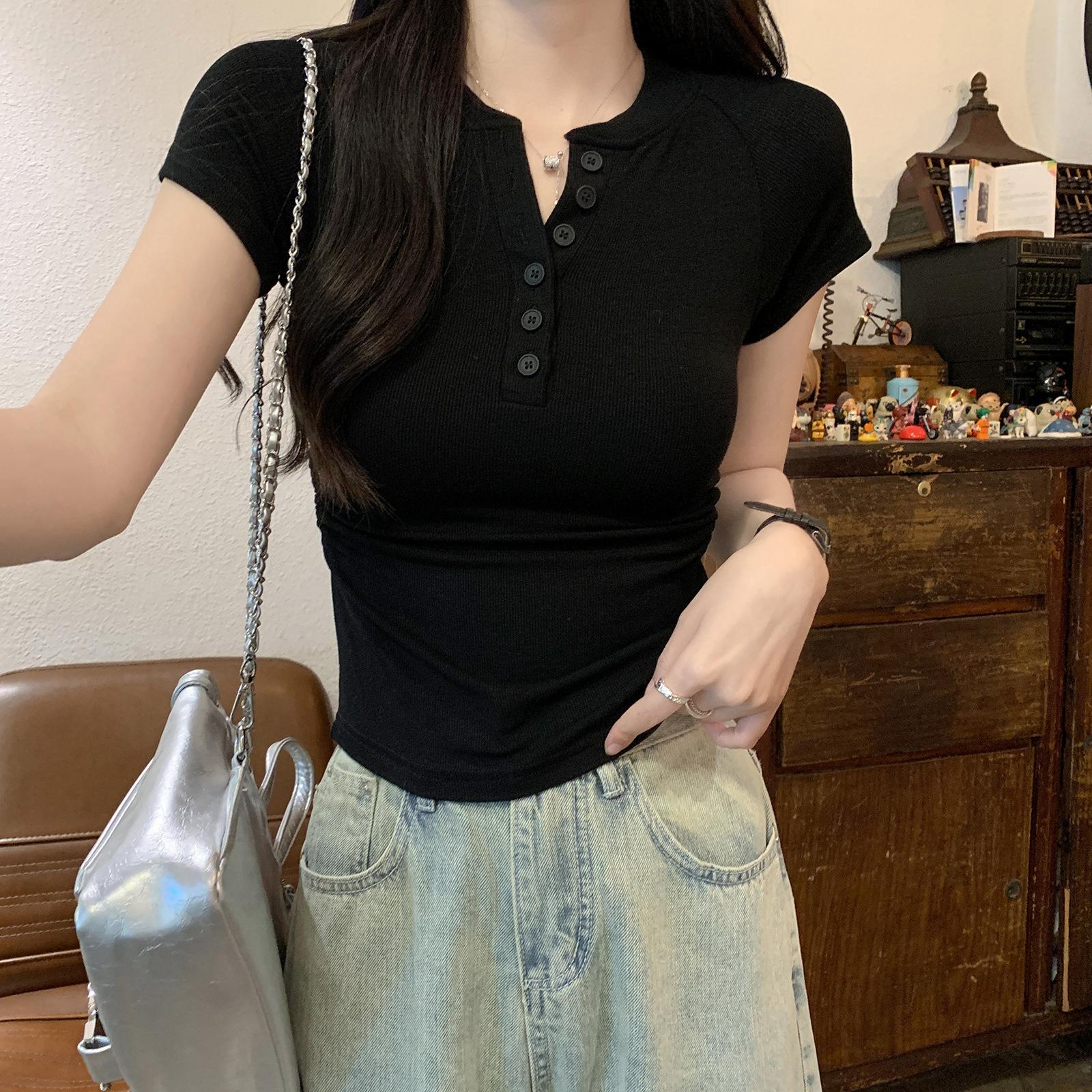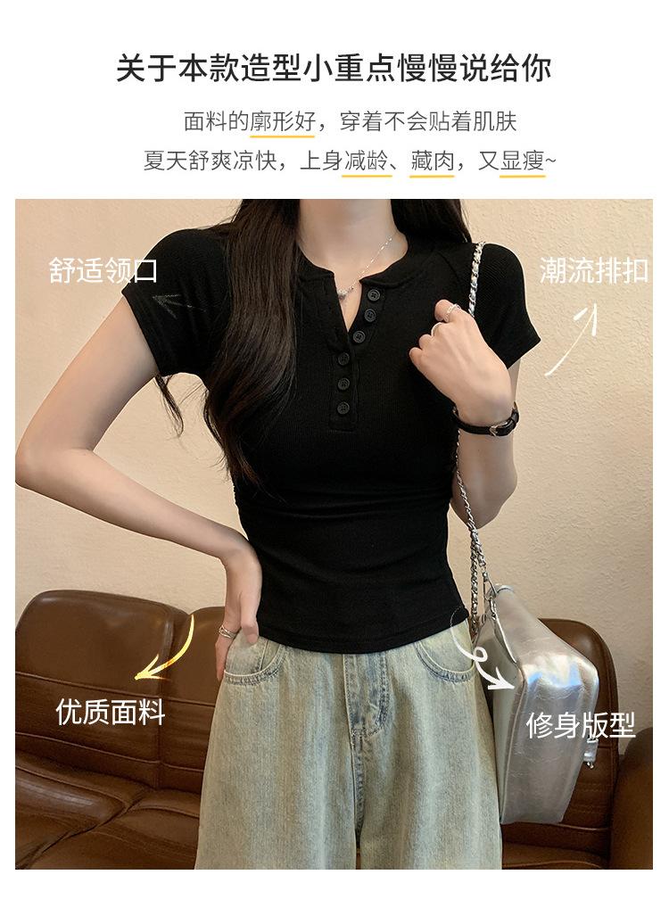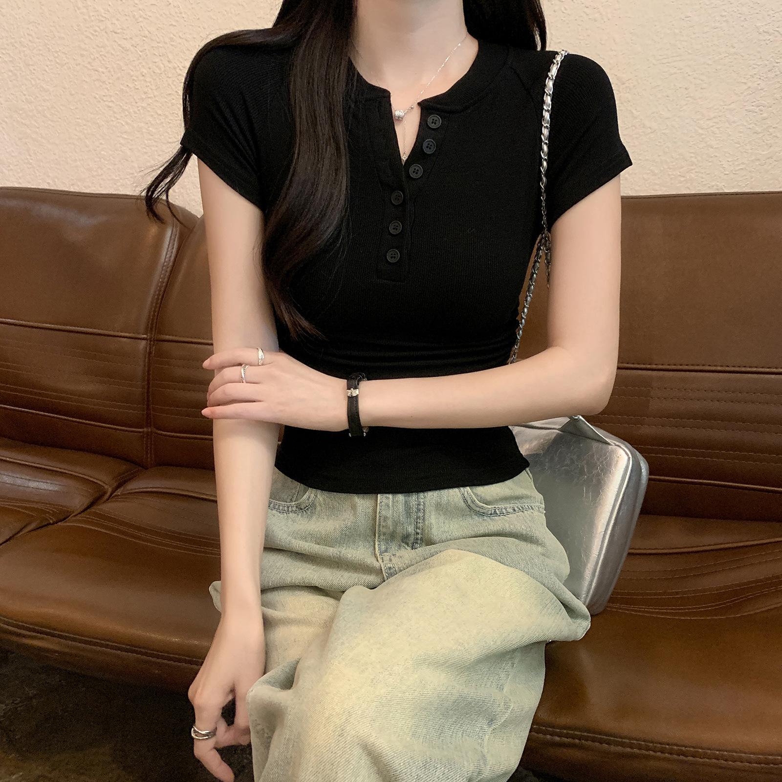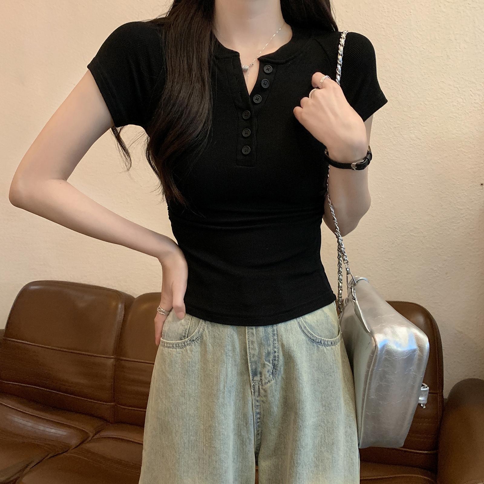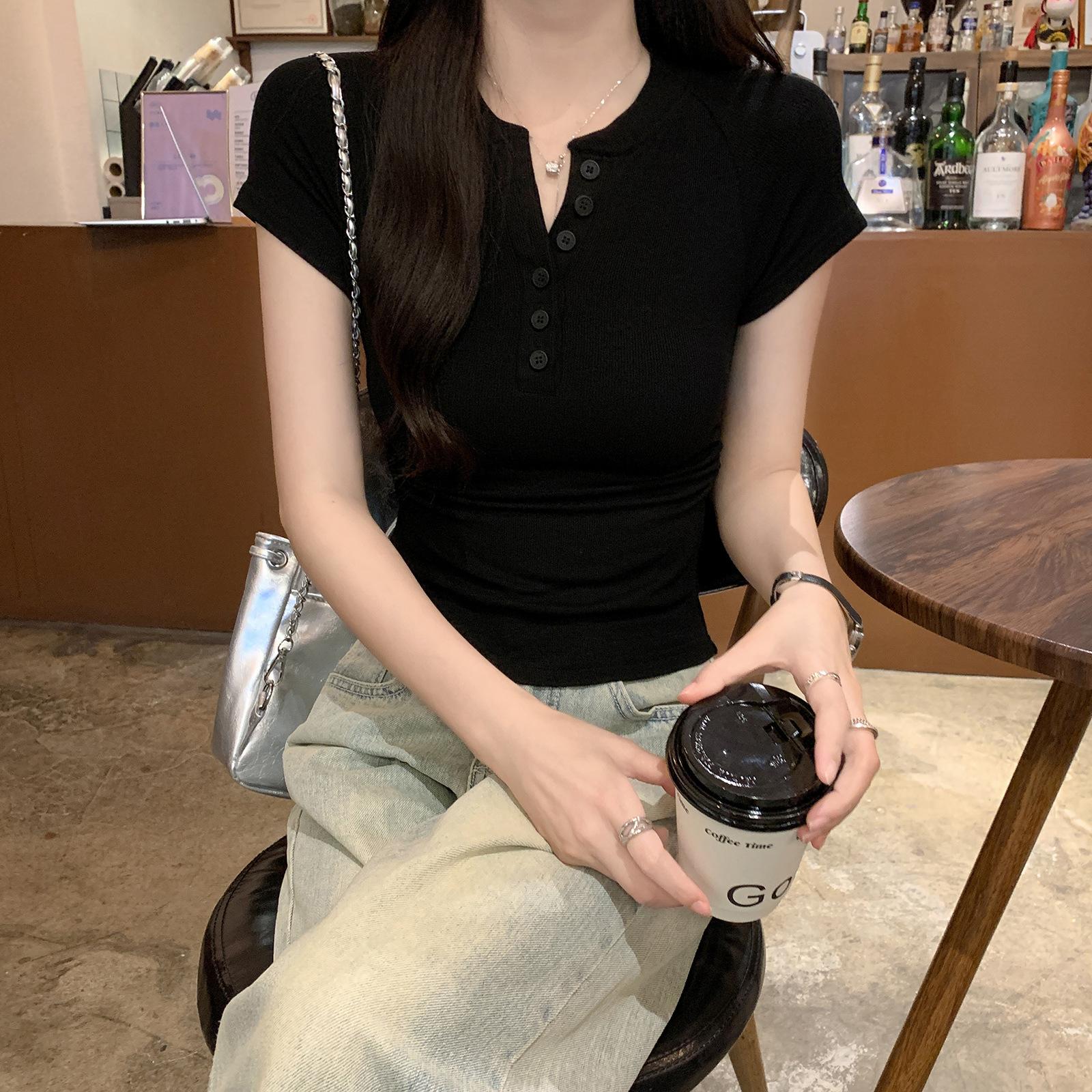 Camiseta de manga corta con cuello en V y botones medio abiertos para mujer, novedad de verano, chaqueta corta ajustada y arrugada para chica sexy para el cabello