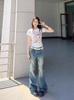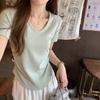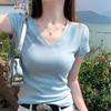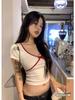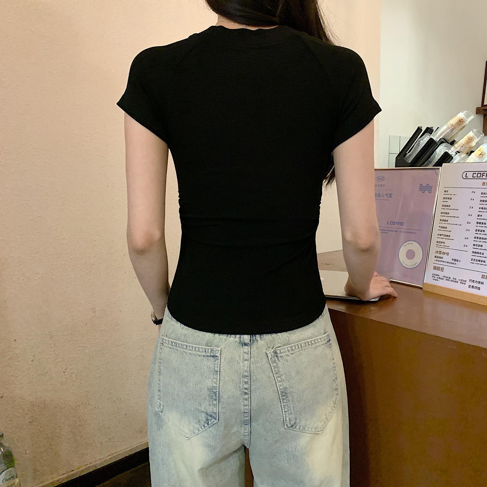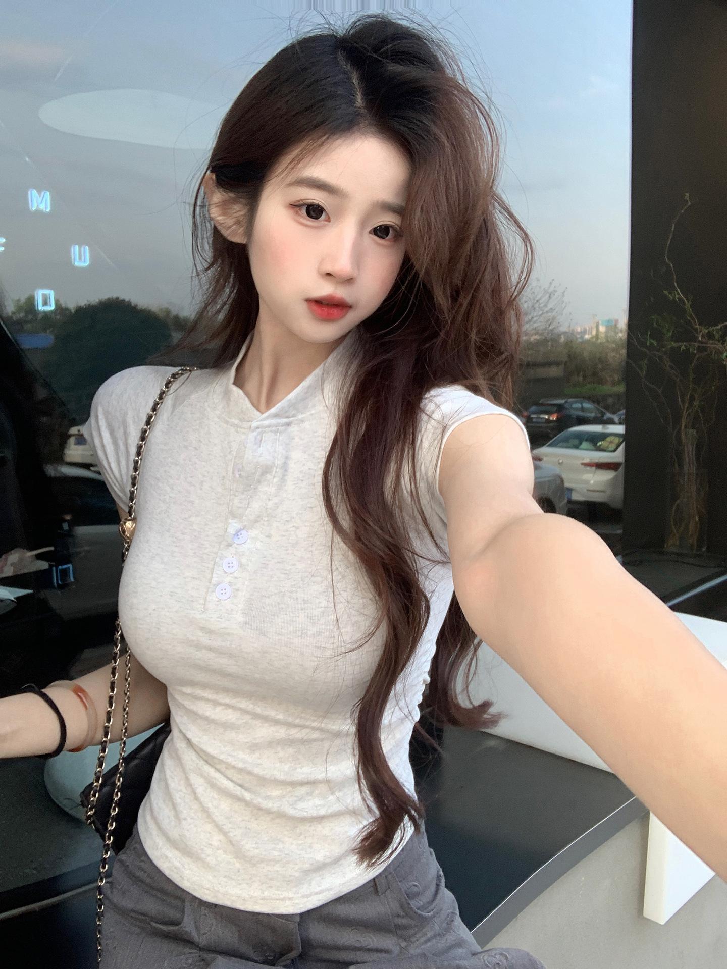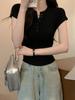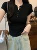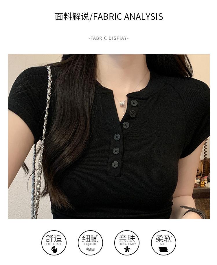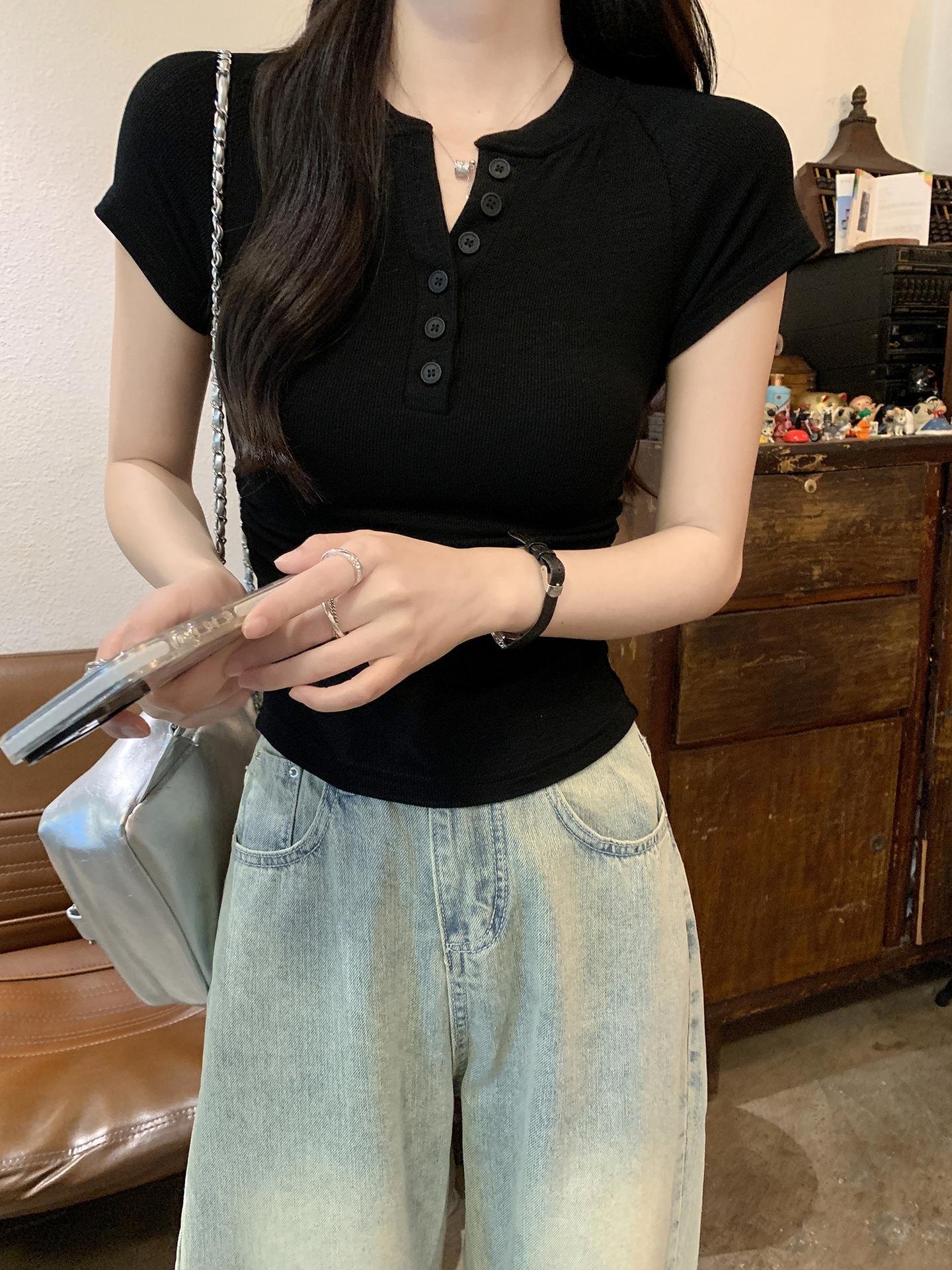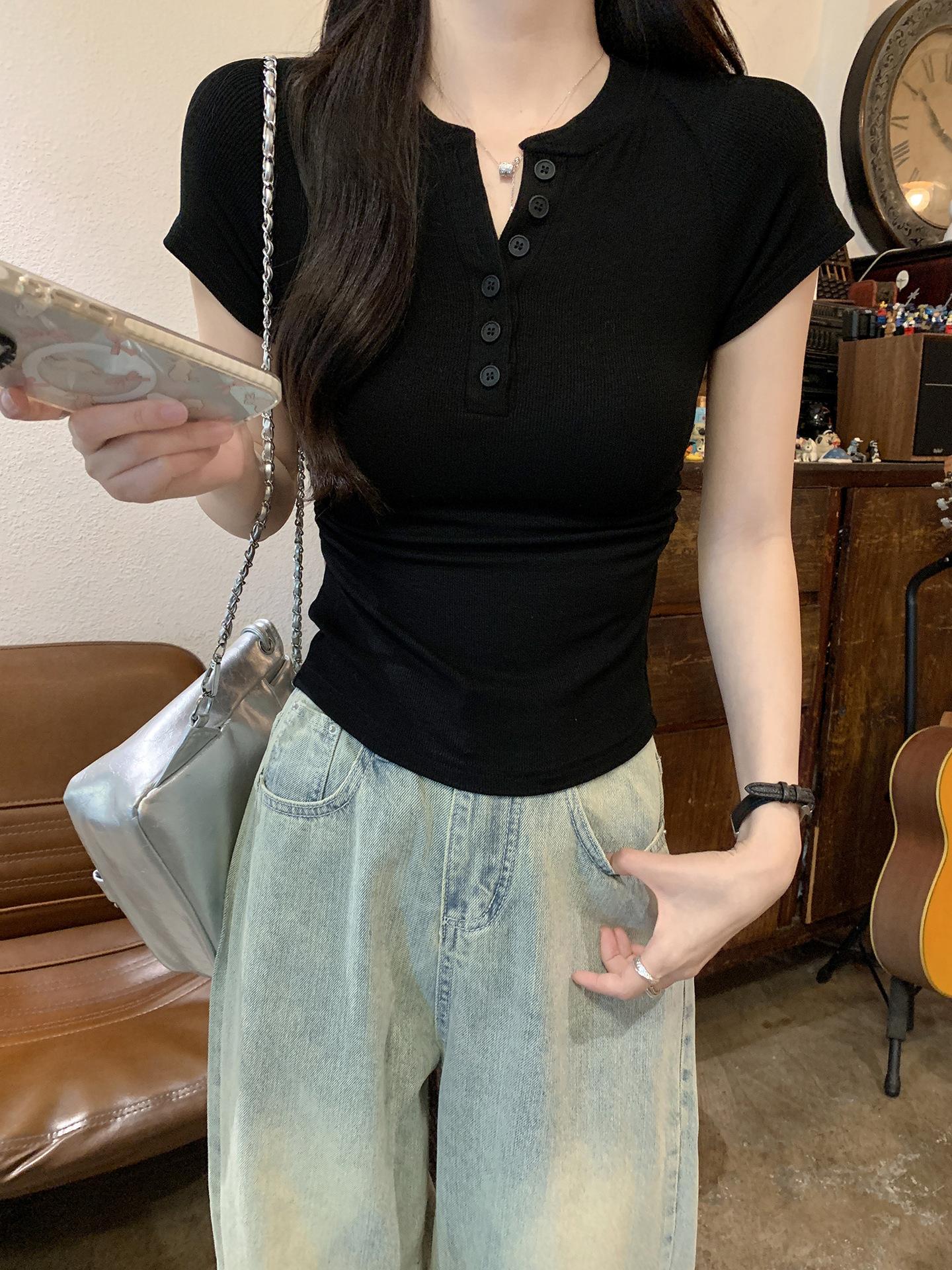 Camiseta de manga corta con cuello en V y botones medio abiertos para mujer, novedad de verano, chaqueta corta ajustada y arrugada para chica sexy para el cabello