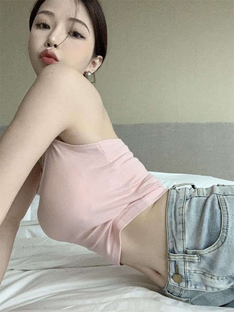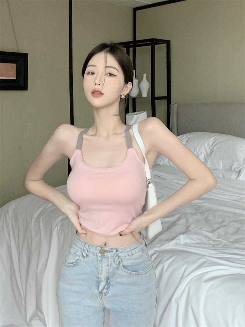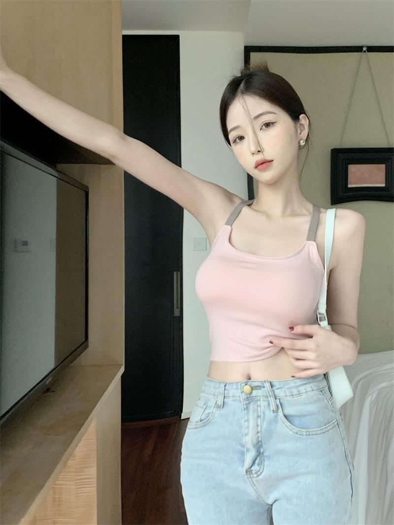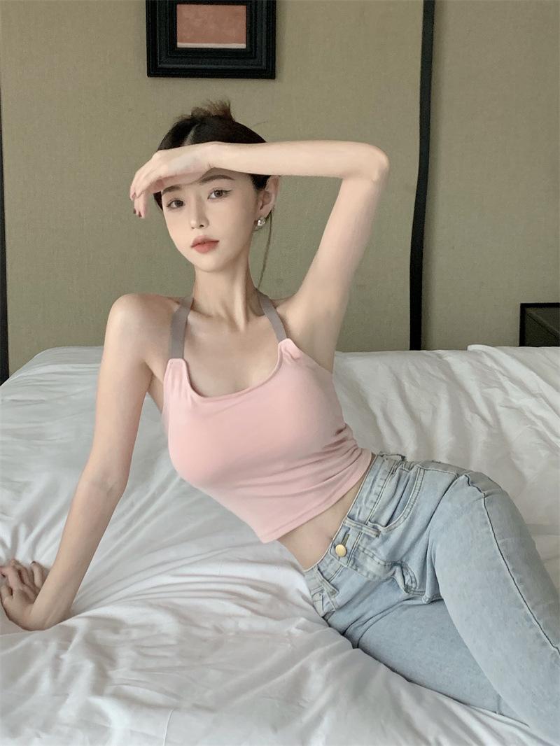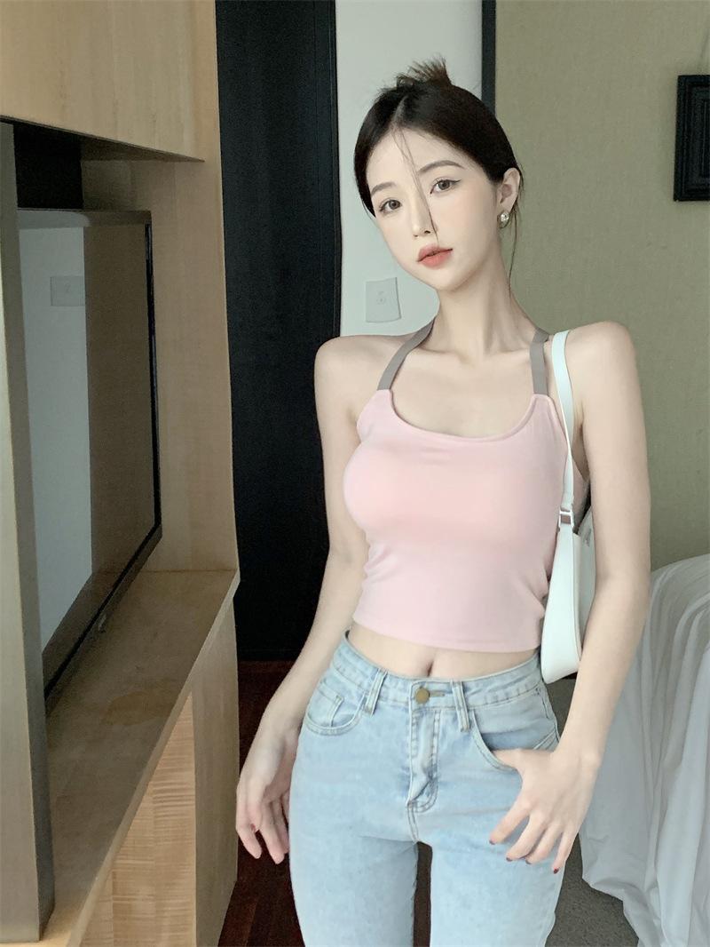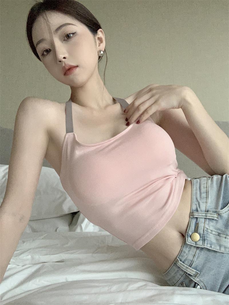 Chaleco pequeño con tirantes de cuello rosa para mujer, ropa interior de verano corta y exterior con almohadilla para el pecho, hermoso sujetador de espalda, top de base de una pieza