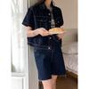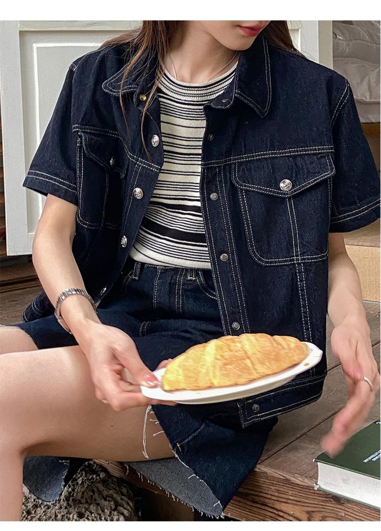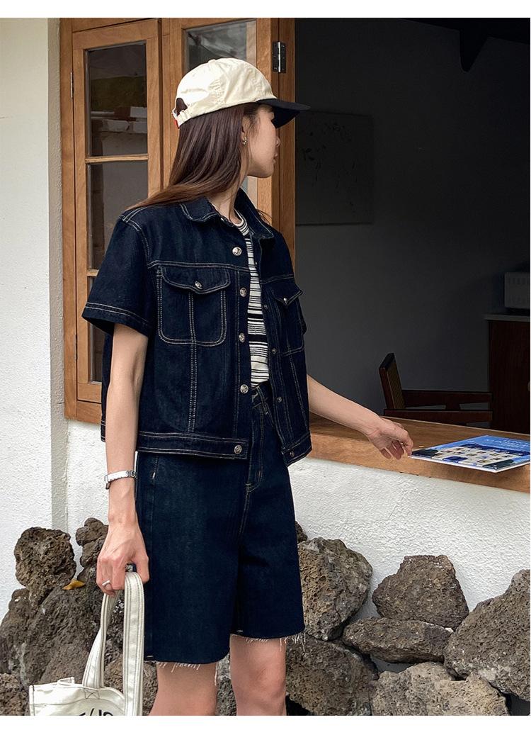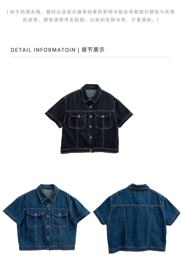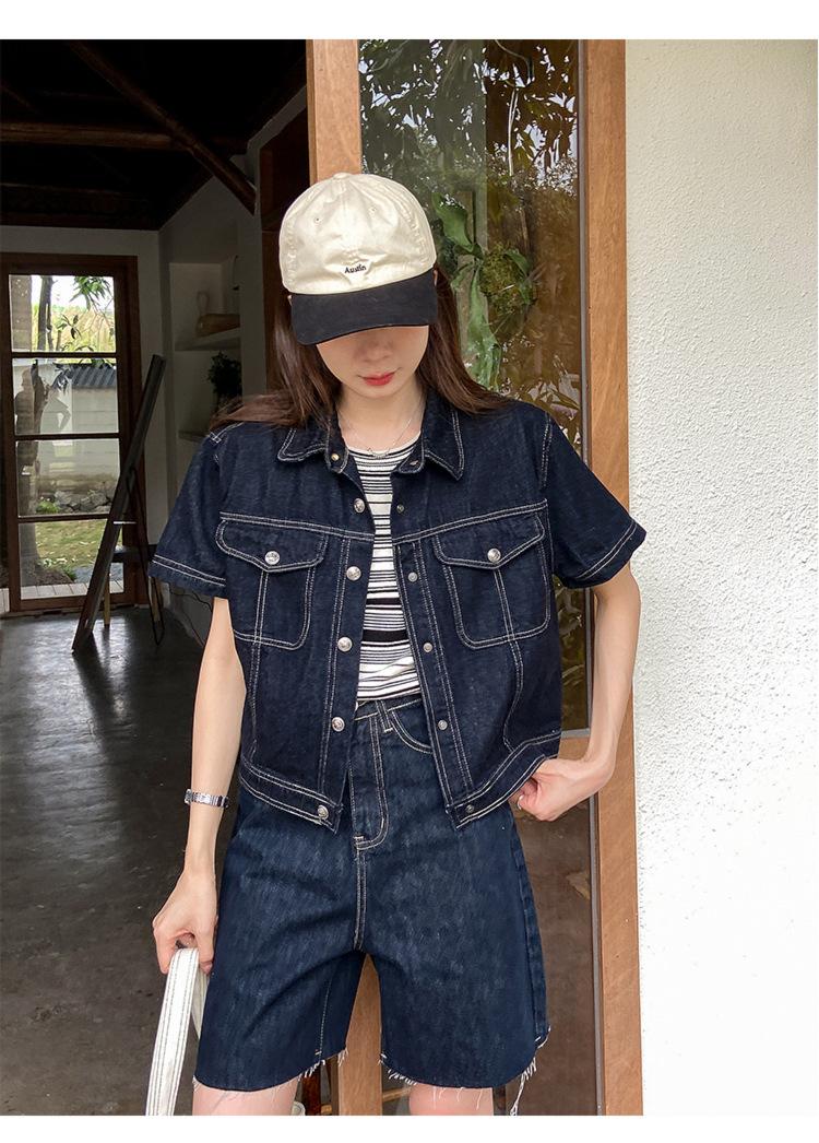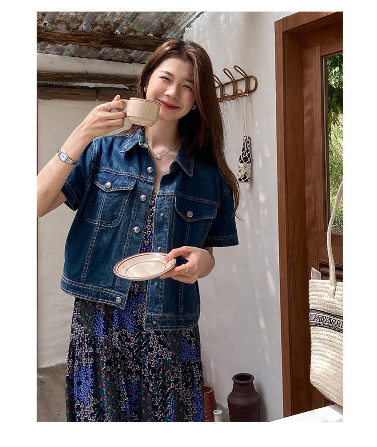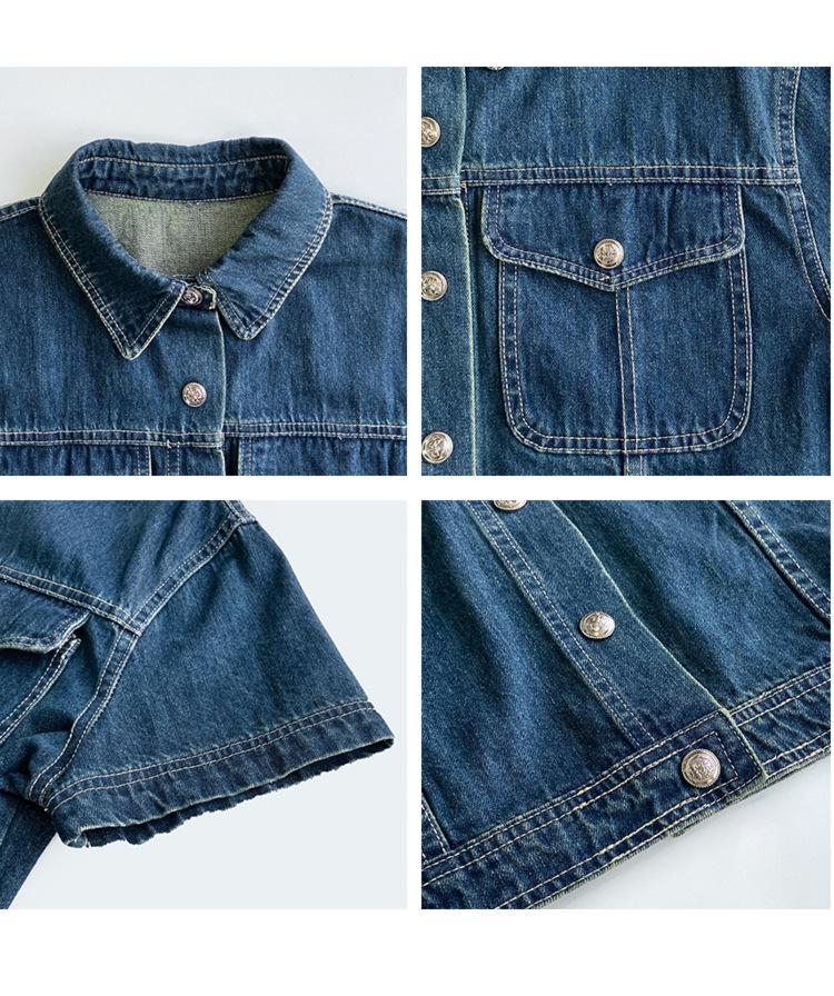 Chamarra de mezclilla de manga corta estilo retro para mujer 2024 Primavera Nuevo estilo Solapa Bolsillo de doble solapa Pantalones Top de trabajo 5912