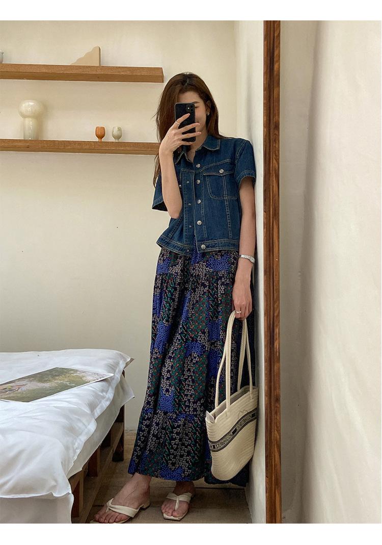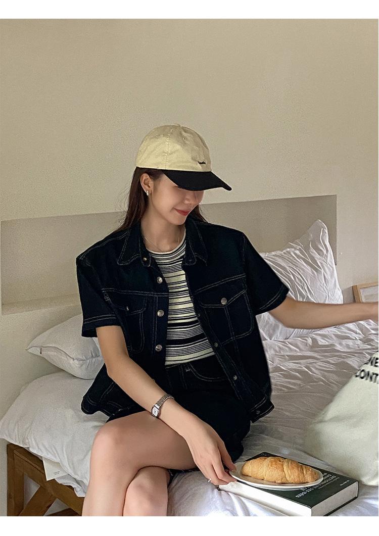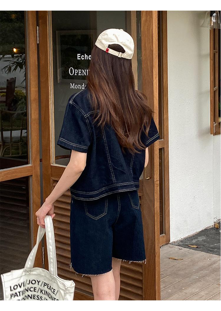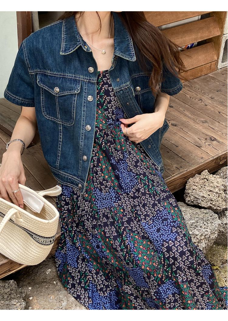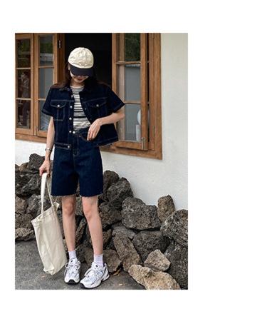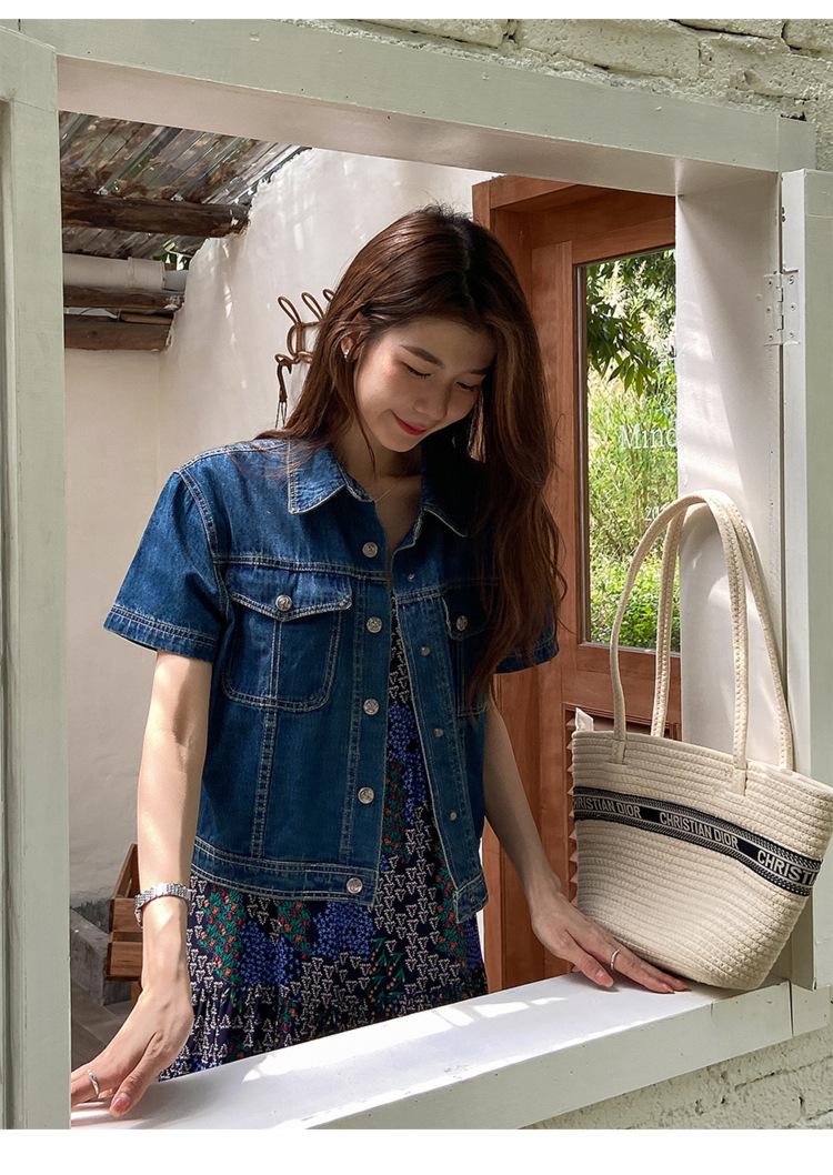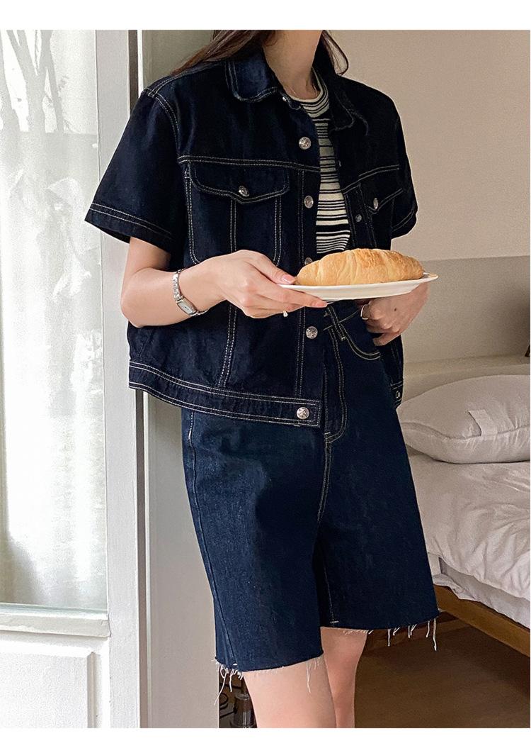 Chamarra de mezclilla de manga corta estilo retro para mujer 2024 Primavera Nuevo estilo Solapa Bolsillo de doble solapa Pantalones Top de trabajo 5912