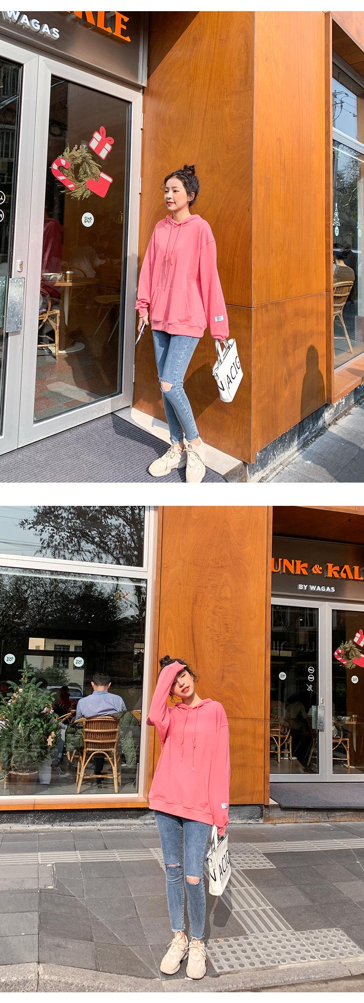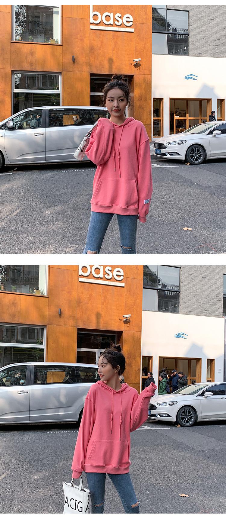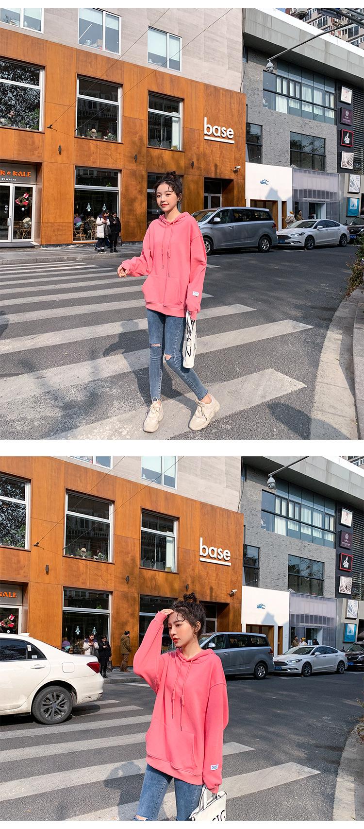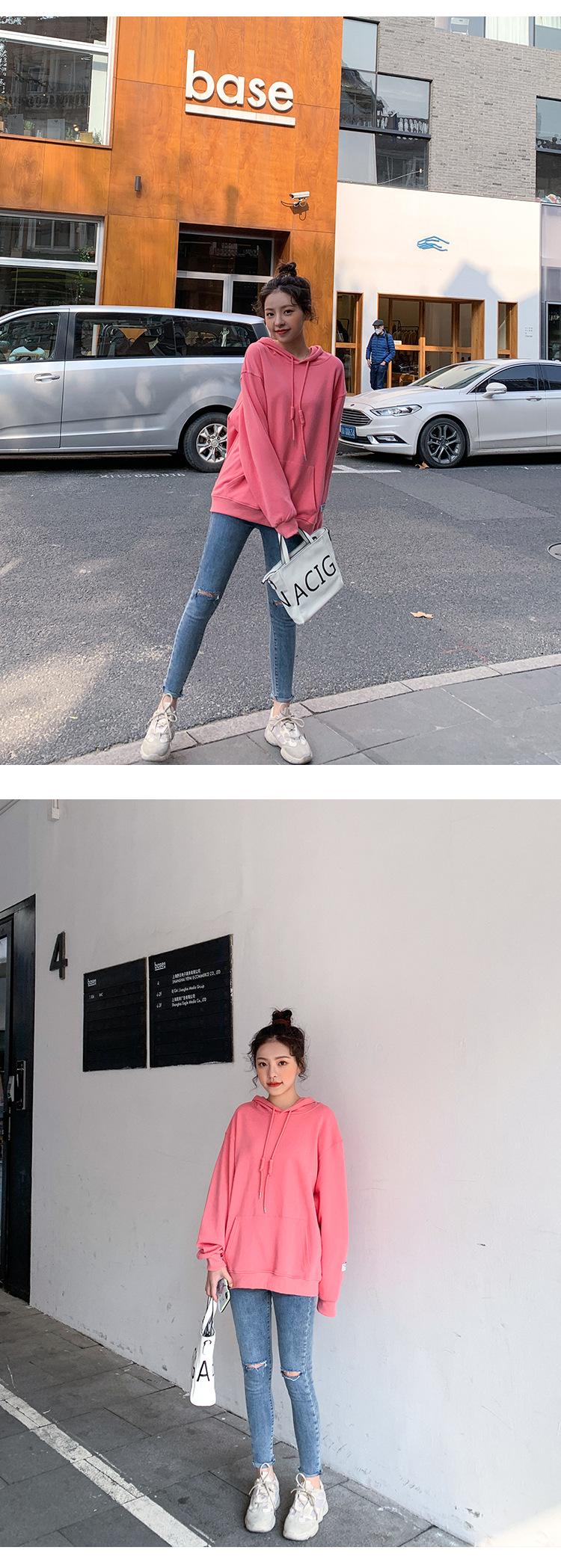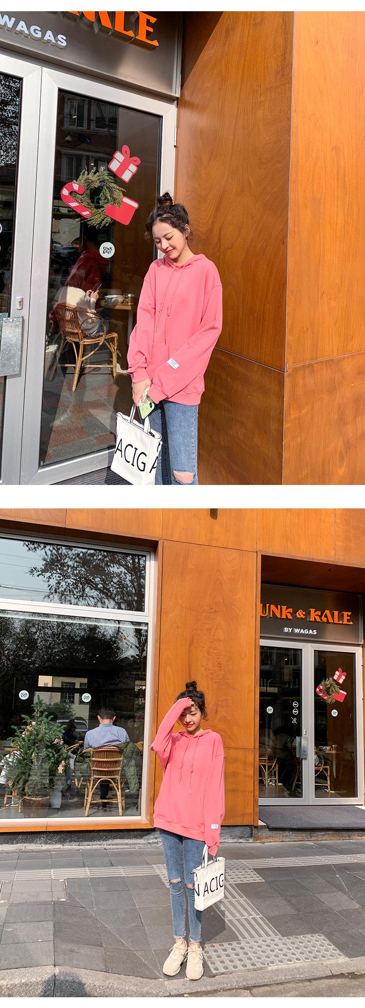 Leche de Papaya Primavera y Otoño Nuevo Estilo Coreano con Capucha Bolsillo Grande Rojo Rosa Color Sólido Casual con Capucha Suéter Holgado Ajustado