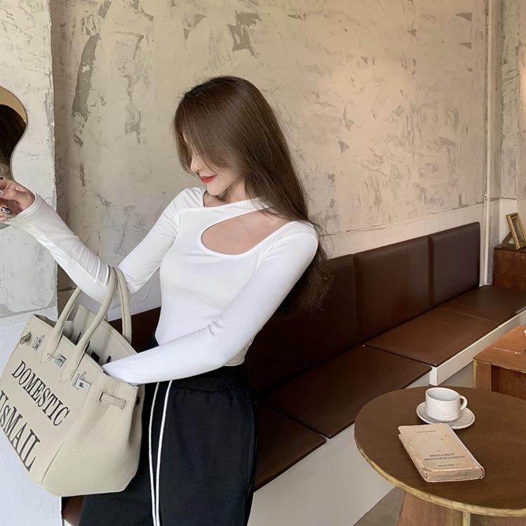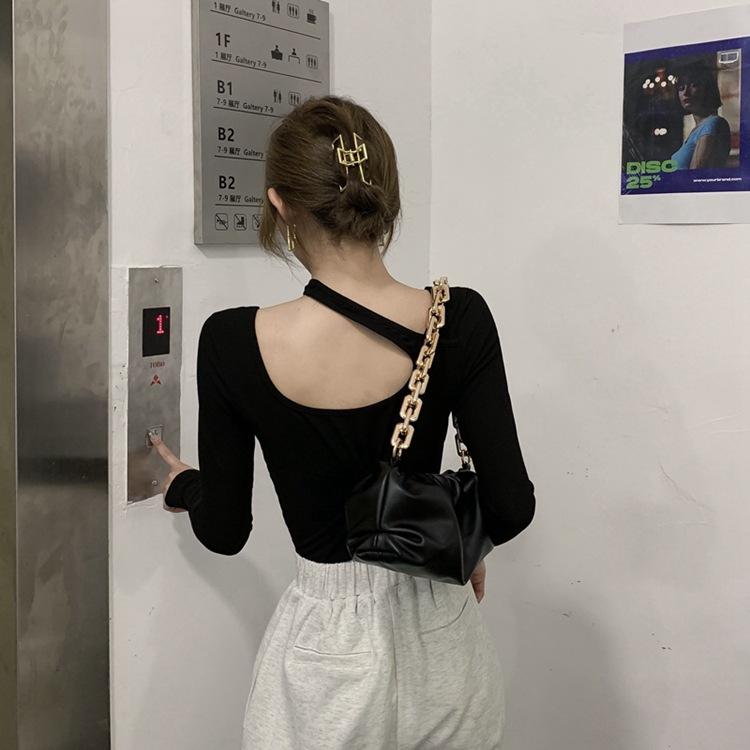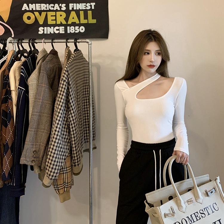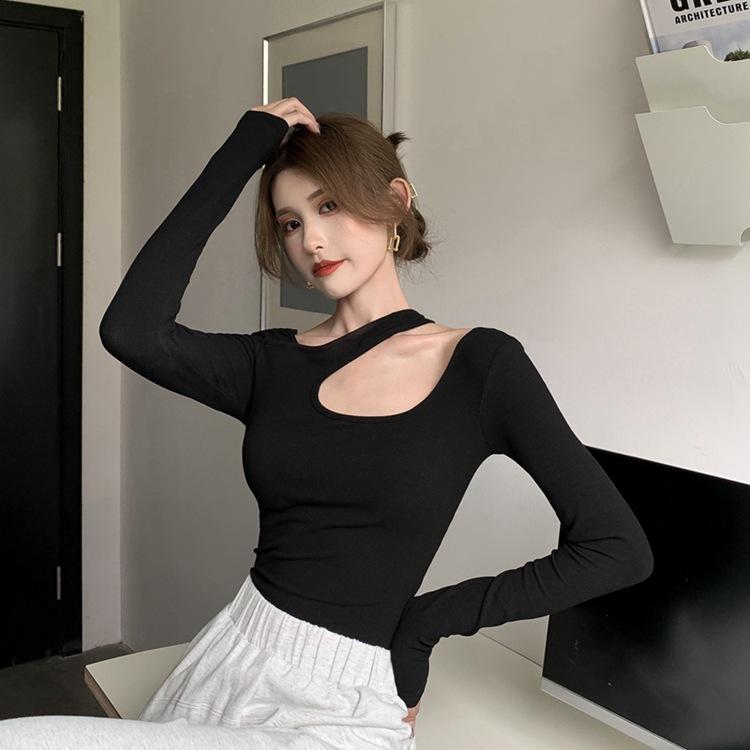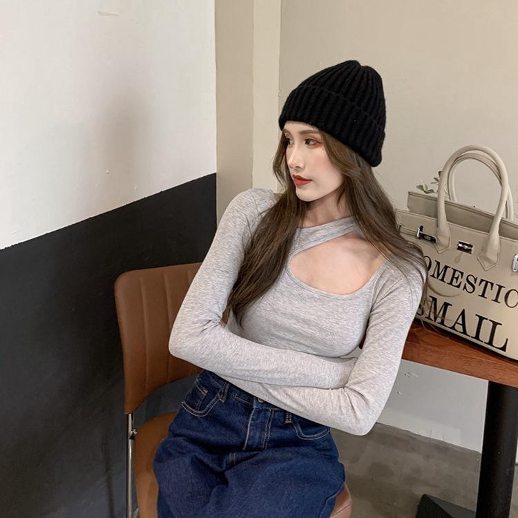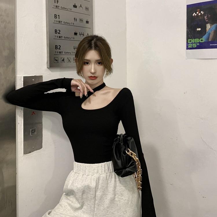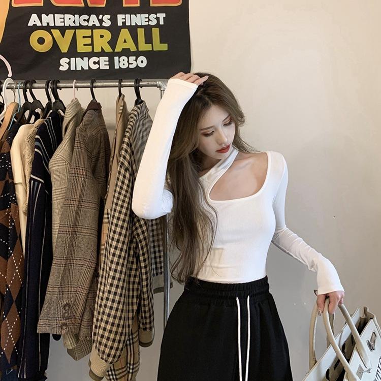 Otoño 2025 Nuevo Sexy Ajustado Top de Estudiante con Sentido del Diseño, Camiseta de Manga Larga con Cuello Halter, Camiseta Básica para Mujer, Trendy