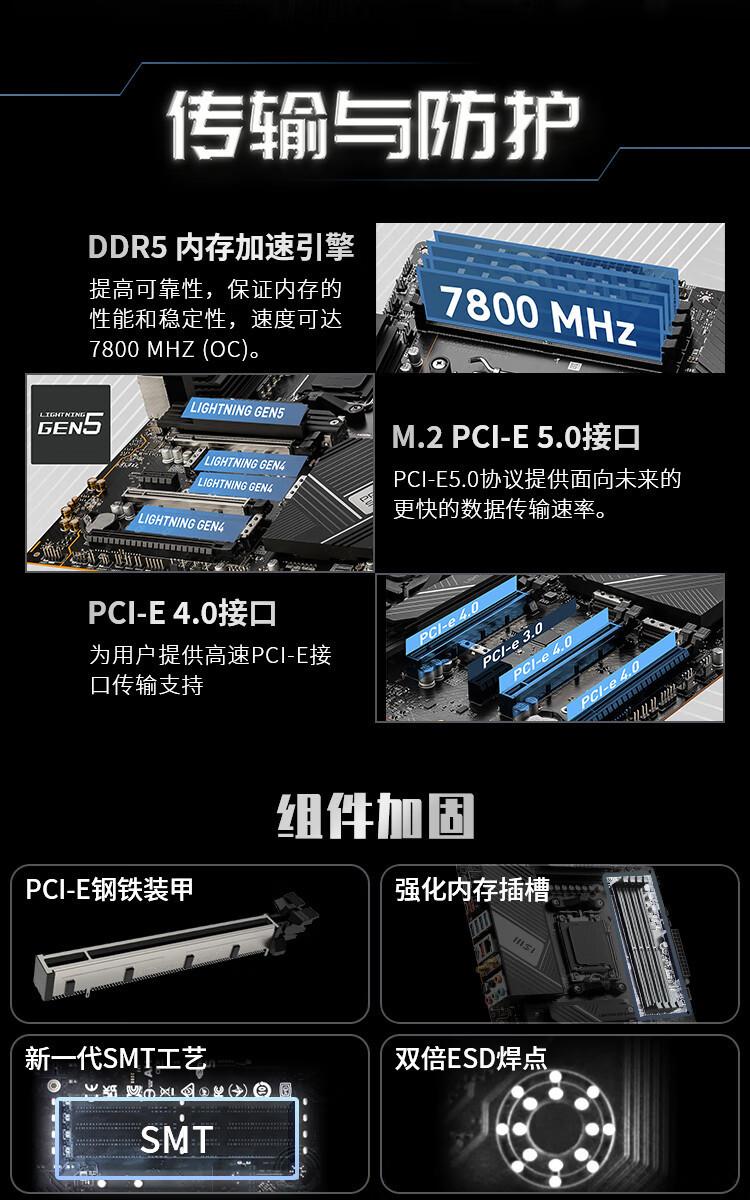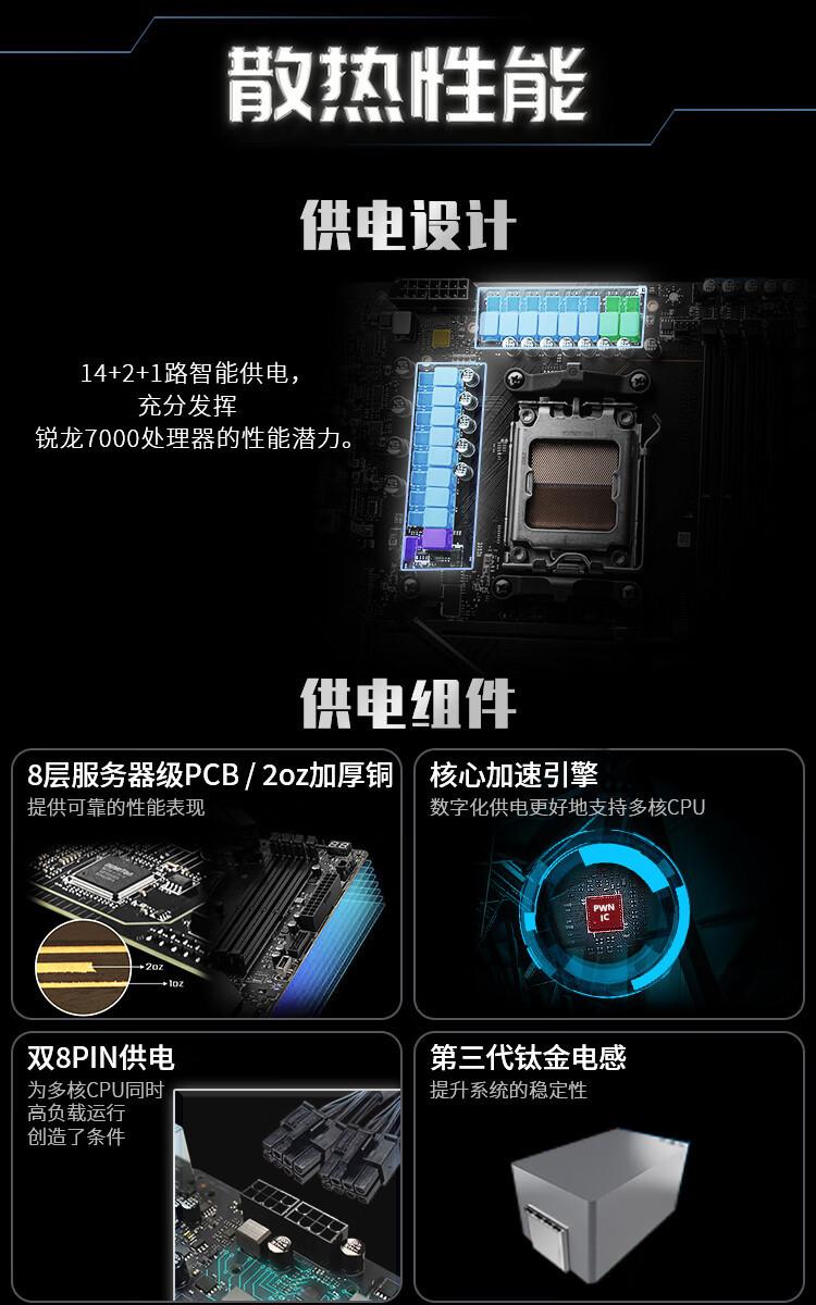 Sistema de Alimentación de Riel Dúo 14+2+1: Suministro de energía de núcleo de CPU de 14 fases (80A DR.MOS por fase) + suministro de energía SOC de 2 fases + suministro de energía auxiliar de 1 fase, conInterfaces de alimentación ProCool duales de 8 pines de alta intensidad, puede soportar establemente un Ryzen 9 7950X overclockeado a más de 5.8 GHzuk.msi.com。