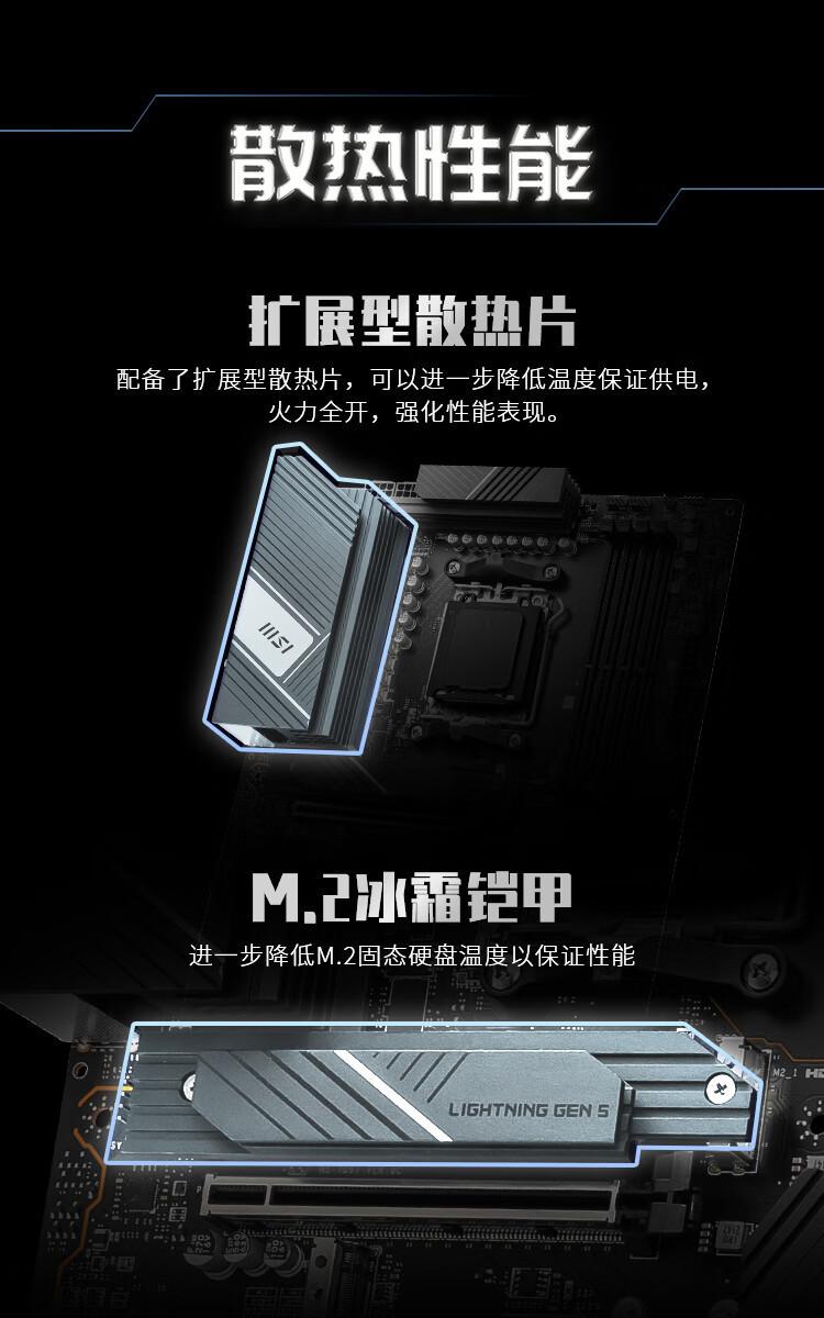 Armadura de disipación de calor de cobertura total:Área VRM equipadaDisipador de calor grande de aluminio fundido a presión, combinadoAlmohadilla Térmica de 7W/mK, lo que puede reducir la temperatura de la fuente de alimentación en más de 15℃; área del disipador de calor del chipset PCH aumentada en un 20%, suprimiendo la temperatura del chipsetMSI。