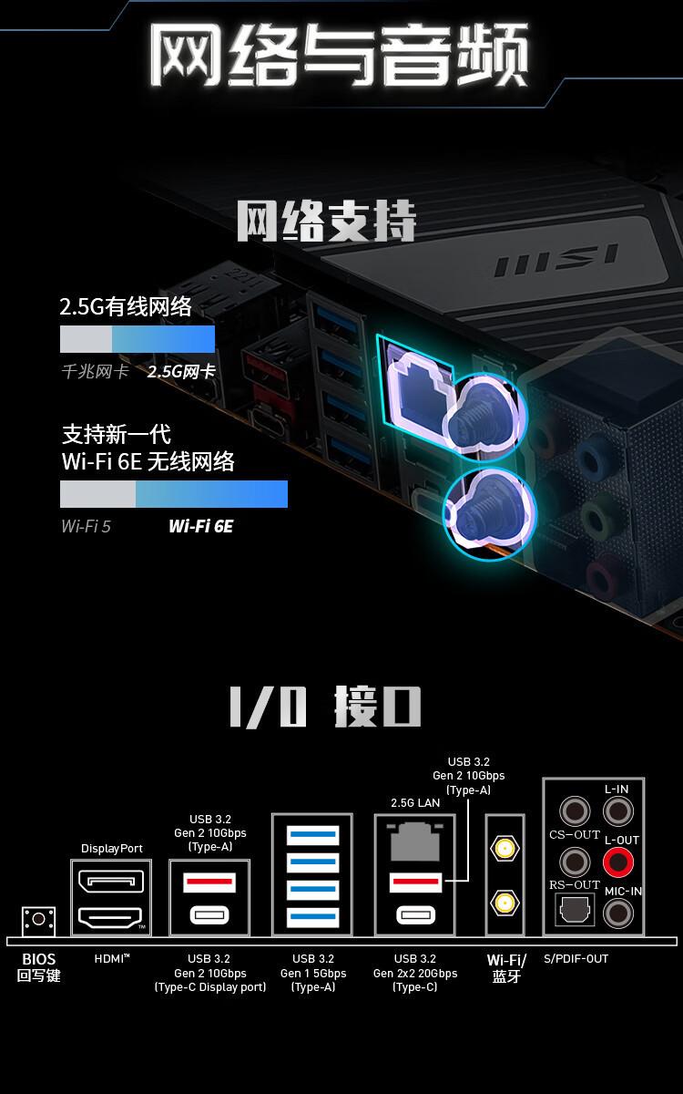 Red e Inalámbrico:1×puerto de red RJ45 de 2.5Gbps (Realtek RTL8125B), 1×tarjeta de red inalámbrica Wi-Fi 6E (802.11ax) (soporta triple banda de 2.4/5/6GHz), tasa máxima teórica 3.6Gbps, latencia reducida en 30%; Bluetooth 5.2 soporta conexión de dispositivos de bajo consumo.