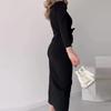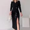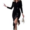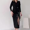 Otoño 2024 nuevo europeo y americano transfronterizo Amazon transfronterizo color sólido cuello en V diseño de cintura plisada vestido con abertura