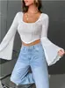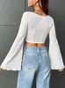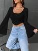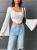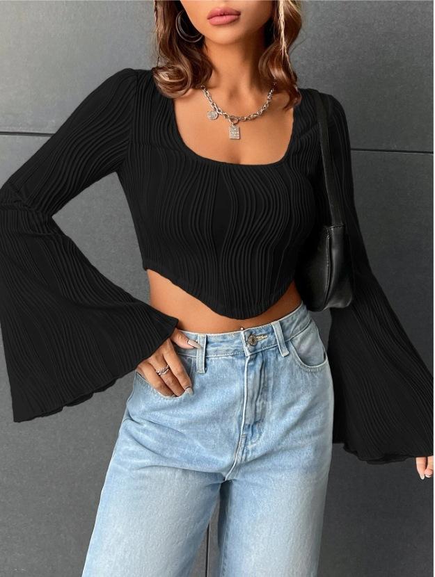 Ropa de mujer transfronteriza de Amazon, verano 2024, top fino con cuello en U, estampado de ondas de agua, corte entallado, camiseta de manga larga acampanada hasta el ombligo para mujer